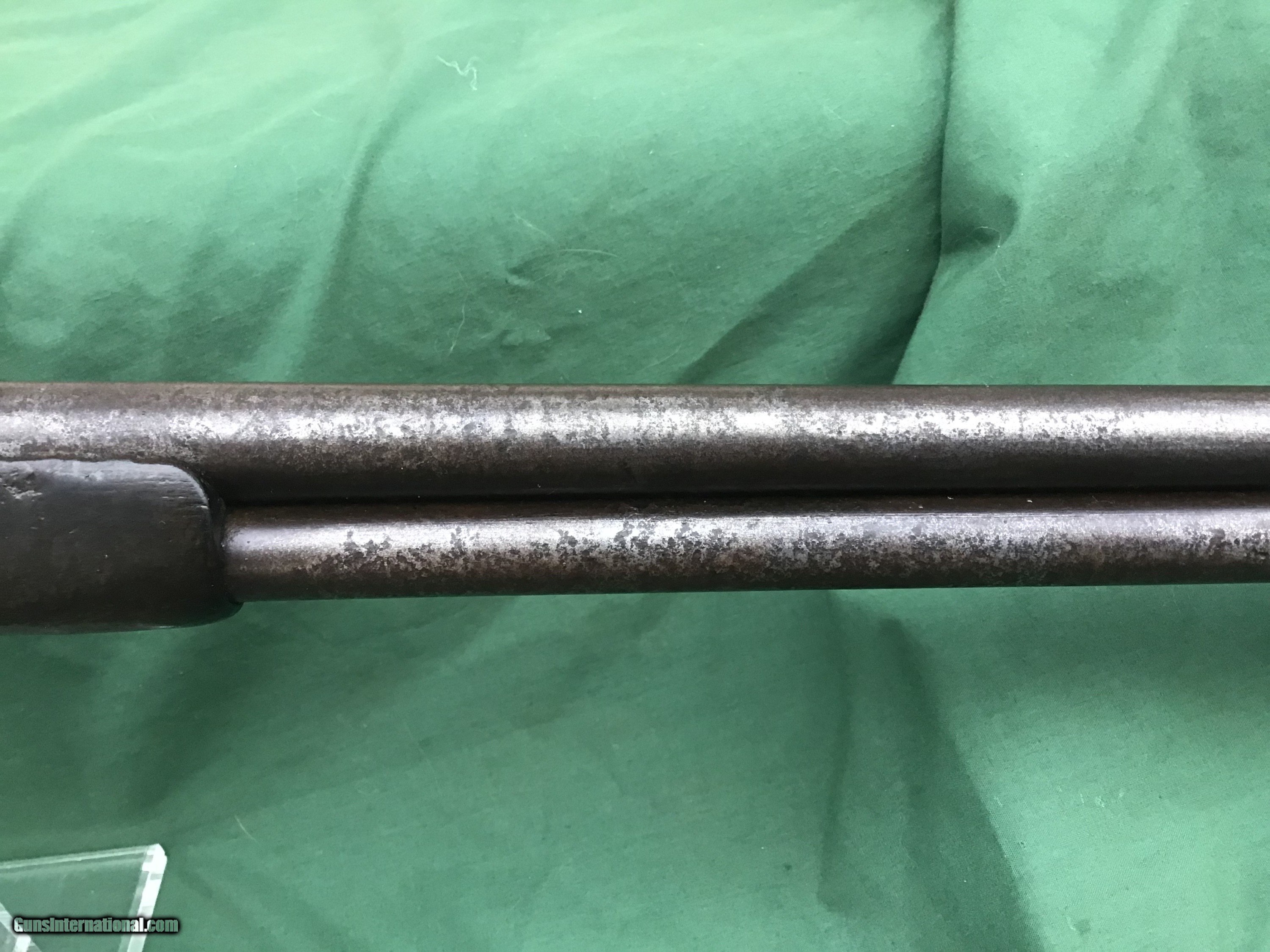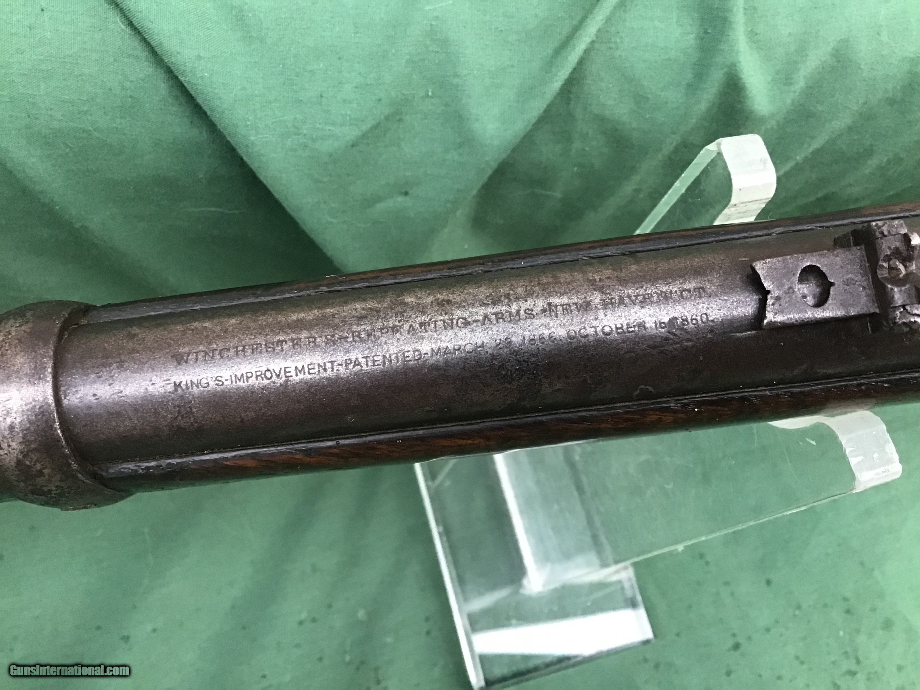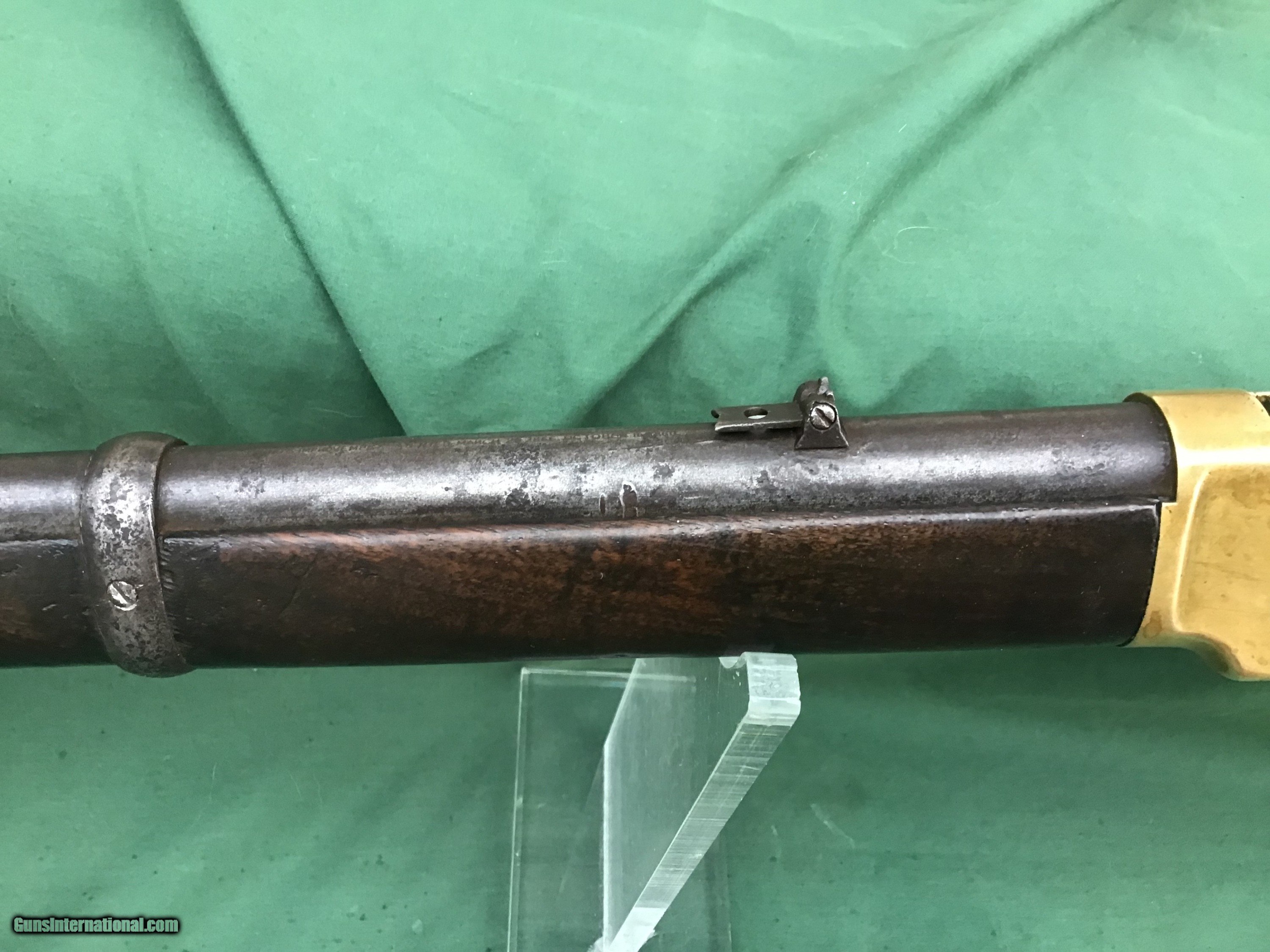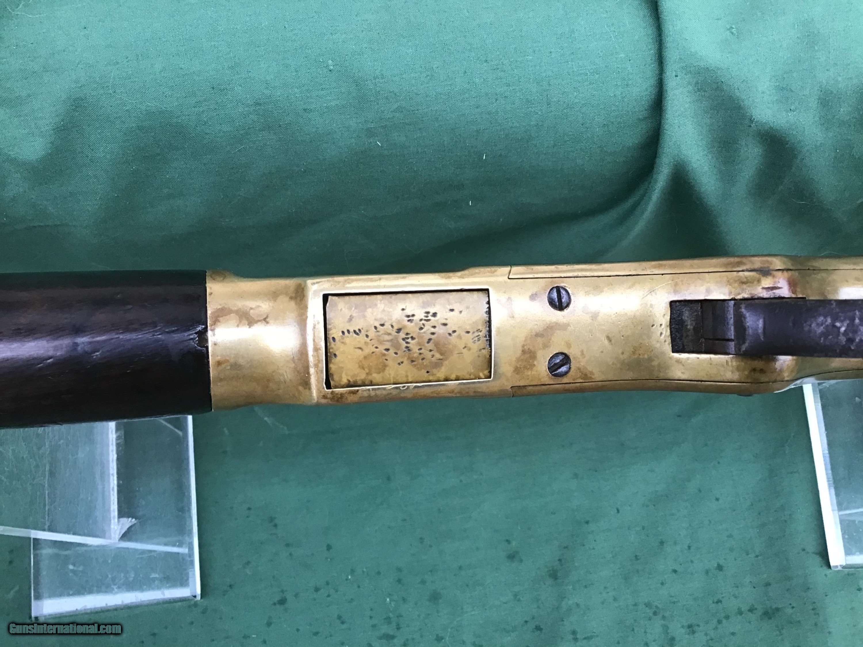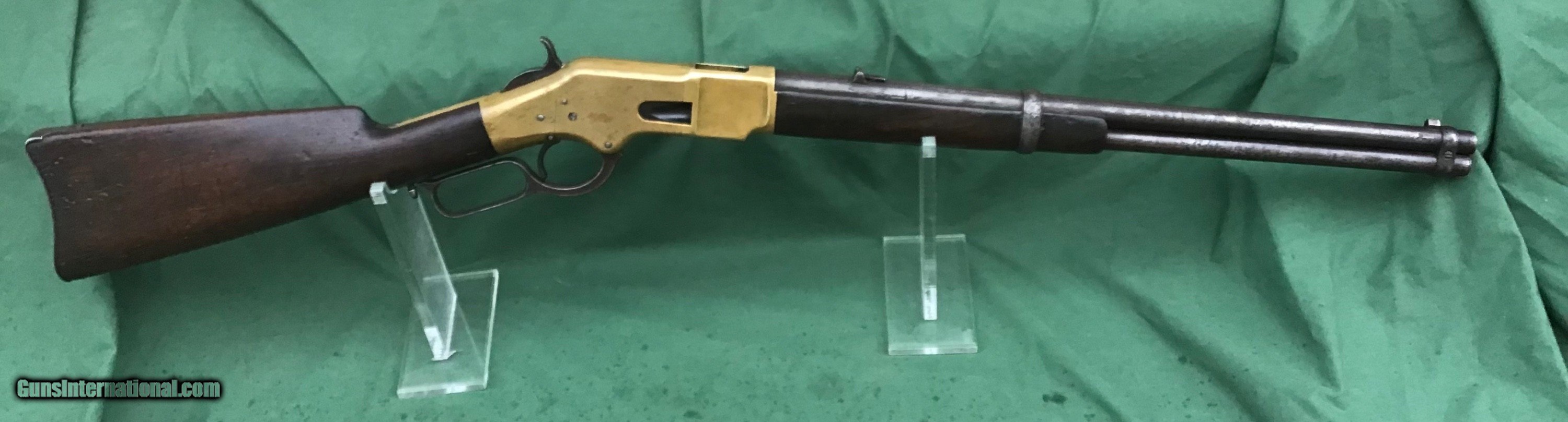 Description: Very late 1866 Winchester Saddle Ring Carbine manufactured in 1891. This carbine left the factory as a Centerfire in 44-40. 20" barrel and full magazine tube retain no original blue just a gray / brown patina and areas of pitting. I will rate the bore a 5 on a scale from 1 to 10. Barrel address is still very legible. Nice earlier rear carbine sight. Brass receiver shows it's age with a nice patina. Action functions nicely. Both forend and buttstock are in good condition showing the normal handling marks that you would expect to see from a firearm of this age. Assembly numbers match tang and buttstock. All in all a good used late Centerfire 1866 Winchester SRC. It's getting harder and harder to find 66 Rifles or Carbines so don't miss out on this one. Please feel free to ask questions. SOLD Antique: Yes |