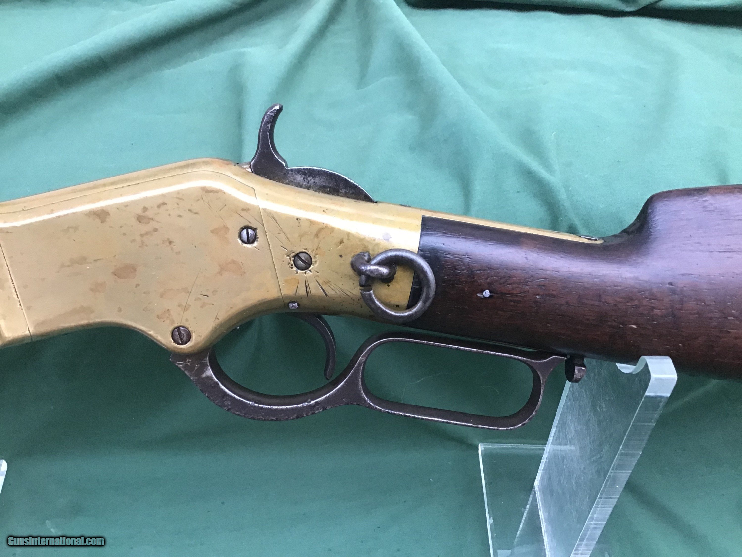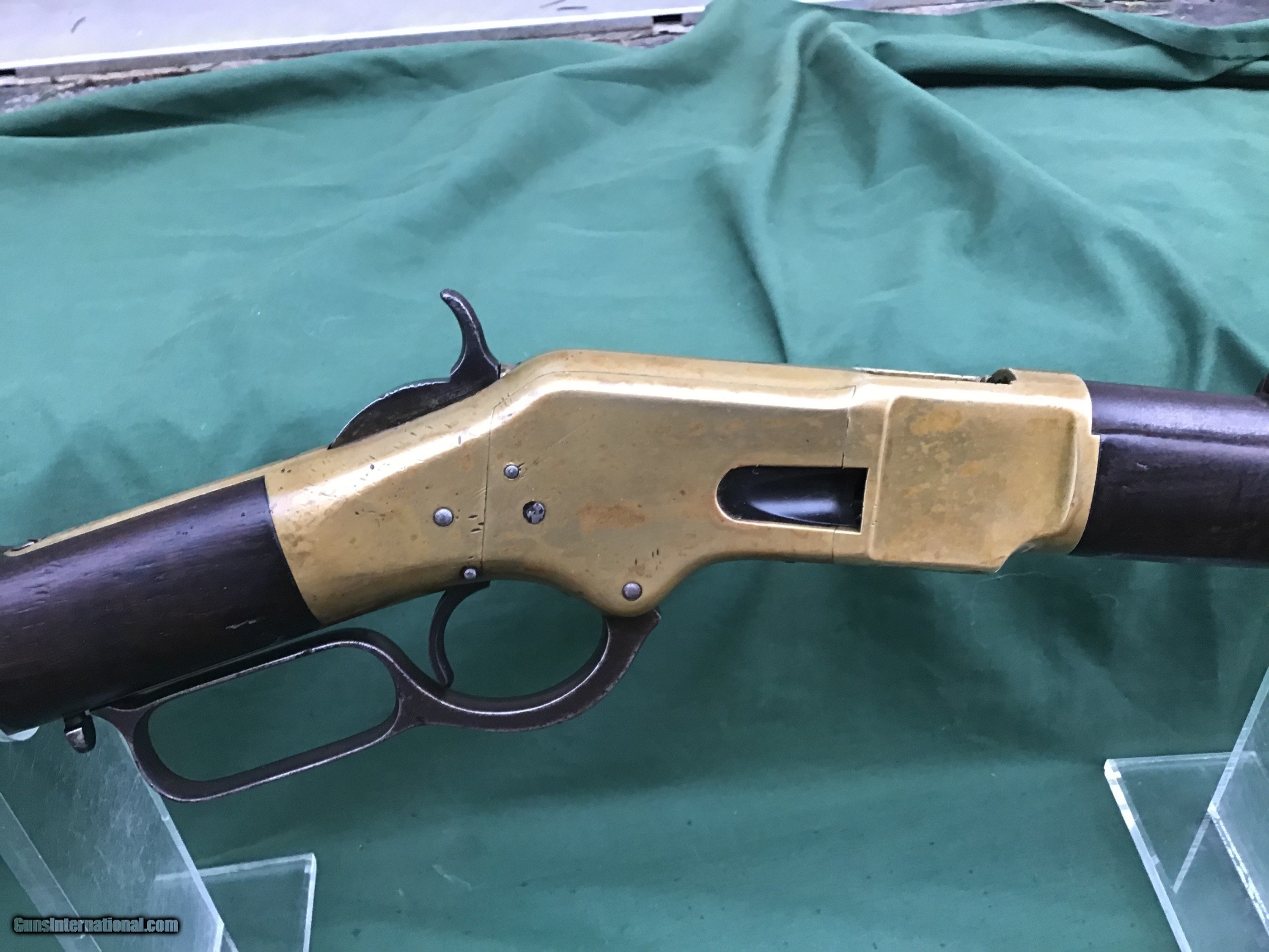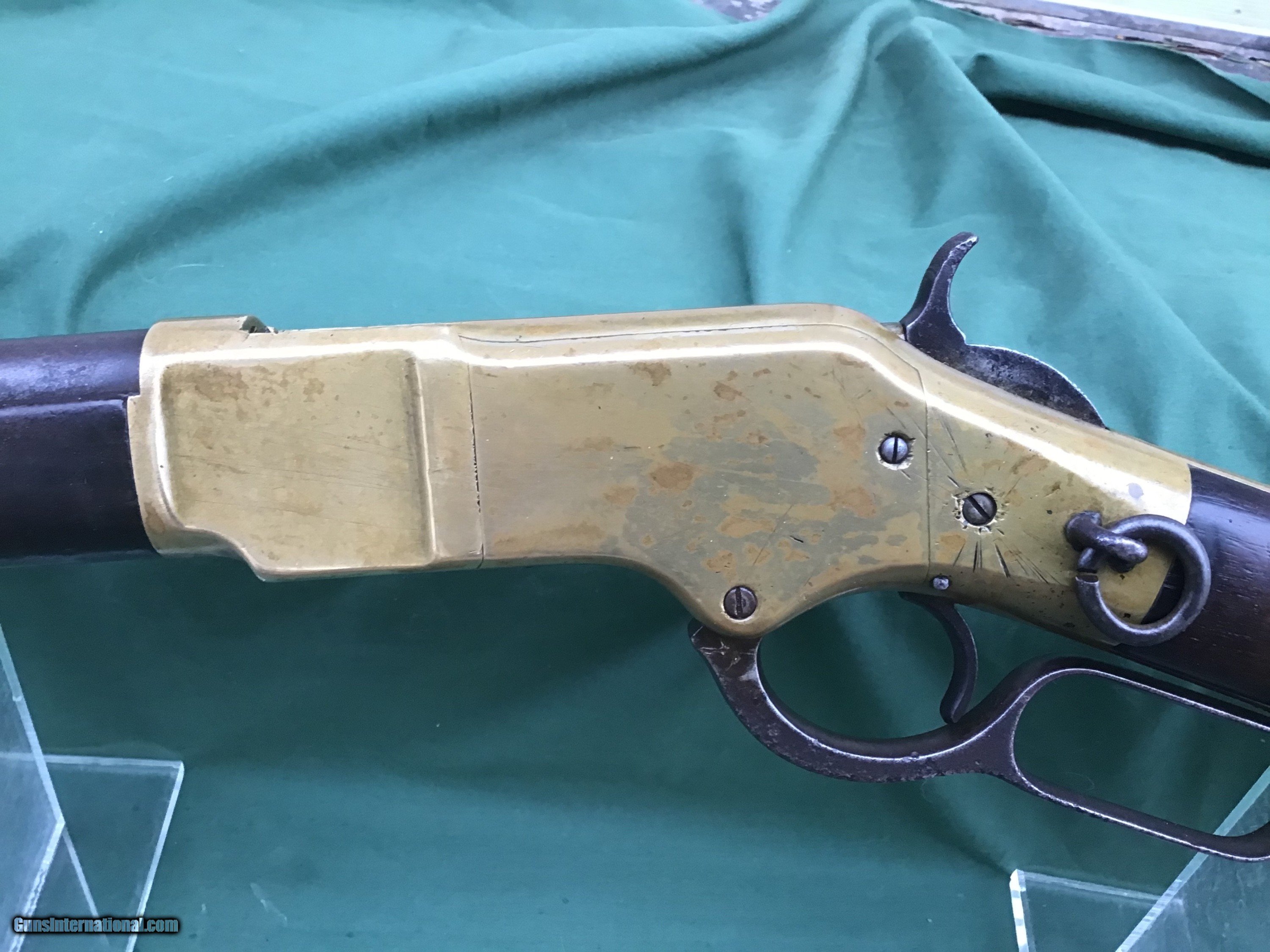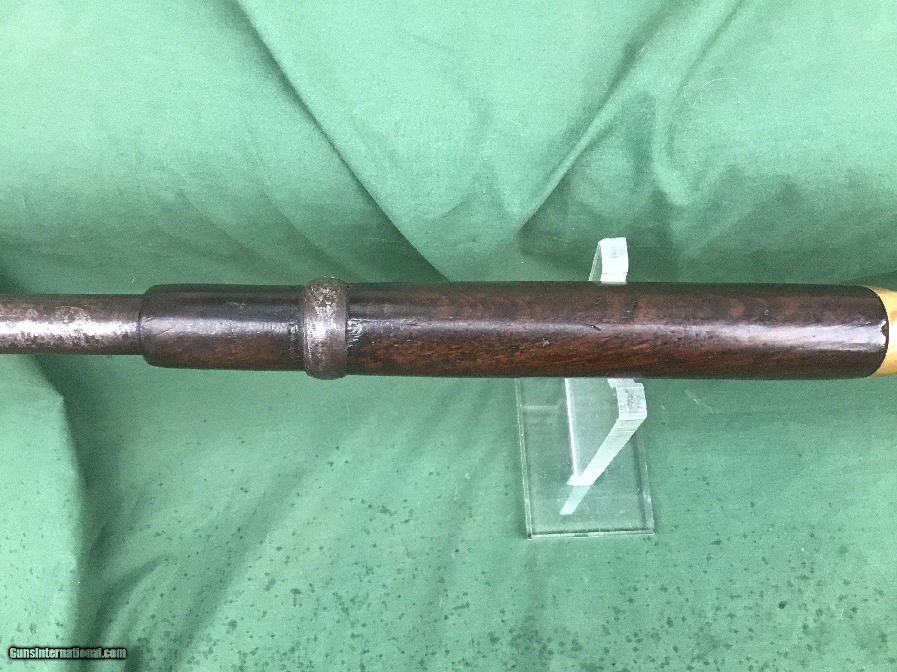 Description: Very late 1866 Winchester Saddle Ring Carbine manufactured in 1891. This carbine left the factory as a Centerfire in 44-40. 20" barrel and full magazine tube retain no original blue just a gray / brown patina and areas of pitting. I will rate the bore a 5 on a scale from 1 to 10. Barrel address is still very legible. Nice earlier rear carbine sight. Brass receiver shows it's age with a nice patina. Action functions nicely. Both forend and buttstock are in good condition showing the normal handling marks that you would expect to see from a firearm of this age. Assembly numbers match tang and buttstock. All in all a good used late Centerfire 1866 Winchester SRC. It's getting harder and harder to find 66 Rifles or Carbines so don't miss out on this one. Please feel free to ask questions. SOLD Antique: Yes |