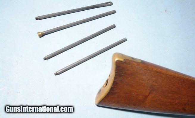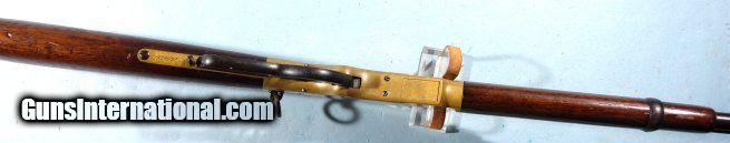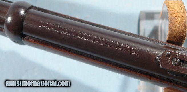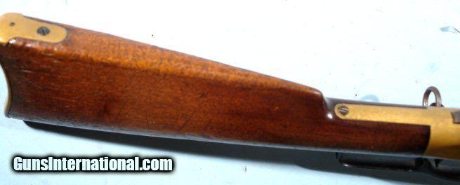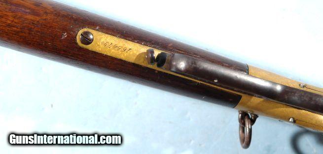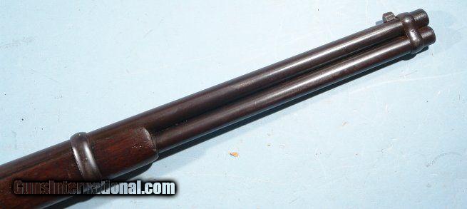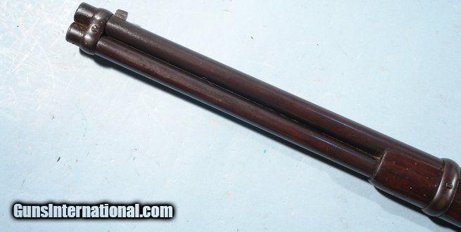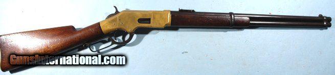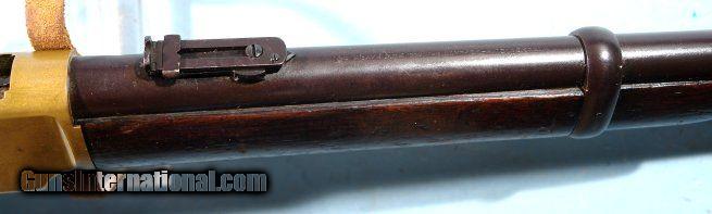 Description: EXCELLENT WINCHESTER MODEL 1866 LEVER ACTION .44 HENRY RF CAL. SADDLE RING CARBINE CA. 1880’S. 20” barrel with very crisp ‘WINCHESTER REPEATING ARMS. NEW HAVEN, CT.” address and 1860 and 1866 patent dates. Stamped behind rear sight “44 CAL”. 100% original and matching in excellent plus original condition. Beautiful brass frame and carbine butt plate with lovely original unpolished patina showing little wear. Approximately 80-90% original blue on the barrel and magazine tube with slightly less on the lever, barrel bands and rear sight. Balance of finish an even mixed original patina. Even the screws have some original blue finish. Loading gate and hammer with approximately 70% blue with the balance even dark patina. Very good to fine stock and forend with the original finish showing moderate use. Good bore and rifling and perfect working order. Original cleaning rod in butt trap. With Winchester factory records letter. Really nice example. SOLD Antique: Yes |