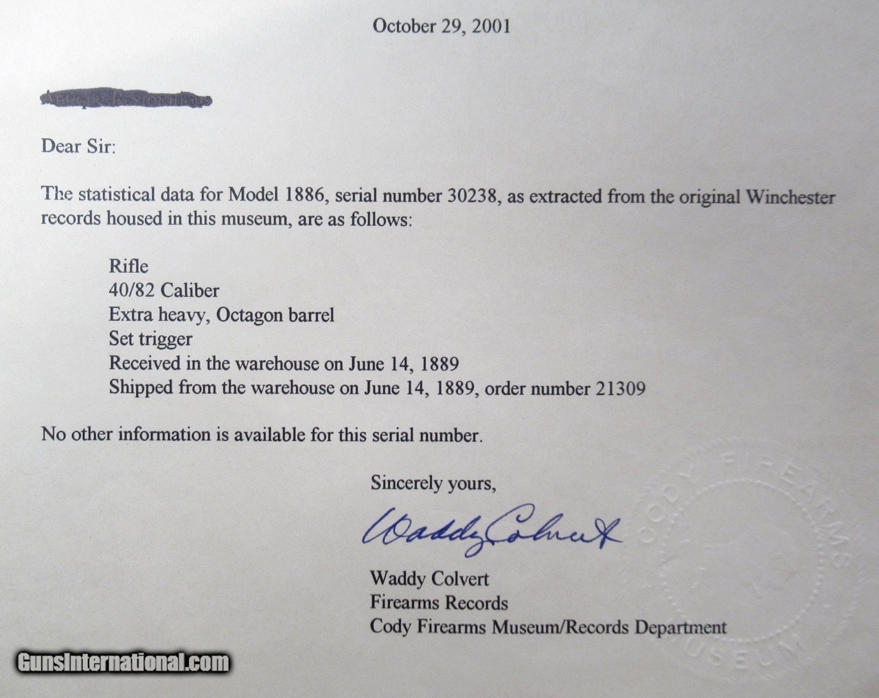 Description: Winchester Model 1886; Serial No. 30238; 40/82 cal.; 26” Extra Heavy Octagon Barrel; Set trigger; Factory Letter; Shipped June 14, 1889; PERFECT Action; Good Shiny Strong Bore with only minor flaws; lots of Original Blue on Metal; some Case Colors on frame; metal has scattered light pitting; Good Solid Wood with Original Varnish; RARE 130 Year-Old Winchester; antique, no FFL/C&R required for shipping; Price Includes Insured Shipping; Attention Texas Buyers: We Must Collect 6.75% Sales Tax; SOLD Antique: Yes Manufacturer: Winchester Model: 1886 Serial Number: 30238 |