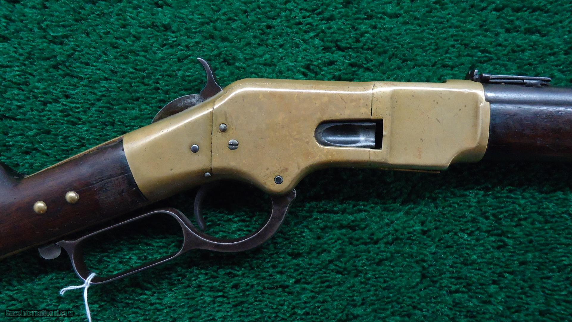 Description: 44 RF cal. Standard configuration 20 inch barrel with full magazine. Brass frame. Carbine butt stock. Barrel and mag tube have turned a chocolate brown patina. Bore is not the worst I have ever seen, but is not bad for an 1866. Rear sight has been replaced with an 1873 marked ladder sight very long ago. Front is original. Brass has a natural antique patina to it. Wood is a little shy around the tangs and is a bit ill fitting. The usual small crack in the front of the forearm. Brass tacks match the brass receiver patina. Original saddle ring is present. Action could use a tune up. This carbine was made in early 1883. A nice display Winchester. Leroy Merz Antique Firearms specializes in antique and vintage Winchesters and other fine American firearms. Since 1965 Mr. Merz has taken part in the world of firearms and has been a contributor to many well known reference books. Just recently we mailed the 126th edition of our privately-published catalog. We have hundreds of additional guns in every price range at our home online. Search for Merz Antiques in google. SOLD Antique: Yes |