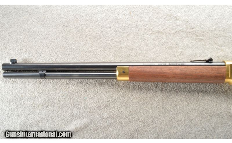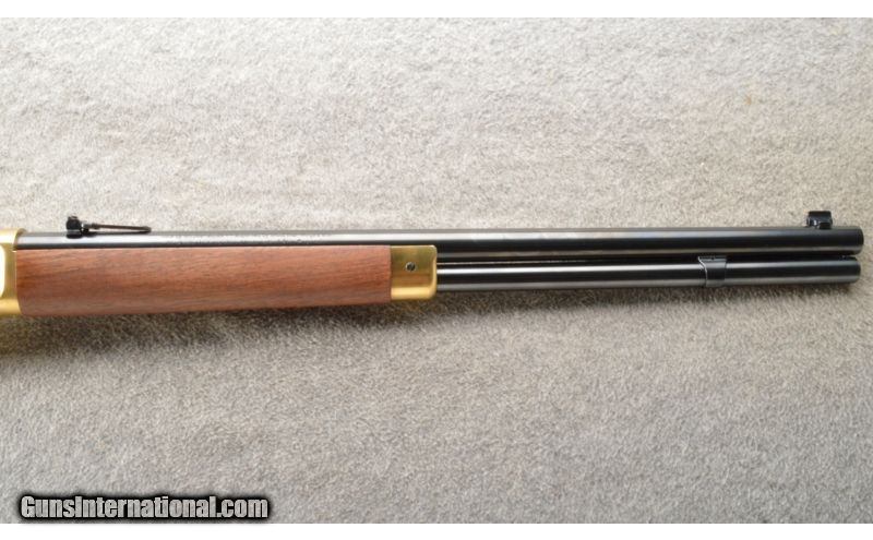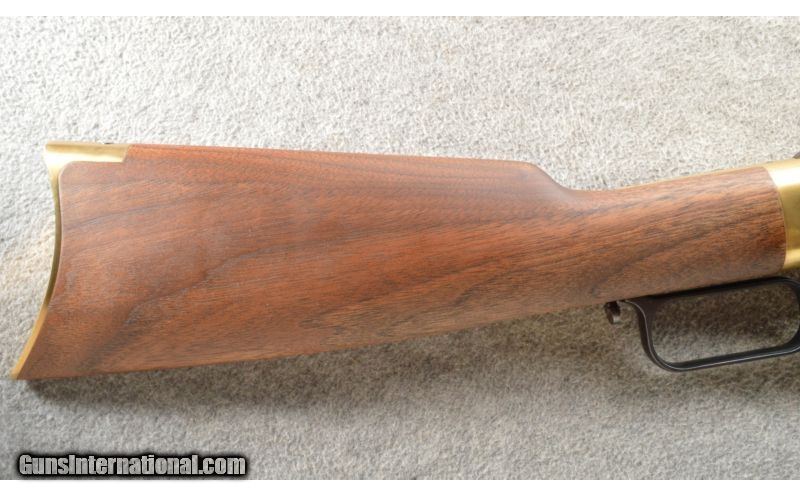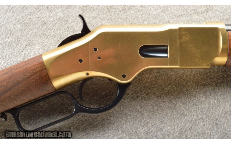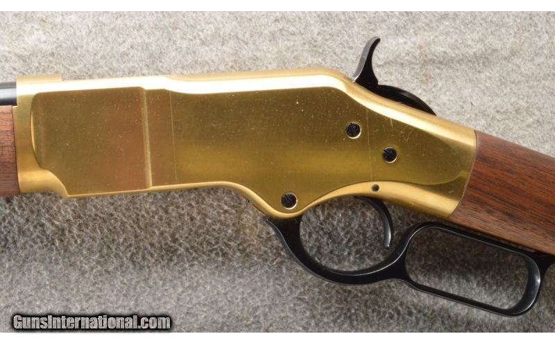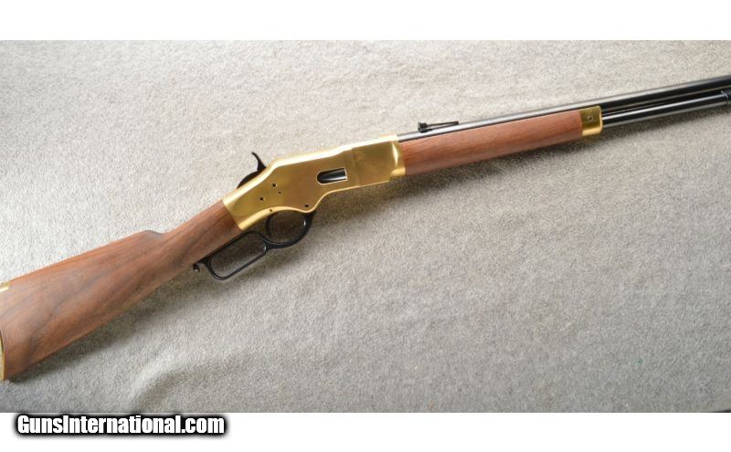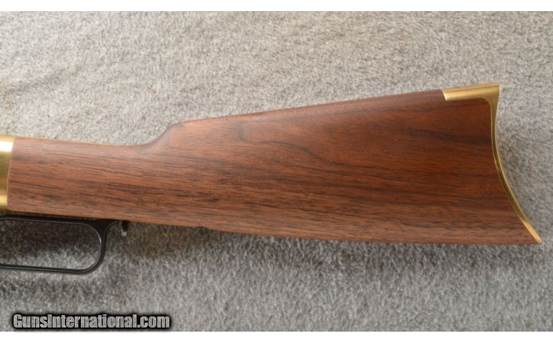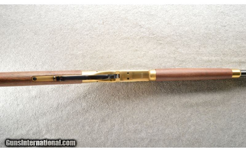 Description: This is a hard to find Winchester model 1866 second generation rifle. The rifle is a newer production and is chambered in .38 Special. This nice little rifle has a brass frame, butt plate and forearm cap with the rest of the metal being a nice semi-gloss blue. The walnut stock and matching forearm are new looking with a satin finish. The rifle does not look like it has been fired outside of the factory but it is hard to tell. SOLD Manufacturer: Newer production. Caliber Info: .38 Special. Chambers: Lever action repeater. Metal Condition: As new. Wood Condition: As new. Bore Condition: As new. Barrels: 20 inch blue with sights. Triggers: Single blue. Stock: Nice mid grade walnut with a straight grip. Stock Dimensions: 12 5/8 inch LOP. Fore End: Matching walnut with a brass cap. Butt Pad: Crescent brass. Weight: 7 Lbs. 13 Oz. Sights: Adjustable rear ladder and a blade with gold bead front. Extras: Comes with the factory box. Item Location: Owatonna, MN |
