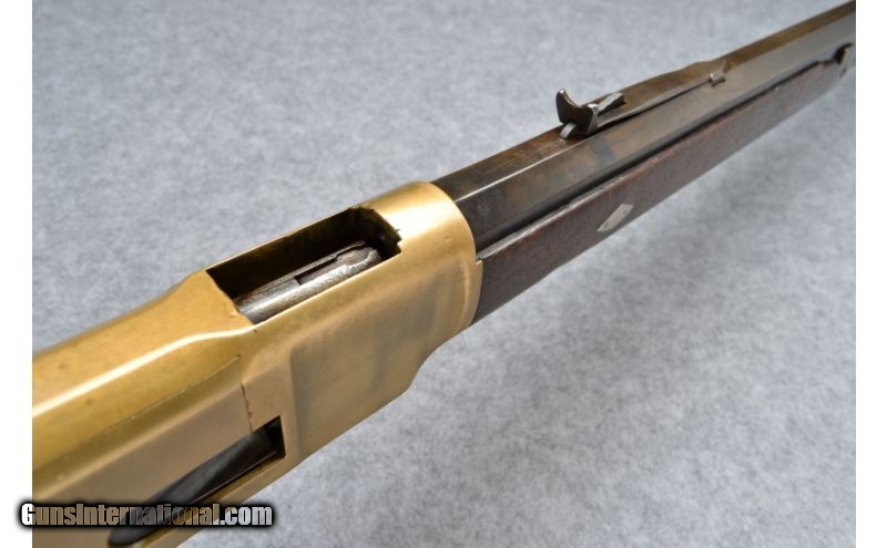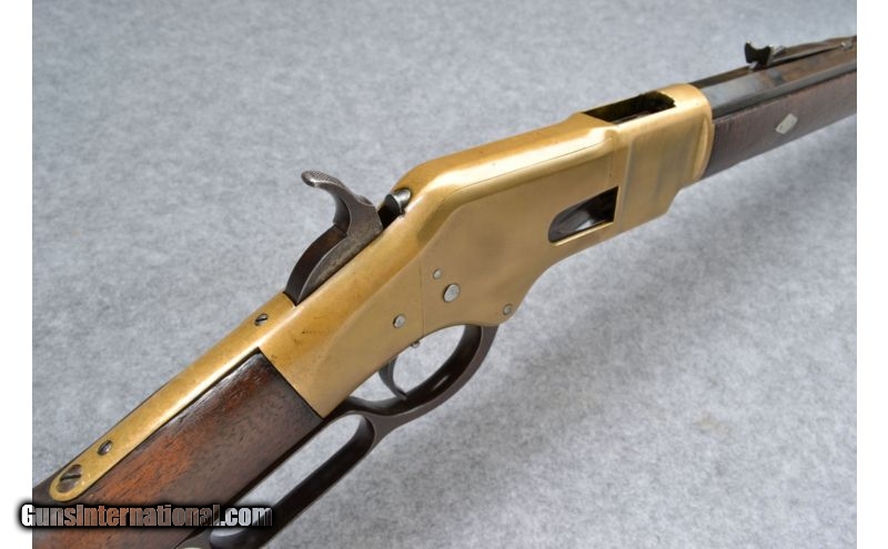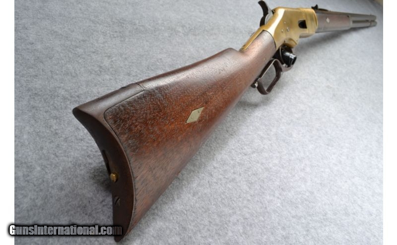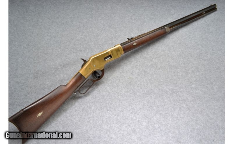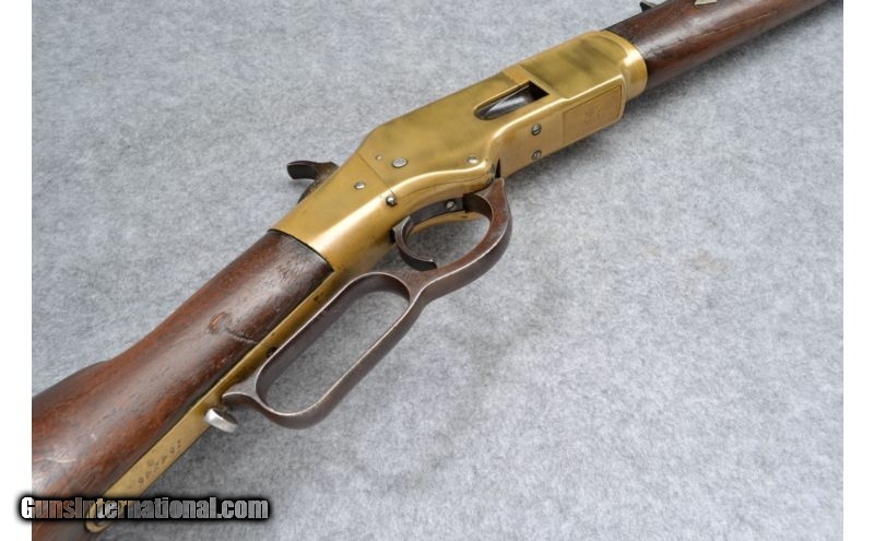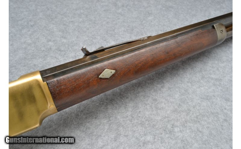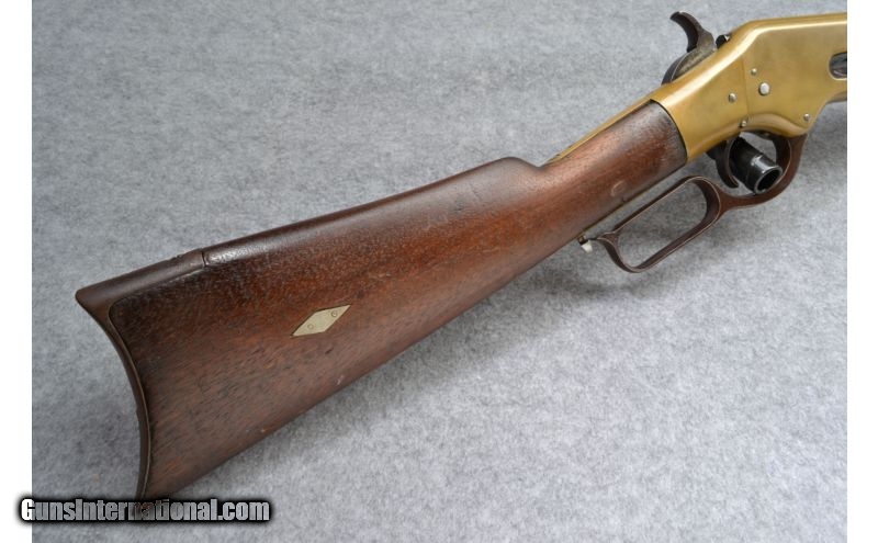 Description: Winchester 1866 .44 rimfire with octagon barrel. The wood has nickel hearts and diamonds inlaid and an opening for a patch box in the butt stock. SOLD Manufacturer: 1883 Caliber Info: .44 Rimfire Metal Condition: Brass frame with scratches and dents. barrel engraving faint, appears to be old rebluing Wood Condition: Scatches, dents with cracks in stock and forearm Bore Condition: Dark bore sharp rifling with some pitting Barrels: 24 inch Octagon Triggers: Single Stock: Wood Fore End: Wood, cracked bottom, see picture 14 Butt Pad: Crescent Steel with opening for patch box Weight: 8 Pounds 10 Ounces Sights: Blade and buckhorn sights Item Location: Fort Mill, SC |