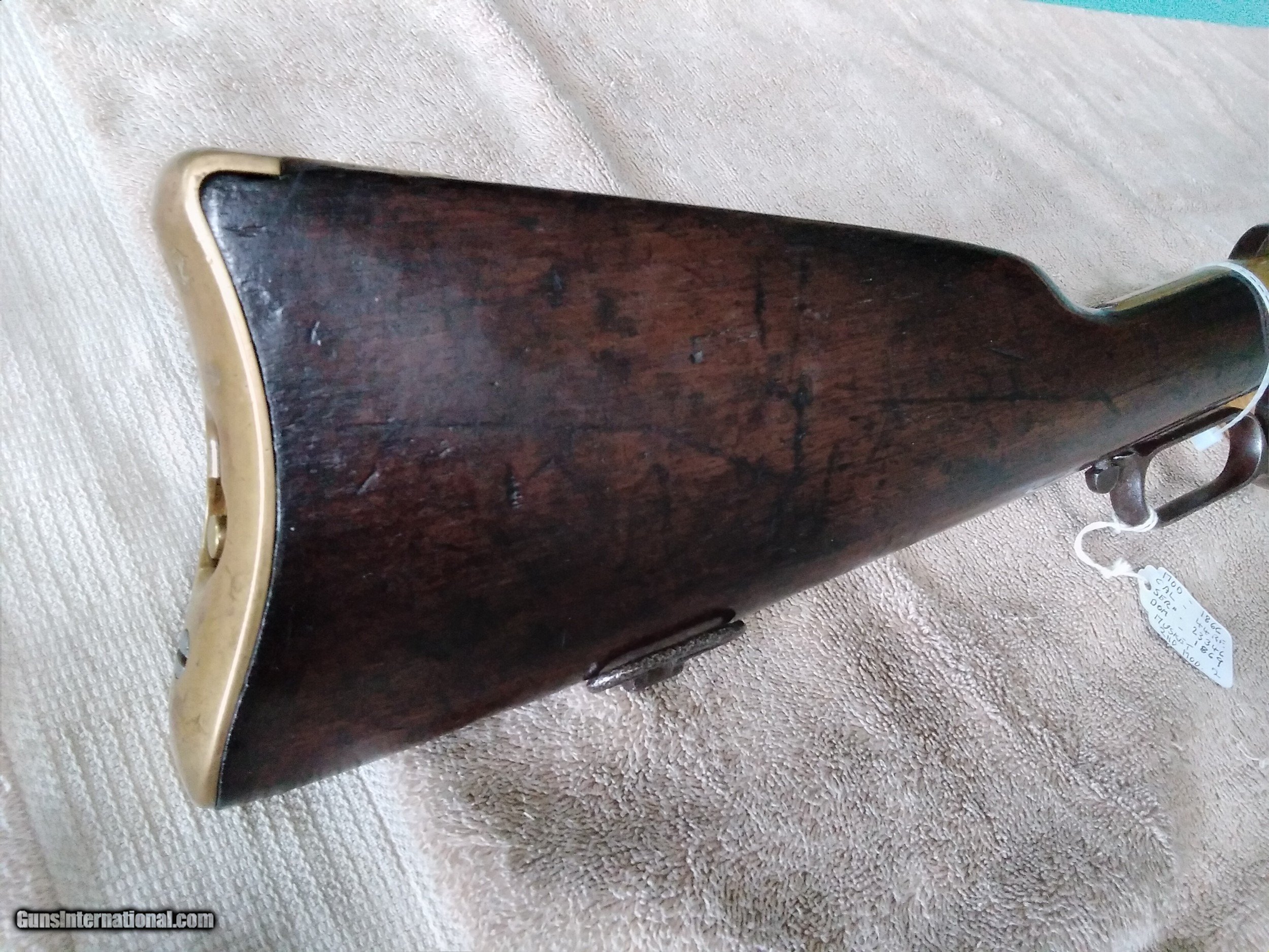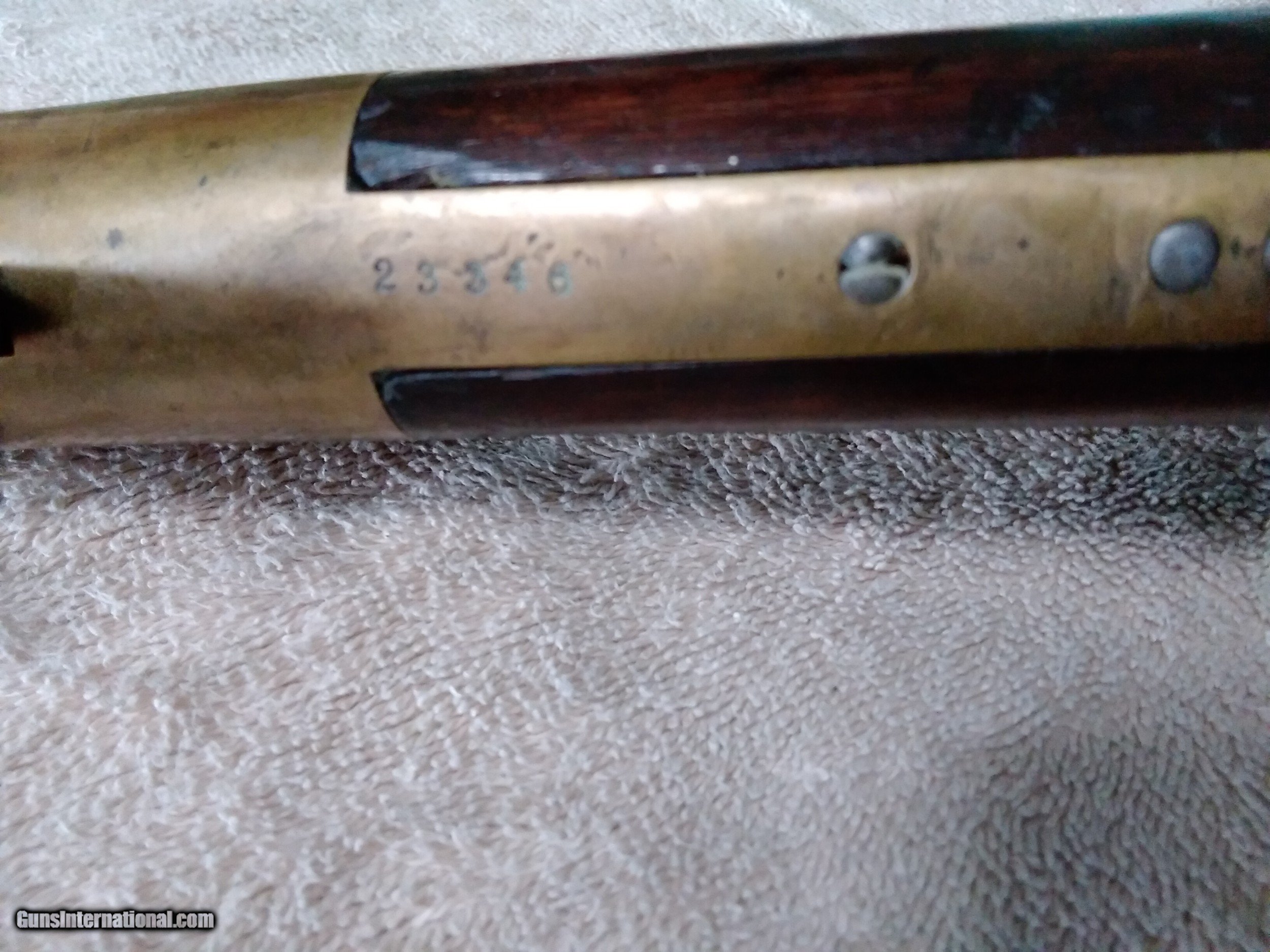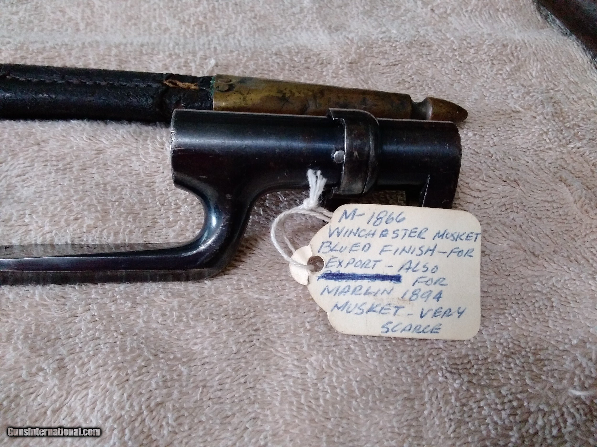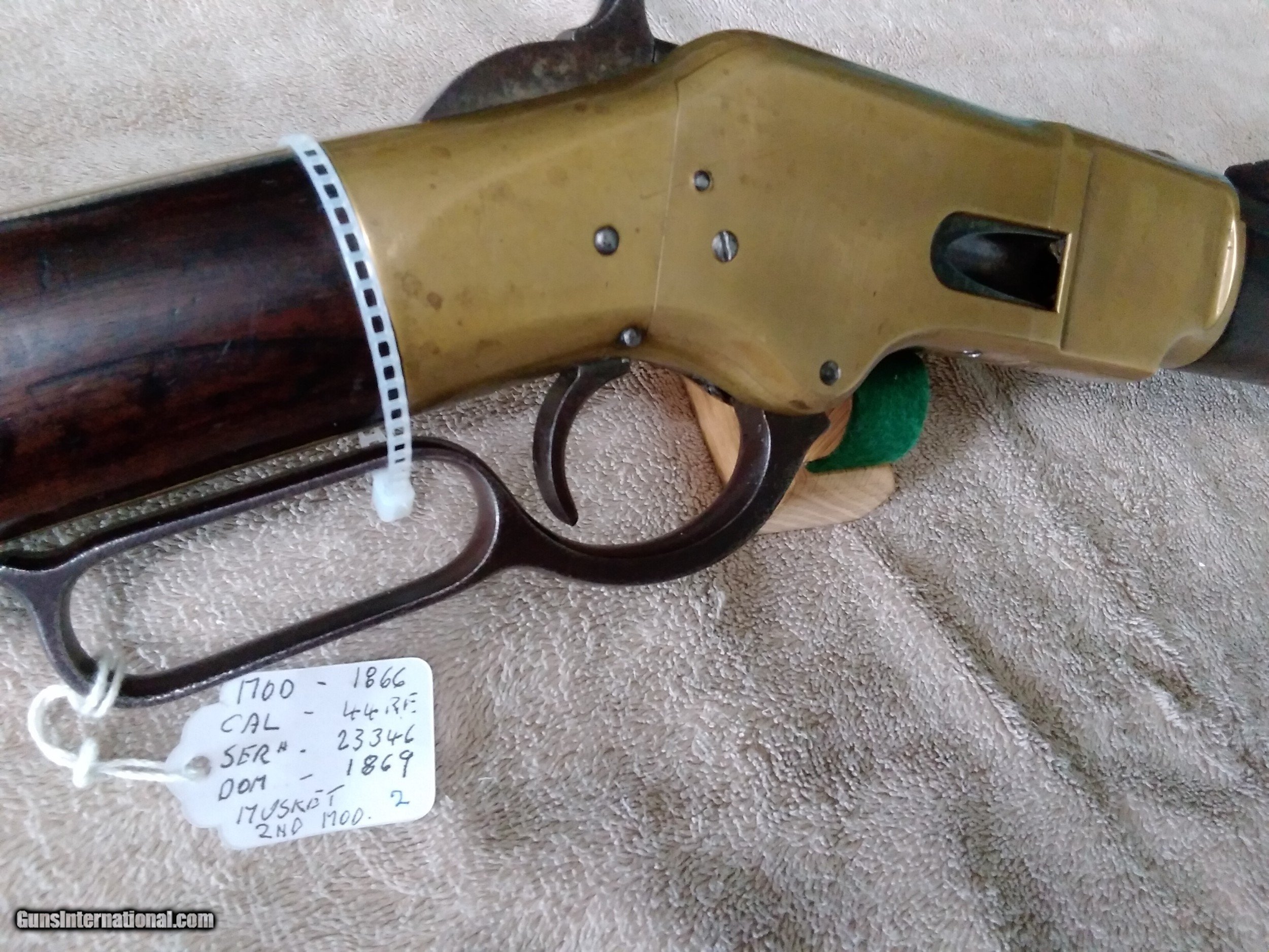Description: SOLDI am offering My 4 brass guns for sale. This is My Winchester 1866 musket ser#23346 mfg'd in 1869. The gun is in very good condition and way above average. The metal has turned to brown patina. The brass is excellent mustard yellow and the wood is excellent with no cracks or gouges normally found on these old muskets. The included bayonet is in pristine cond.. The bore is excellent. The rear sight is a replacement.. A fine old '66 musket very reasonably priced at $6500.00 shipped to Your door. More pics if needed. Call Harry 519-522-1764 SOLD Antique: Yes Rifle Caliber: .44 Henry Manufacturer: Winchester Model: 1866 Serial Number: 23346 Barrel Length: 27 Condition: exc. Metal Condition: exc. Wood Condition: exc. Bore Condition: very good Barrel Type: round Action: tight Manufacture Date: 1869 Extras: bayonet/scabbord |