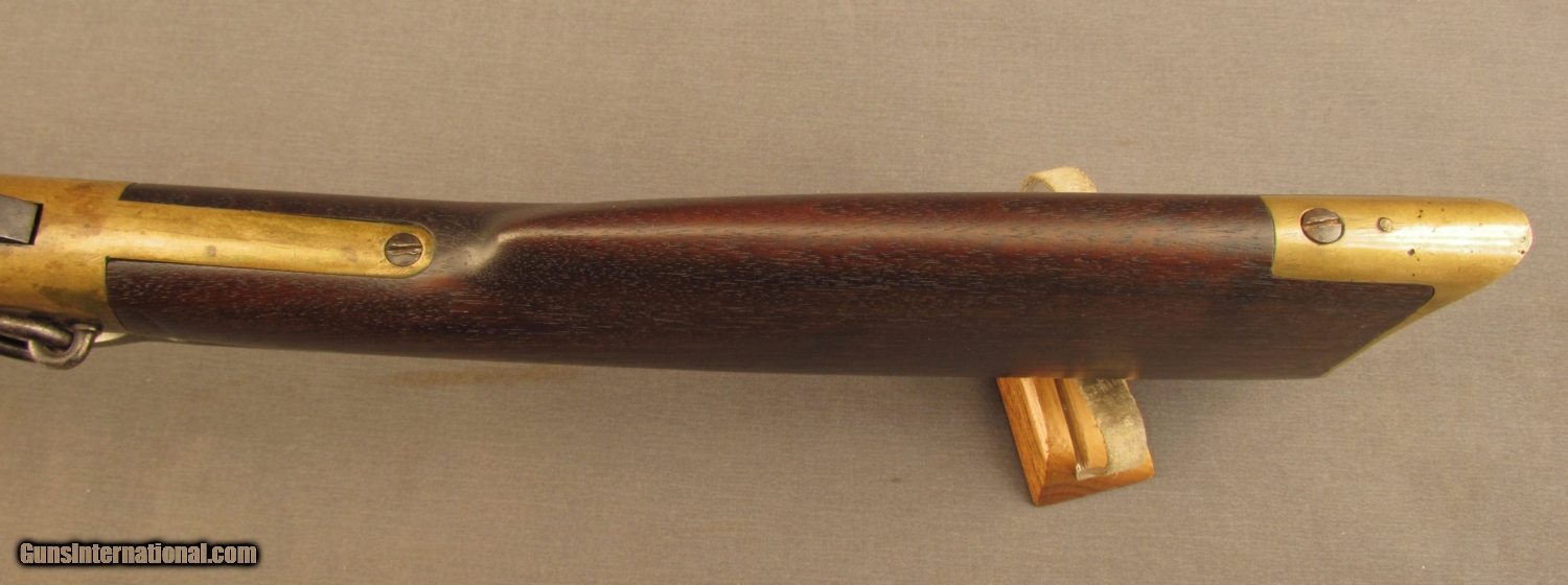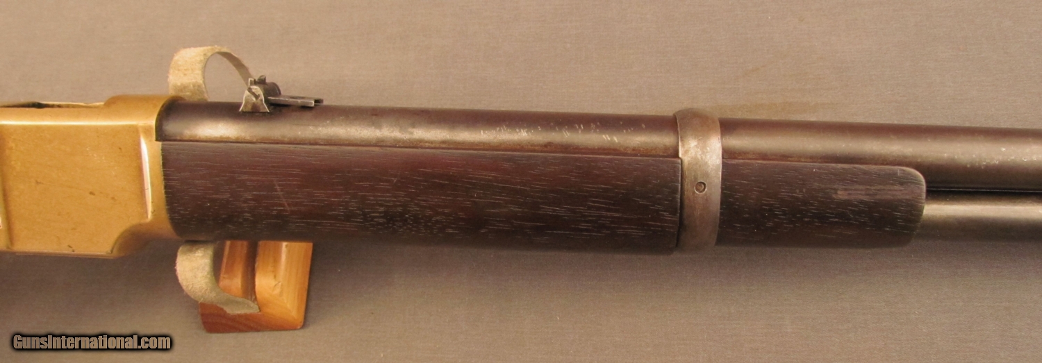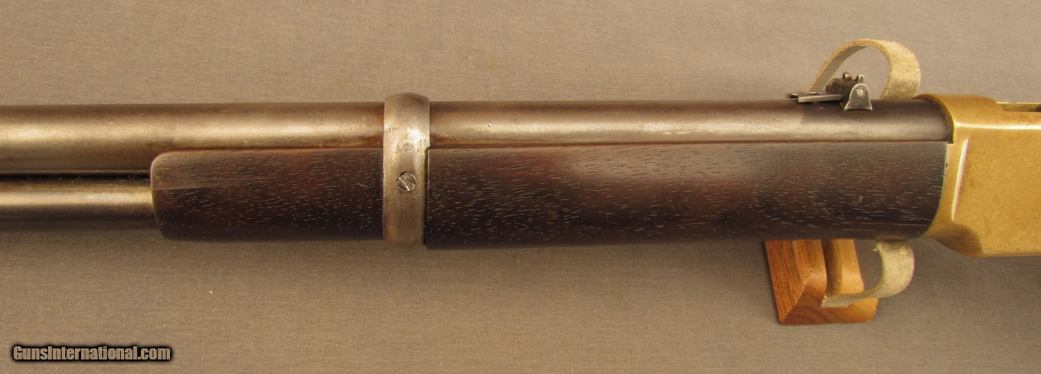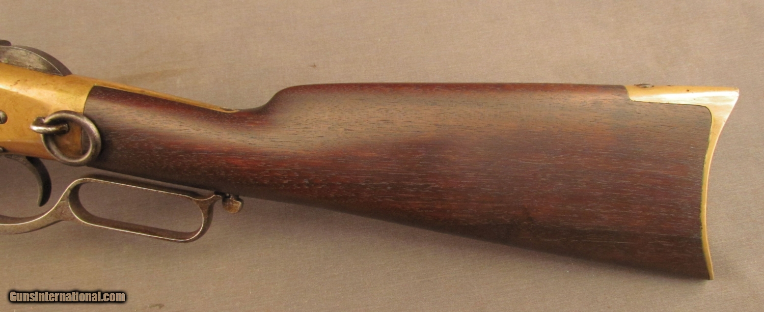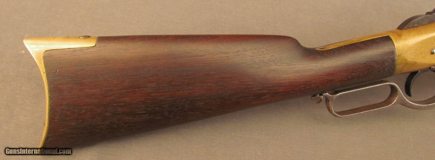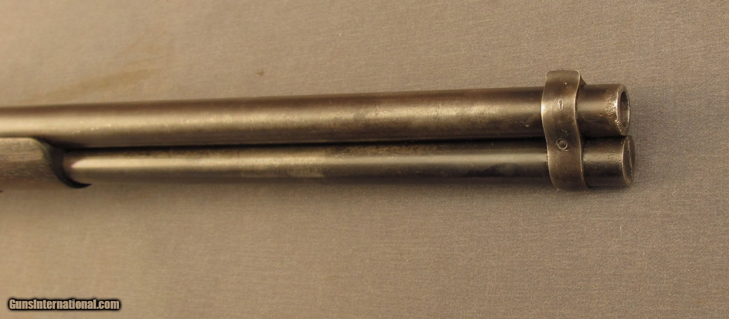 Description: S# 23387 , .44 rimfire, 20 inch barrel, good bore with strong rifling and areas of erosion. This 1869 built carbine remains in excellent condition with an attractive dark patina on the action and butplate. barrel and mag tube have developed a drk patina with traces of blue in protected areas. Barrel shows a bright spot on right side by action from carry wear. Lever has a mottled grey patina with light pitting. Wood has a nice dark OK finish with a few scattered light marks. Butstock and butplate numbers match gun. Features include small loop lever, first style short wrist butstock with early style door in butplate(brass pin), old style hammer (no half cock notch), third style barrel marking , long forend, flat crown muzzle, and first type front band with integral sight. A fine example of a late second model 1866 SRC with a great untouched look. Antique SOLD Antique: Yes Manufacturer: Winchester Model: 1866 Serial Number: 23387 Caliber Info: .44 RF Gauge Info: .44 RF |