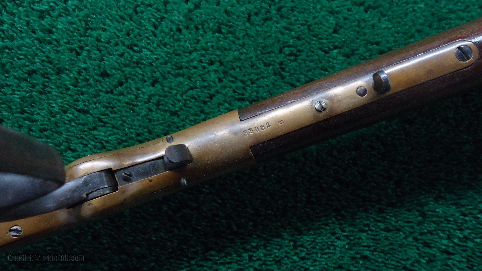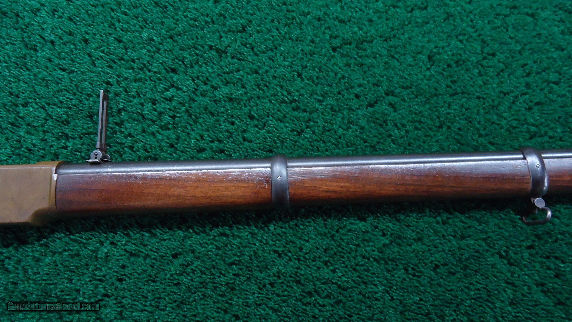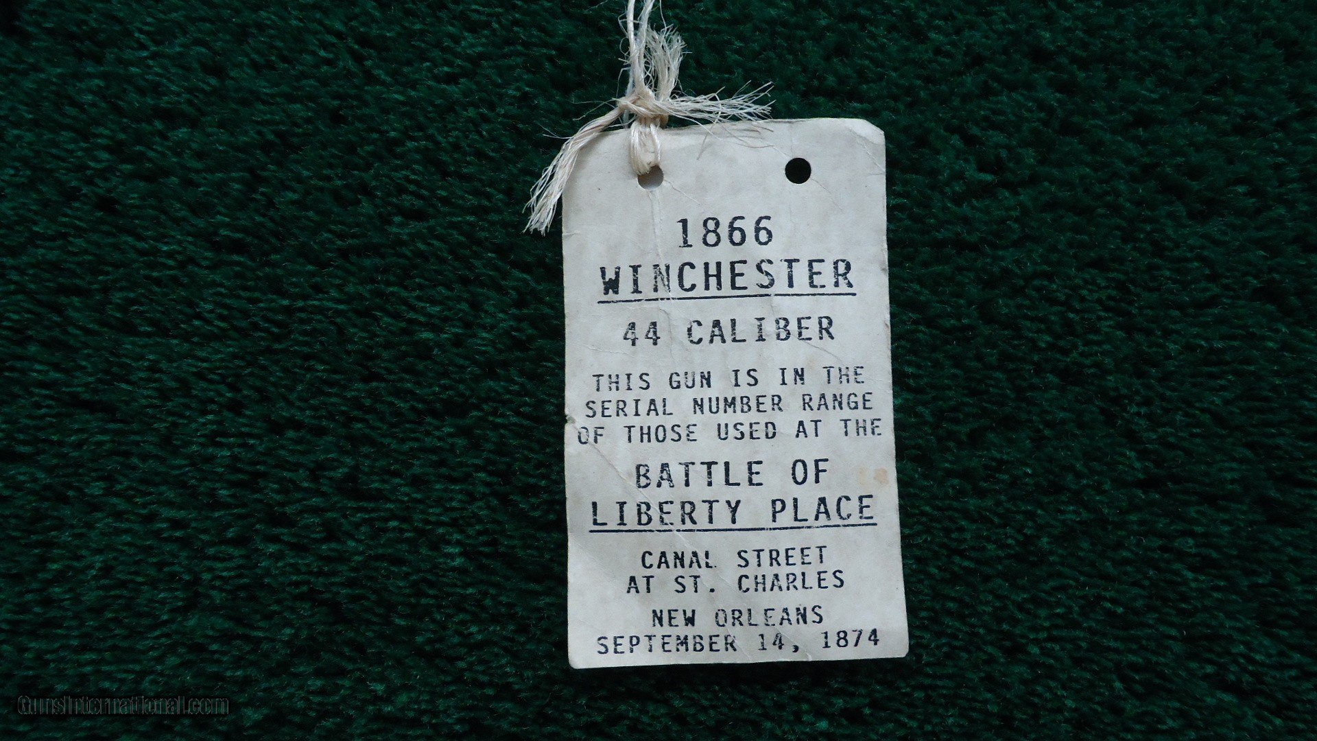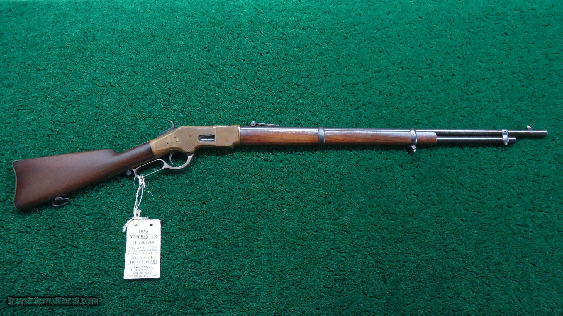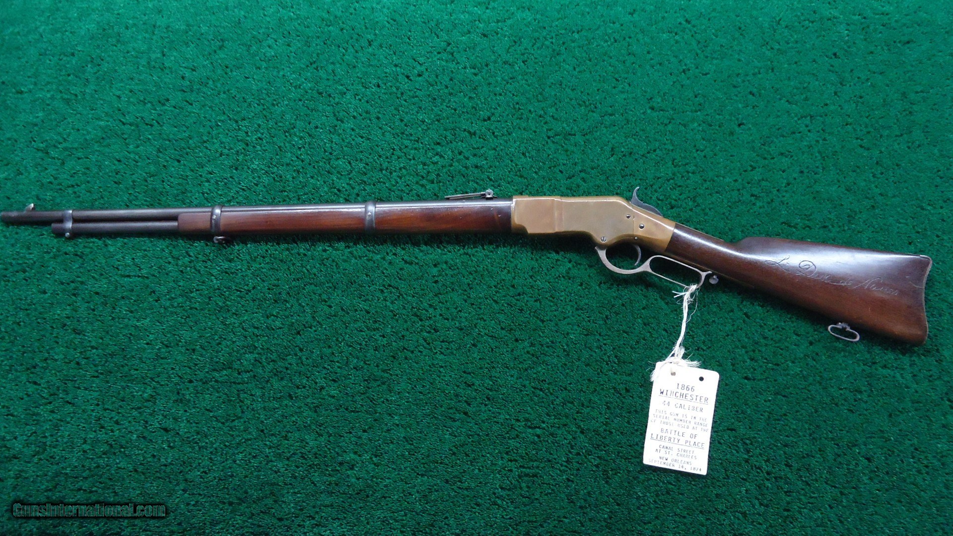 Description: Serial number 33082 which falls right in the middle of a group of muskets identified as being possible weapons used in the Battle of Liberty Place September 1874. 27 inch round barrel chambered in 44 RFwith 24 inch mag tube and musket style long forearm wood. The barrel and mag tube are a blue/brown color with some roughness at the muzzle. Sights include post front sight and ladder rear sight. Receiver is a deep mustard color in good overall condition with dings and dents. Wood is in good overall condition with of the period carving on the left side of butt "Le Duc de Hanes". Sling swivels are present. A good looking 1866. Leroy Merz Antique Firearms specializes in antique and vintage Winchesters and other fine American firearms. Since 1965 Mr. Merz has taken part in the world of firearms and has been a contributor to many well known reference books. We have hundreds of additional guns in every price range at our home online. Search for Merz Antiques in google. SOLD Antique: Yes Rifle Caliber: .44 Rimfire |