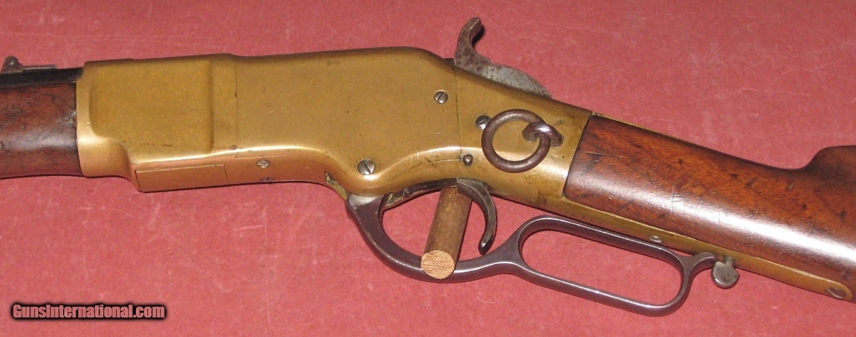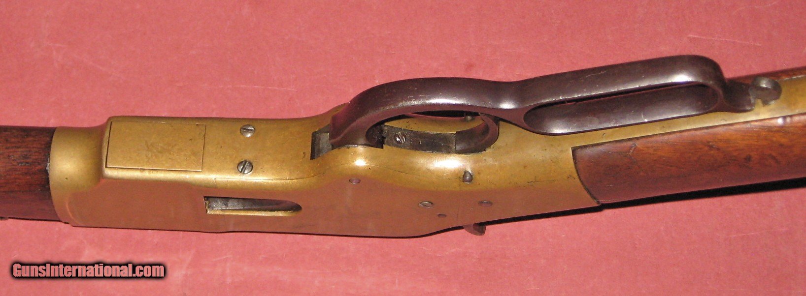 Description: A very nice Winchester model 1866 saddle ring carbine.Built in 1870,this rifle is in original condition.It has a 20" barrel with a very good bore with no pitting and good rifling.The barrel still retains around 50% of the original blue and the original flip up sight.The receiver has a nice even brass patina and has not been buffed.The wood has shrunk slightly with age,,but is no cracked or damaged.The lever is smooth and functions perfectly.The rifle is chambered for 44 rimfire.This is a fine example of the early 66 carbine for the Winchester collector.Classified as an antique so it can be shipped direct. SOLD Antique: Yes Manufacturer: Winchester Model: 1866 saddle ring Serial Number: 46164 Caliber Info: 44 rimfire Metal Condition: good Wood Condition: good Bore Condition: good Action: lever Manufacture Date: 1870 |