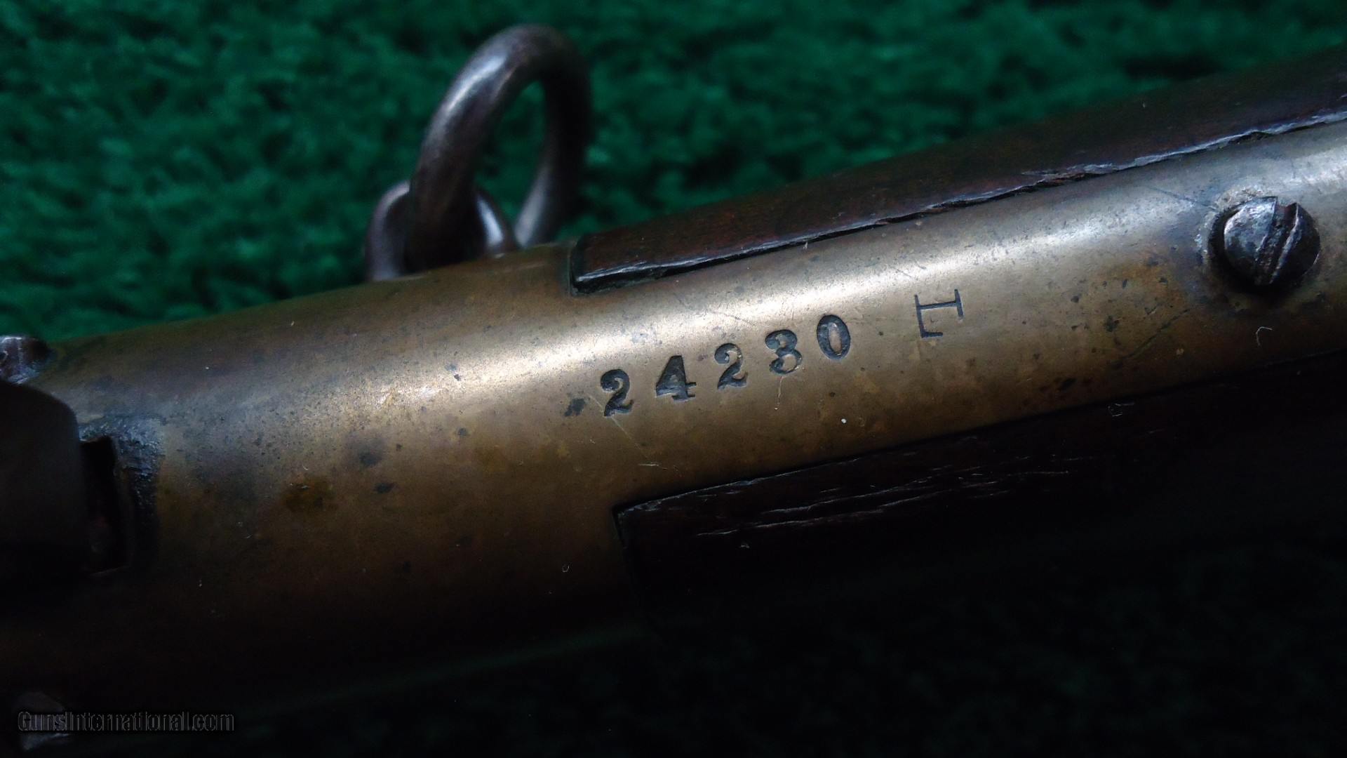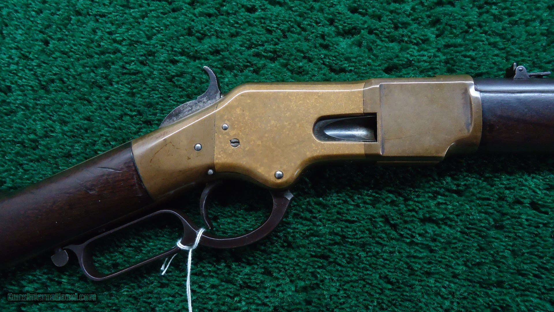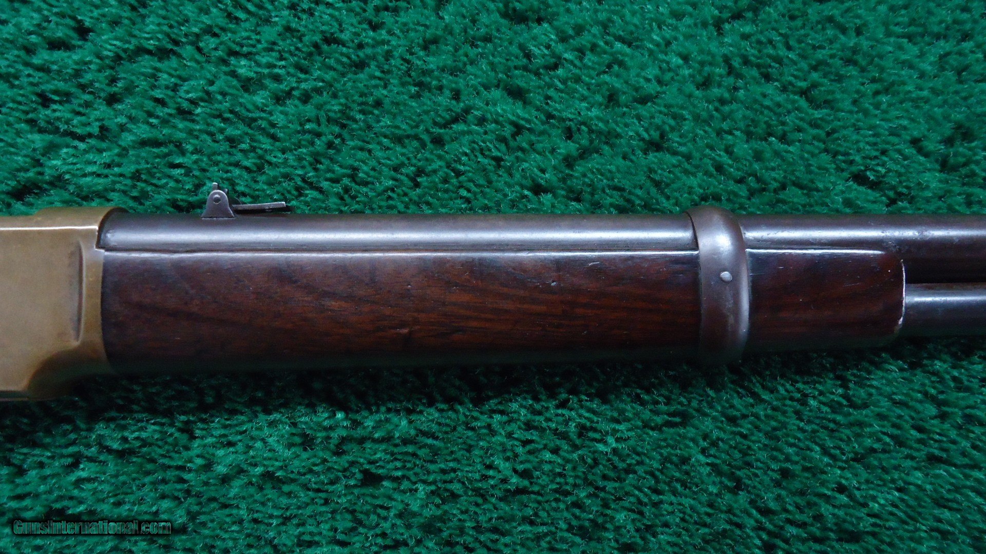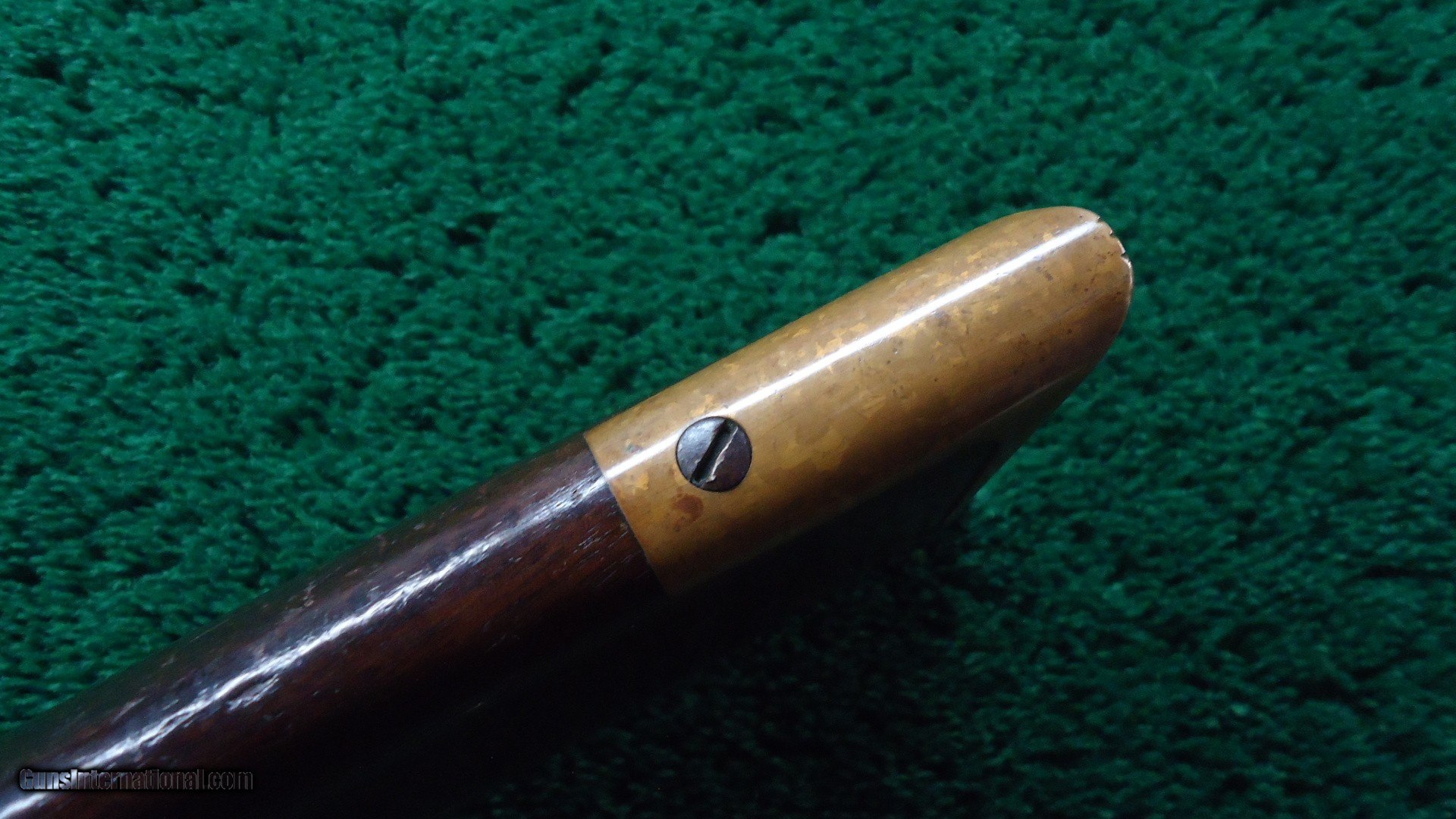 Description: Standard 20 inch carbine configuration in 44 RF caliber with a pleasing dark brown patina on the barrel and magazine tube. Bore has visible rifling with scattered light pitting throughout. Sights include a blade that is integral to the barrel band front and a two leaf folding rear. Receiver has a nice aged brass patina. Lighter colored tight fitting side plates. Original saddle ring. Hammer and lever are mostly a brown color. Walnut stocks look good with some light handling and usage mars with a brass rifle style buttplate. A couple of stress cracks coming off the upper tang. A three piece cleaning rod in the butt. Nice smooth action. 155 year old Winchester that was made in 1869 and looks like it has a story to tell. Leroy Merz Antique Firearms specializes in antique and vintage Winchesters and other fine American firearms. Since 1965 Mr. Merz has taken part in the world of firearms and has been a contributor to many well known reference books. We have hundreds of additional guns in every price range at our home online. Search for Merz Antiques in google. SOLD Antique: Yes Rifle Caliber: .44 Rimfire |