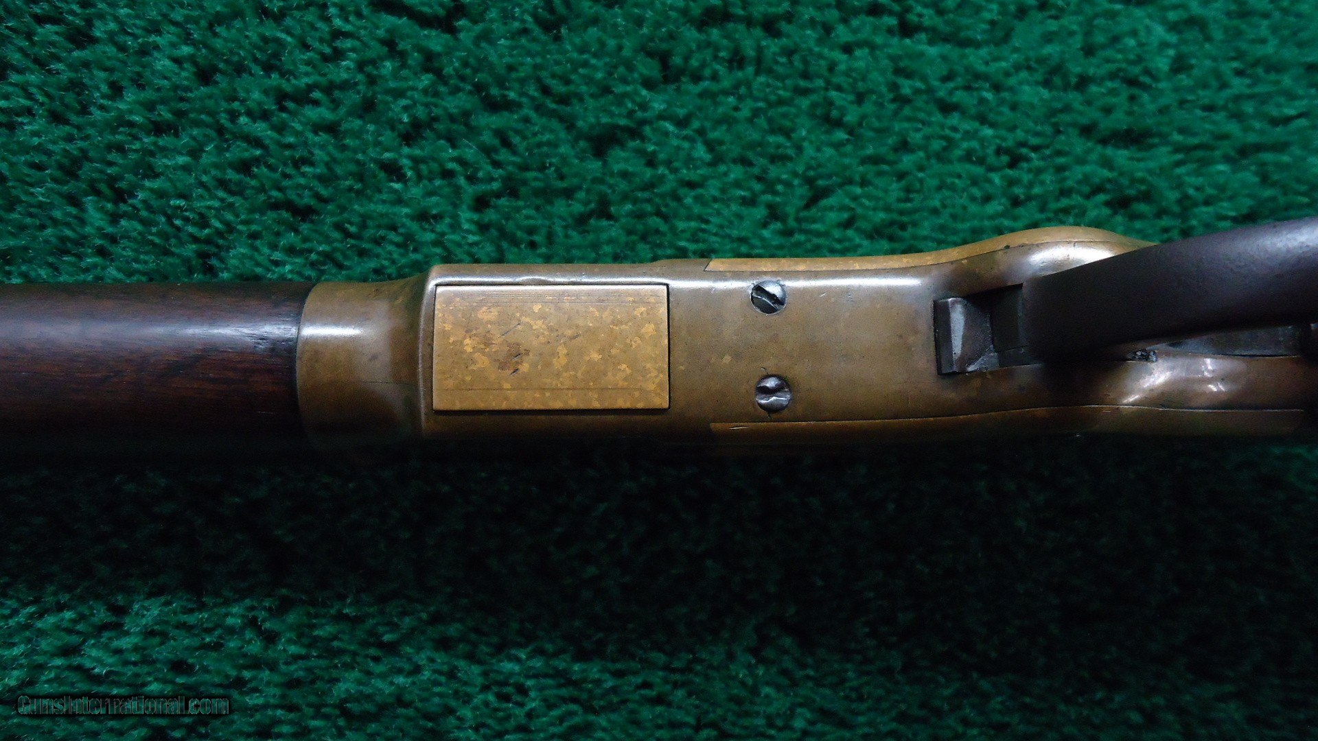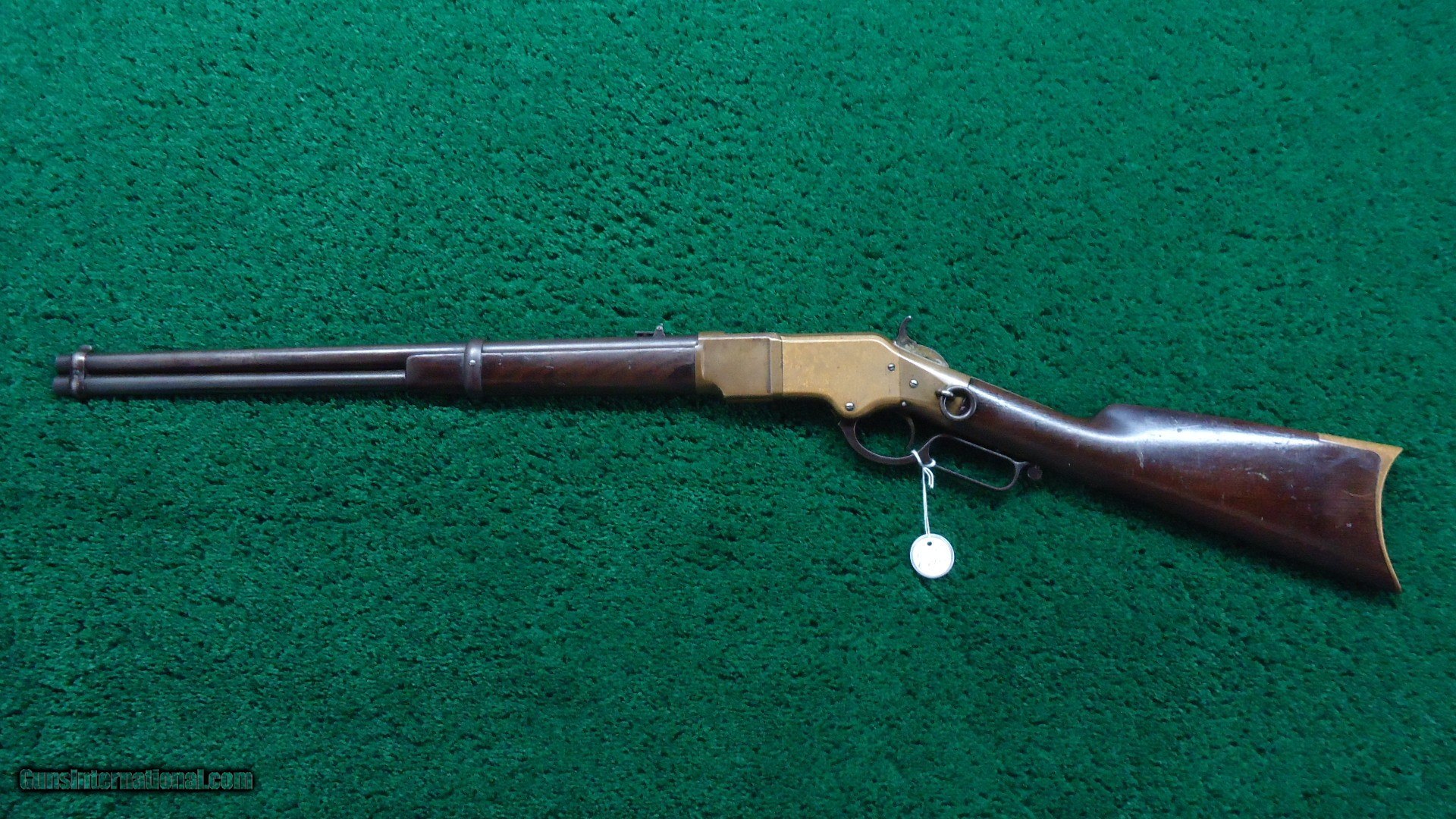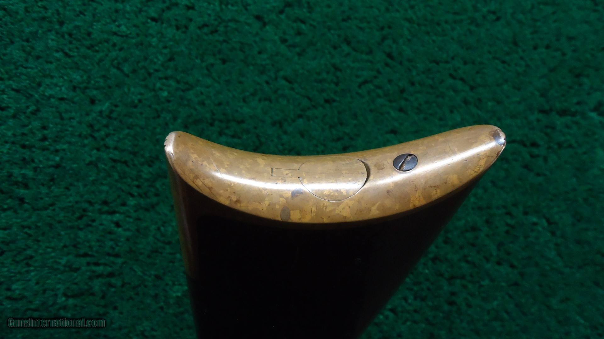 Description: Standard 20 inch carbine configuration in 44 RF caliber with a pleasing dark brown patina on the barrel and magazine tube. Bore has visible rifling with scattered light pitting throughout. Sights include a blade that is integral to the barrel band front and a two leaf folding rear. Receiver has a nice aged brass patina. Lighter colored tight fitting side plates. Original saddle ring. Hammer and lever are mostly a brown color. Walnut stocks look good with some light handling and usage mars with a brass rifle style buttplate. A couple of stress cracks coming off the upper tang. A three piece cleaning rod in the butt. Nice smooth action. 155 year old Winchester that was made in 1869 and looks like it has a story to tell. Leroy Merz Antique Firearms specializes in antique and vintage Winchesters and other fine American firearms. Since 1965 Mr. Merz has taken part in the world of firearms and has been a contributor to many well known reference books. We have hundreds of additional guns in every price range at our home online. Search for Merz Antiques in google. SOLD Antique: Yes Rifle Caliber: .44 Rimfire |
