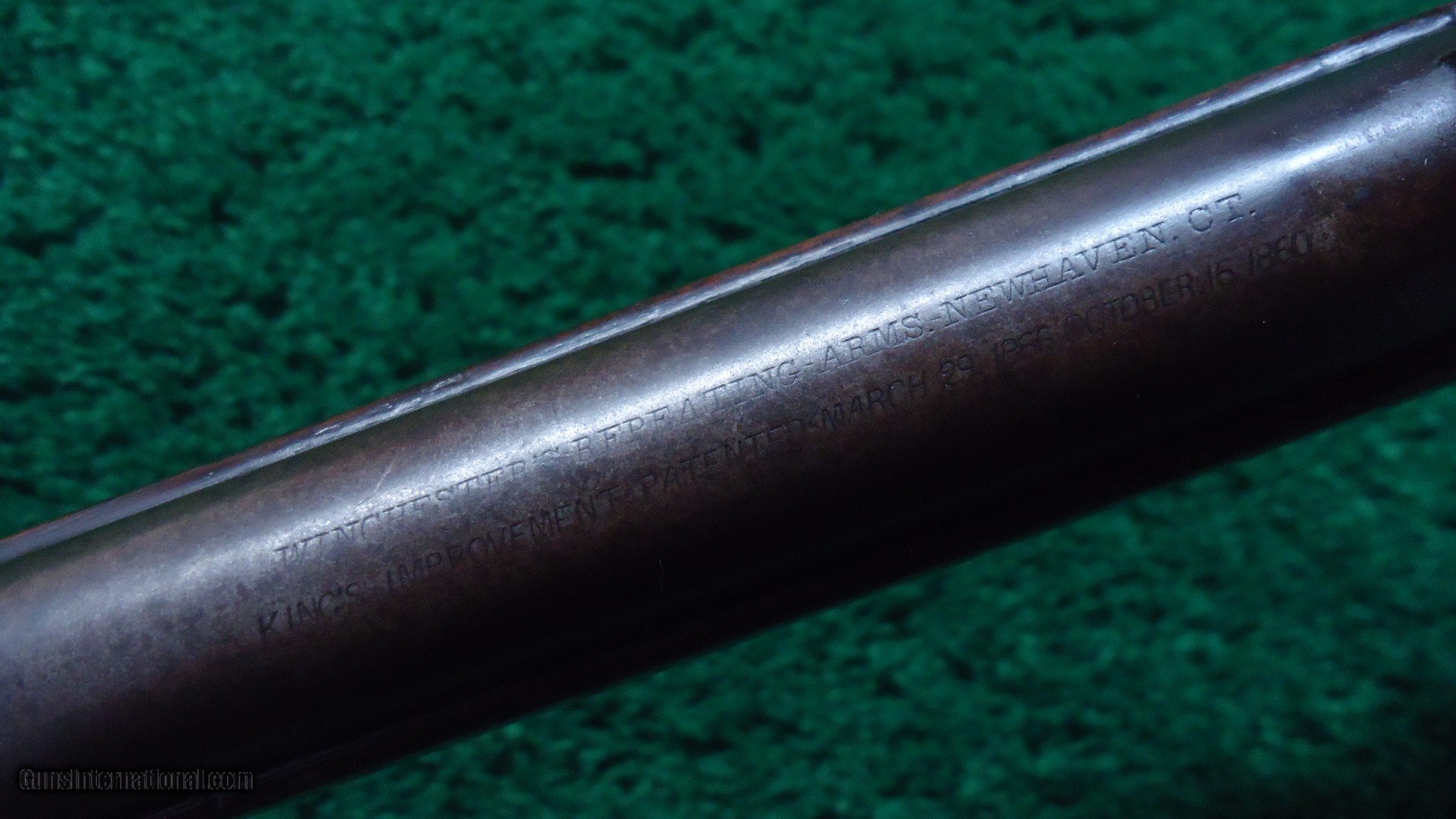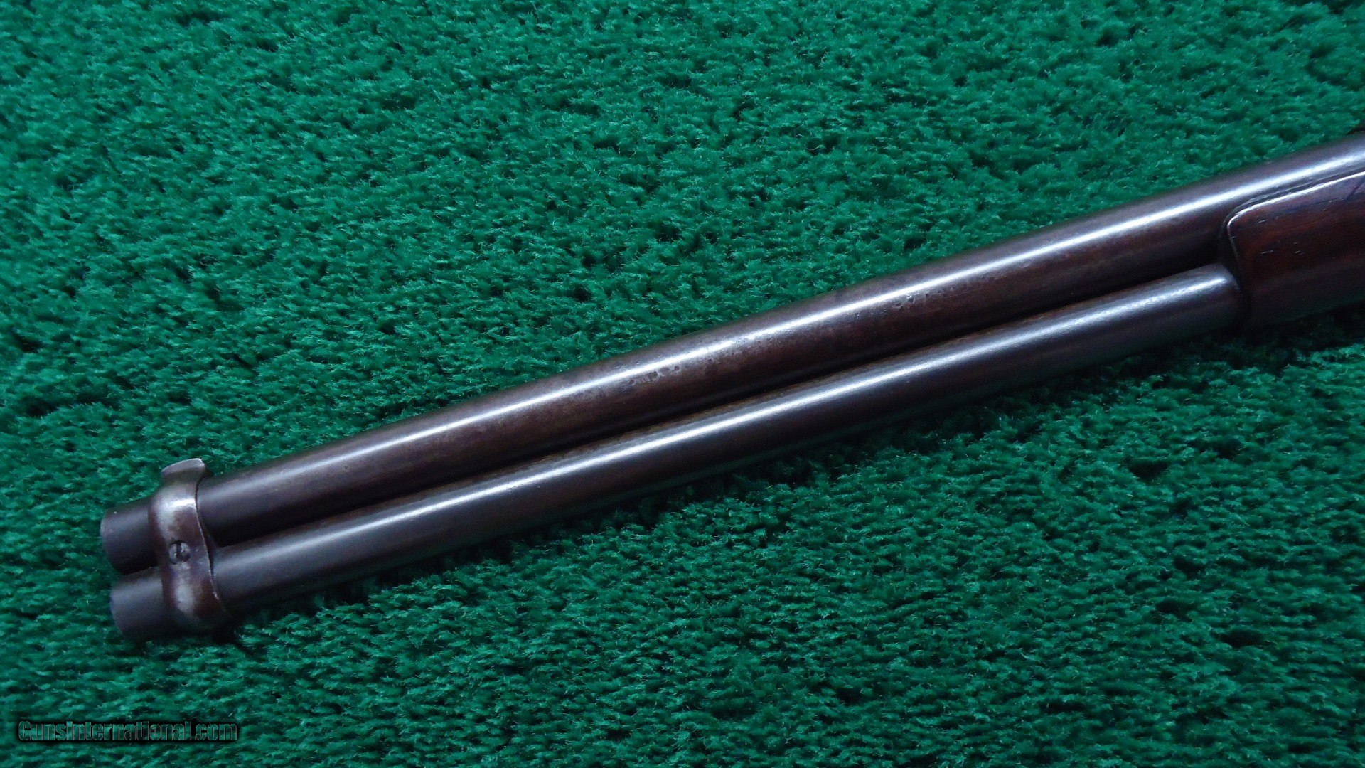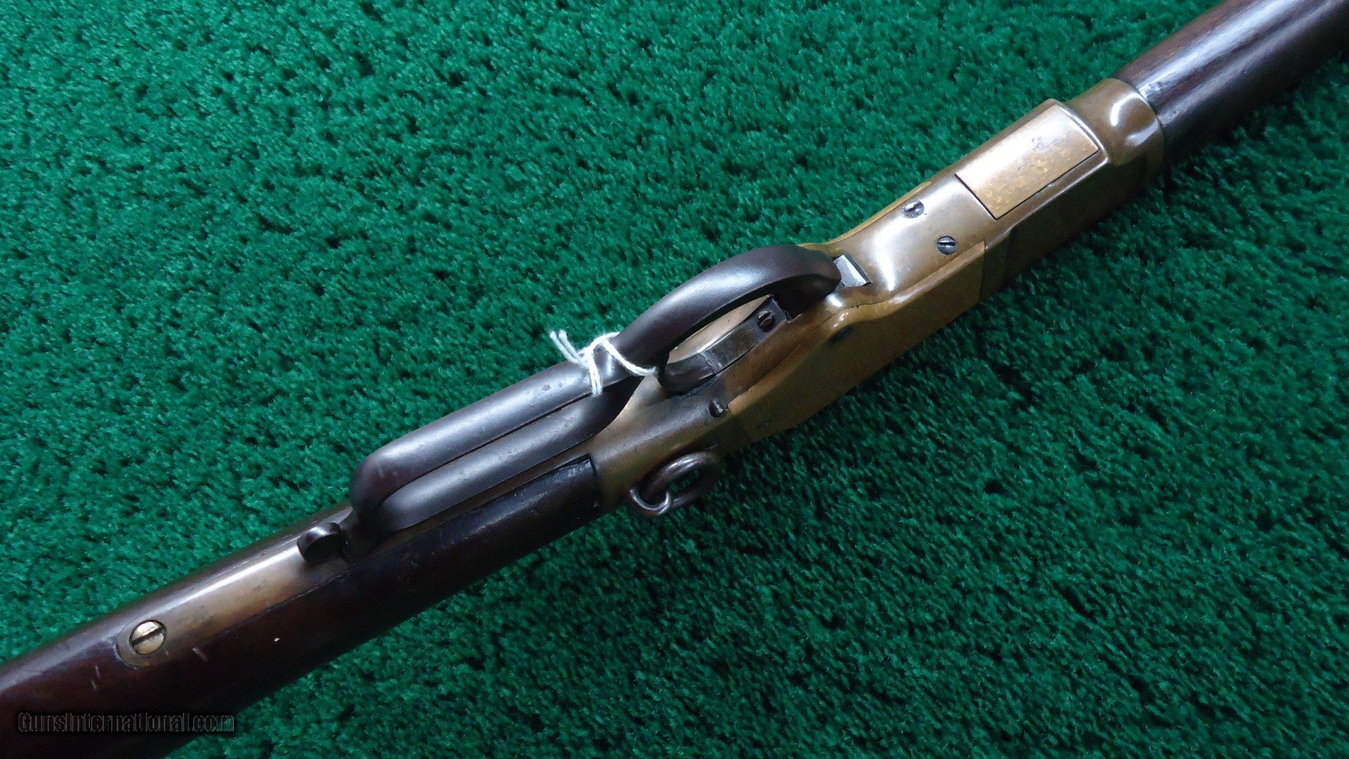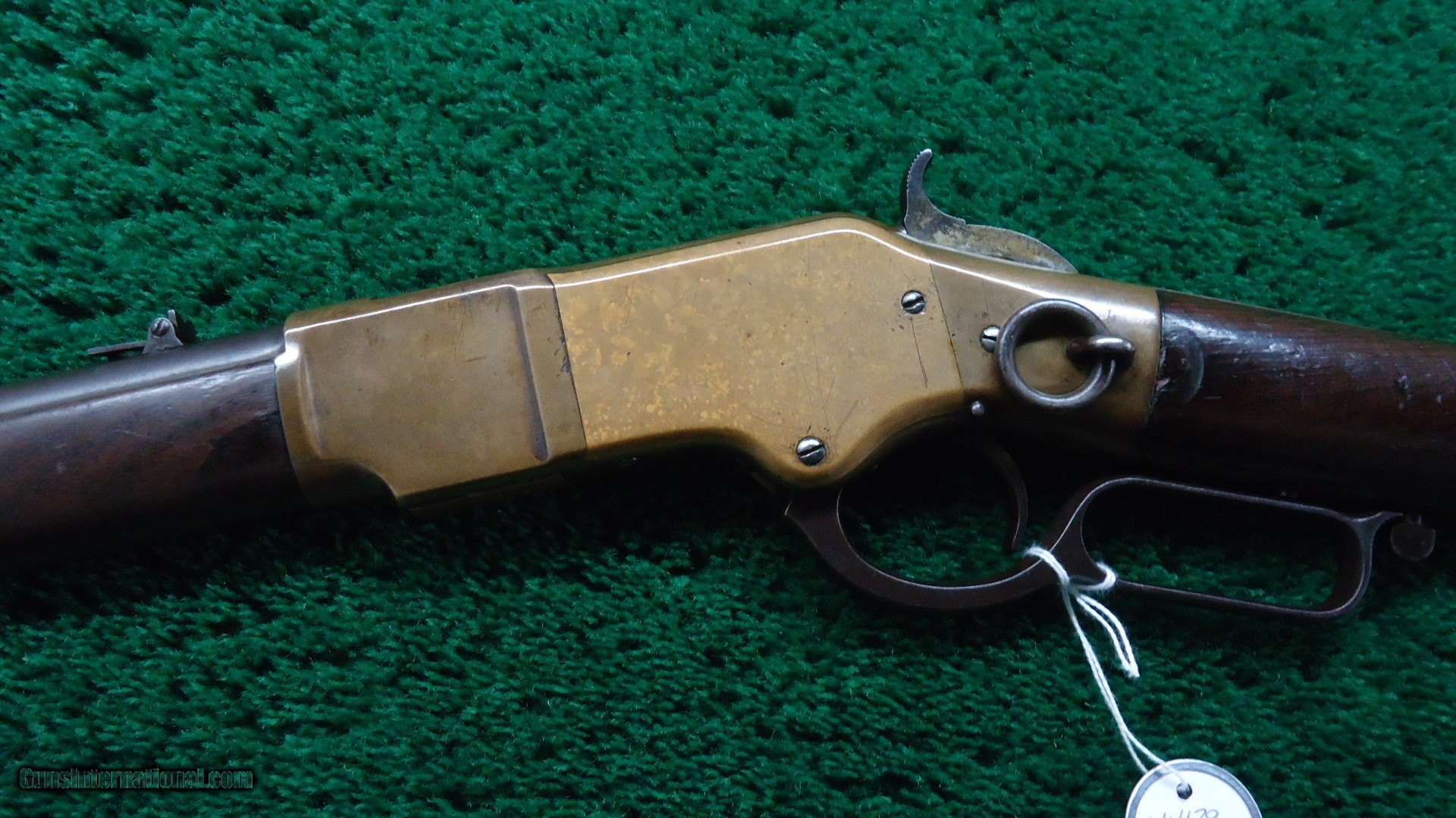 Description: Standard 20 inch carbine configuration in 44 RF caliber with a pleasing dark brown patina on the barrel and magazine tube. Bore has visible rifling with scattered light pitting throughout. Sights include a blade that is integral to the barrel band front and a two leaf folding rear. Receiver has a nice aged brass patina. Lighter colored tight fitting side plates. Original saddle ring. Hammer and lever are mostly a brown color. Walnut stocks look good with some light handling and usage mars with a brass rifle style buttplate. A couple of stress cracks coming off the upper tang. A three piece cleaning rod in the butt. Nice smooth action. 155 year old Winchester that was made in 1869 and looks like it has a story to tell. Leroy Merz Antique Firearms specializes in antique and vintage Winchesters and other fine American firearms. Since 1965 Mr. Merz has taken part in the world of firearms and has been a contributor to many well known reference books. We have hundreds of additional guns in every price range at our home online. Search for Merz Antiques in google. SOLD Antique: Yes Rifle Caliber: .44 Rimfire |