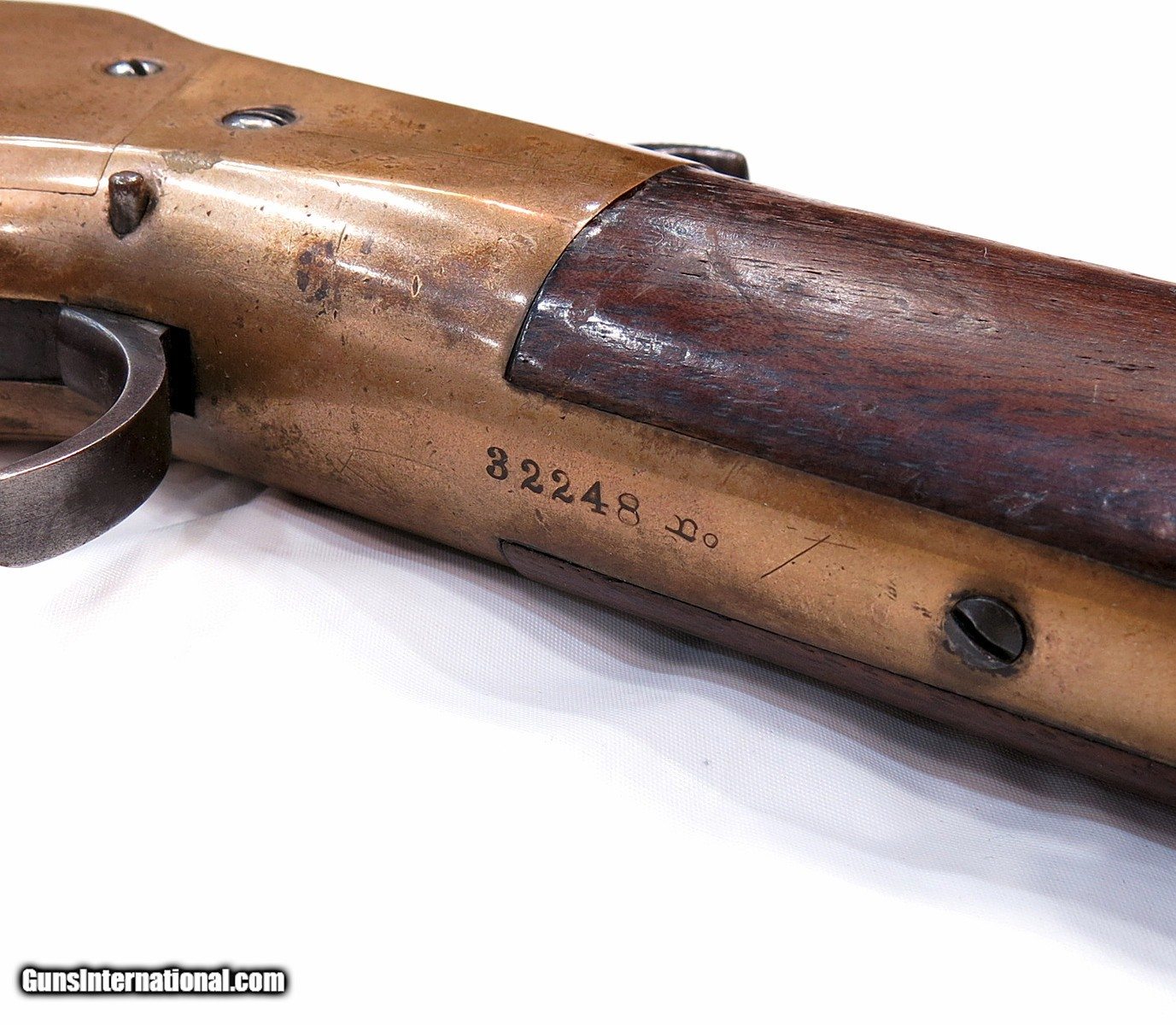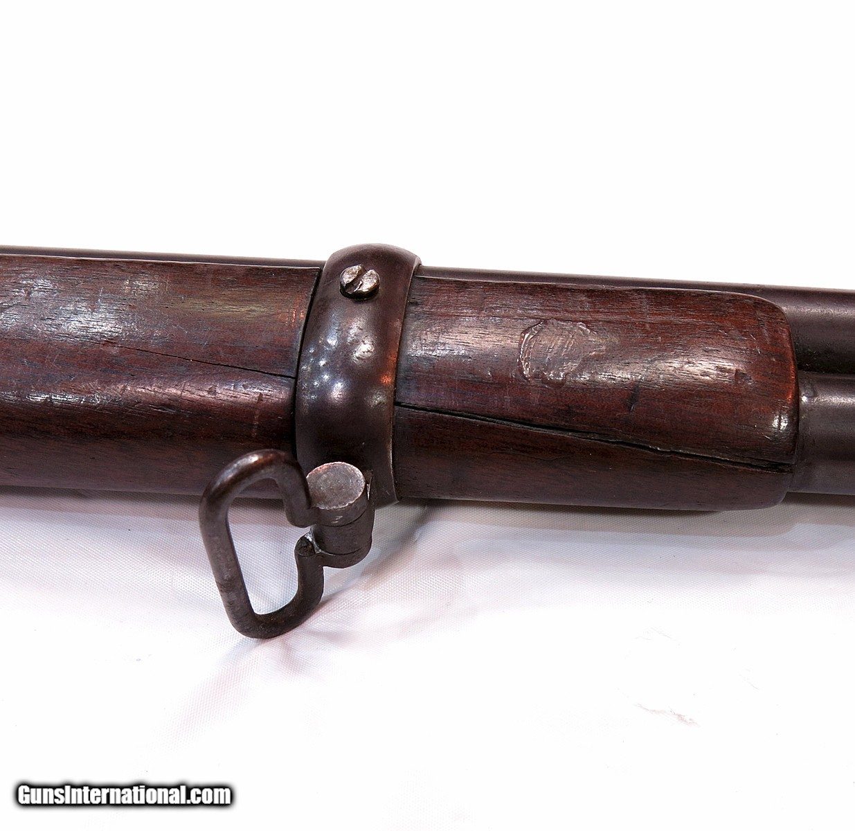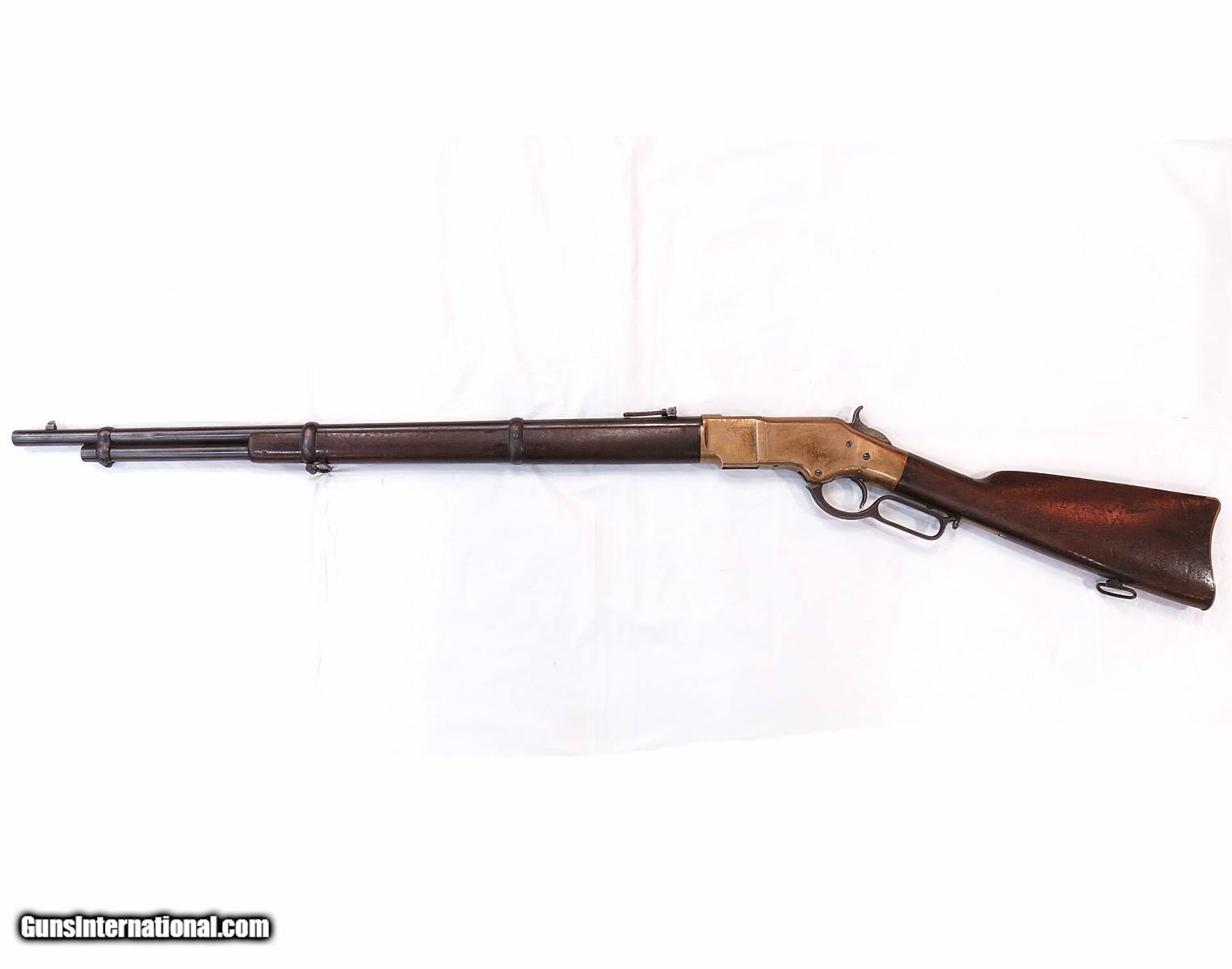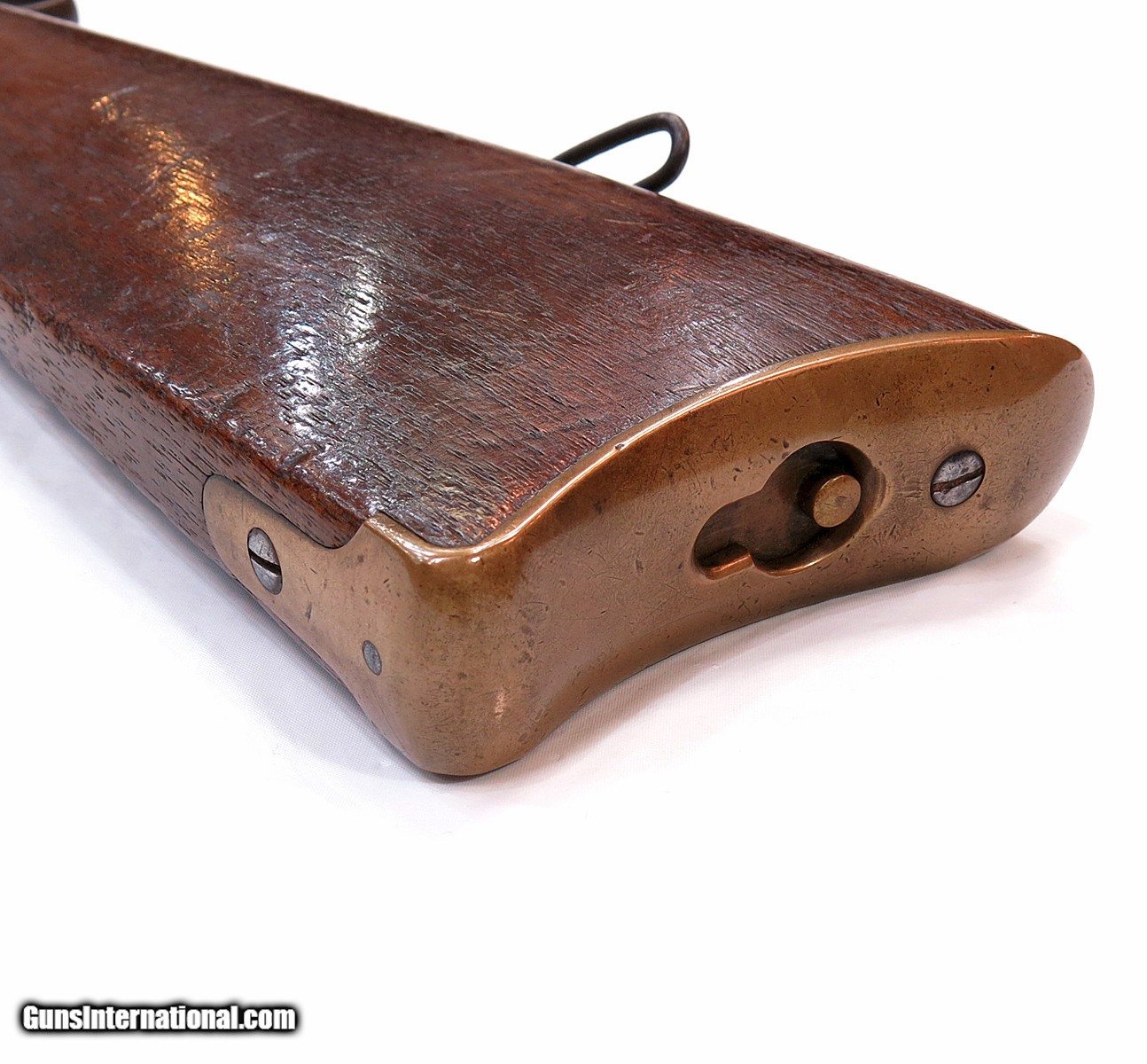 Description: Winchester Model 1866 Yellowboy Musket c.1870. Serial no. 32248B, .44 caliber, 27-inch round barrel with standard front and ladder rear sights. Straight-grained oil-finished walnut stock with musket-style configuration, three barrel bands and two sling swivels. 24-inch magazine. Curved brass buttplate with storage compartment. Conditon: Very good. Retaining most of the original finish which is now a smooth plum brown with scattered patches of fine pitting. Heavier scratches to magazine tube under front barrel band. Slight bulge in barrel five inches from muzzle. Area of address showing signs of having been cleaned. Mellow patina to brass with patches of staining and fine scratches. Wood with moderate age wear, numerous small dents and 3-inch cracks at forearm and wrist. Rear sling swivel is stiff. Bore is good showing moderate wear. SOLD Antique: Yes |