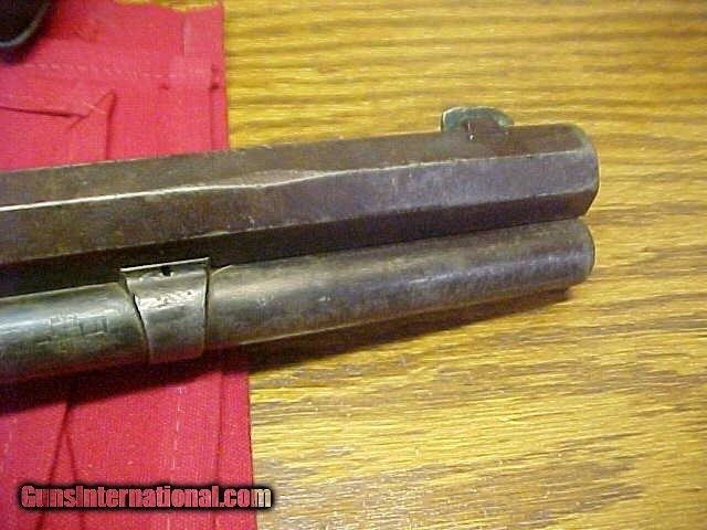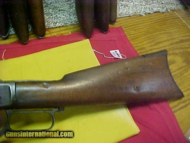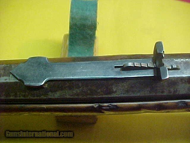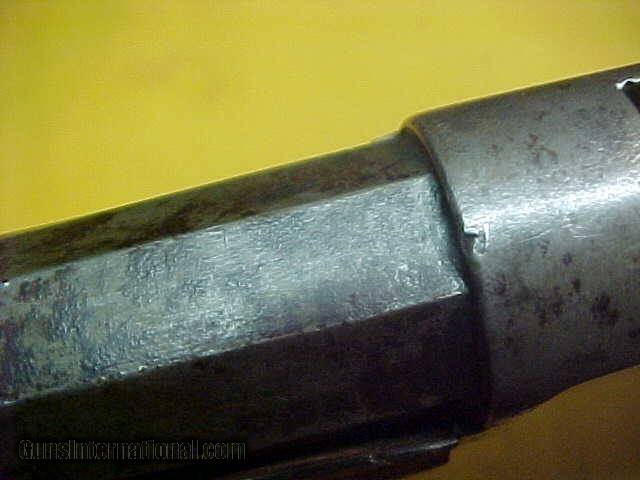 Description: #4913 Winchester 1873 OBFMCB, 2nd Variation serial numbered in the 65XXX range (1881) and having the very desirable heavy barrel (one size heavier than standard, but NOT the extremely rare “Bull Barrel”). Smooth action, G/G+ 44/40 bore, about a 6 on a scale of 10. It has strong rifling but has darkness, scale, and lead build-up the entire length and while it looks like it will still spin a bullet, just how accurate it would be is anyones guess. The exterior is VG smooth metal with a mottled grey-brown patina overall, VG markings. The dust cover has an interesting inscription, “W. Cooper/Marshal/Deming” in what appears to be a gang stamp and not individual letter stamps. This may be worth exploring, but whether it is GENUINE is a much bigger question.The wood is quite worn with some deep bruises, a sliver on the forearm right side, a chip at the buttplate and some wear at the top tang area. Buckhorn rear sight, Rocky Mountain style front sight. A decent old heavy barreled cowboy rifle with a lot of charisma and an interesting inscription. There are lots of pictures of this neat old gun, so if they all do not load up, be sure to e-mail me and I’ll forward them along to you. VG overall. $2395 SOLD Antique: Yes |