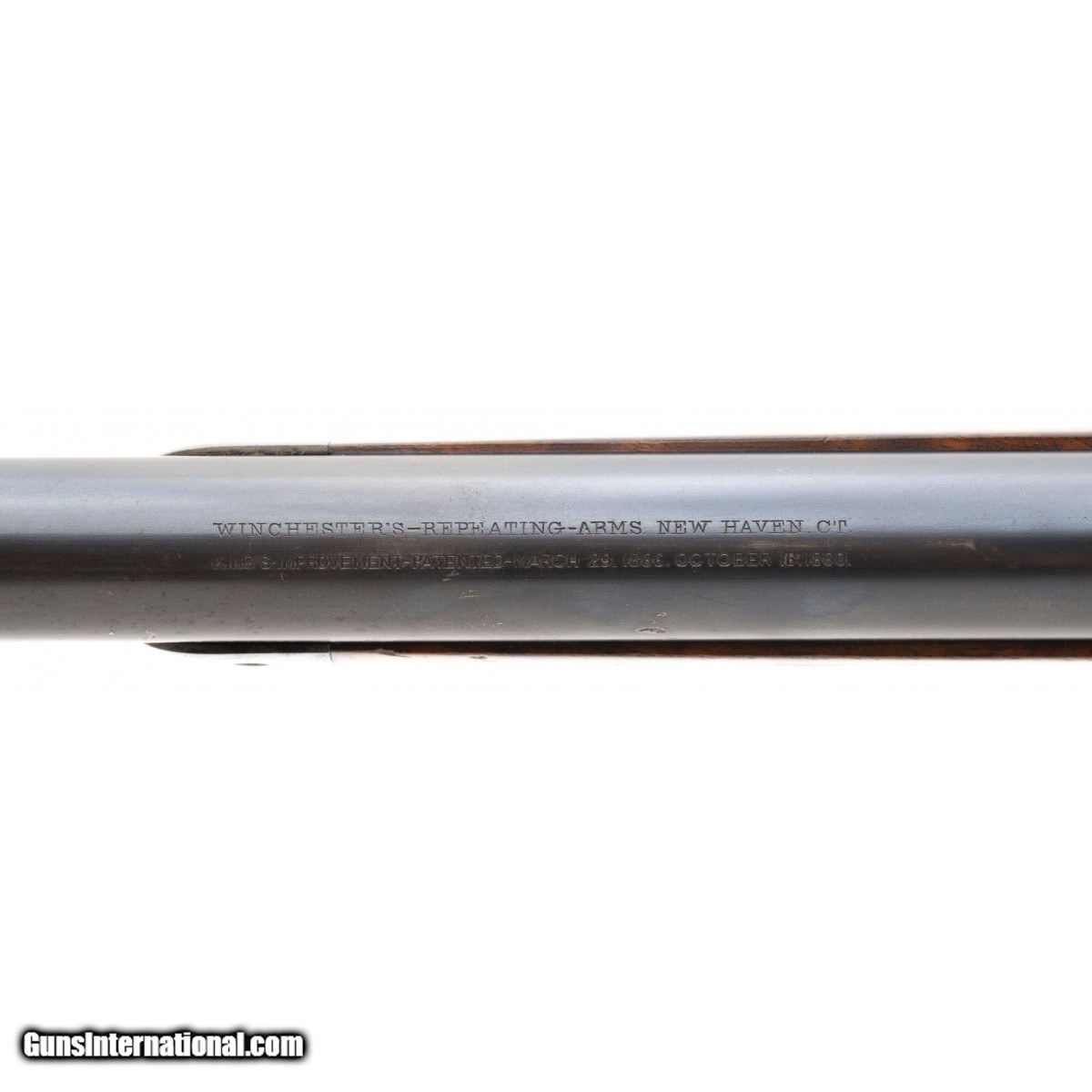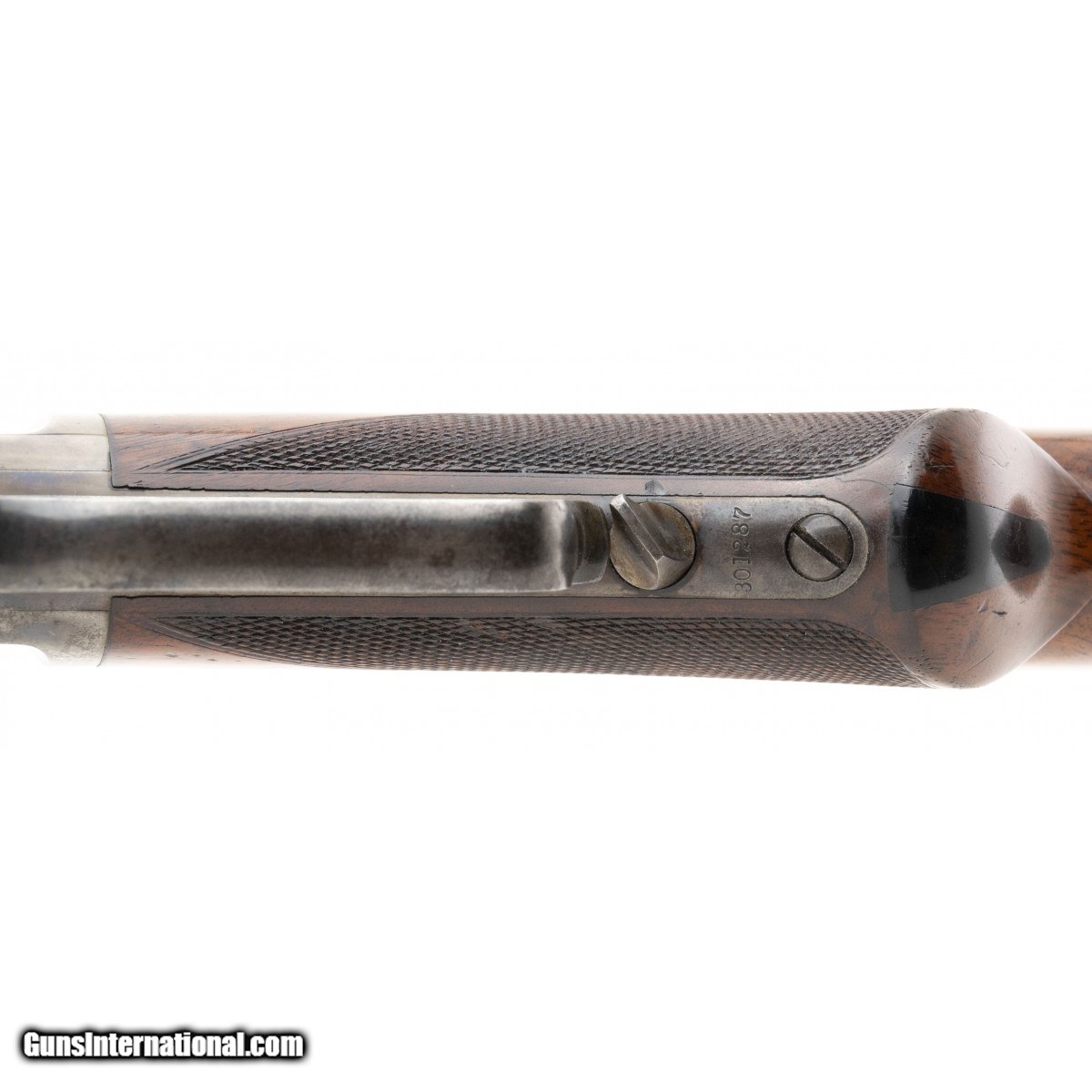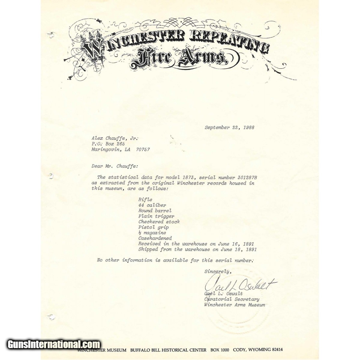 Description: "Serial number 301287. Made in 1891. 44-40 caliber with a 24" barrel. Beautiful gun in excellent condition! Barrel has 95% of the original blue. Frame has bright case colors. Wood is excellent. This gun also has a half magazine. The tang and globe sight are additions. This gun comes with a factory letter confirming all features. Beautiful deluxe Winchester 1873 Deluxe Rifle! SOLD |