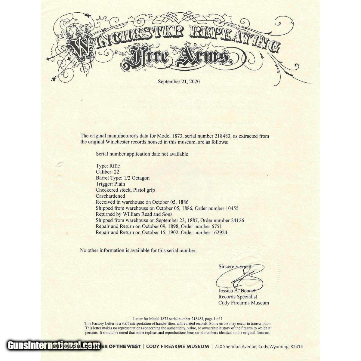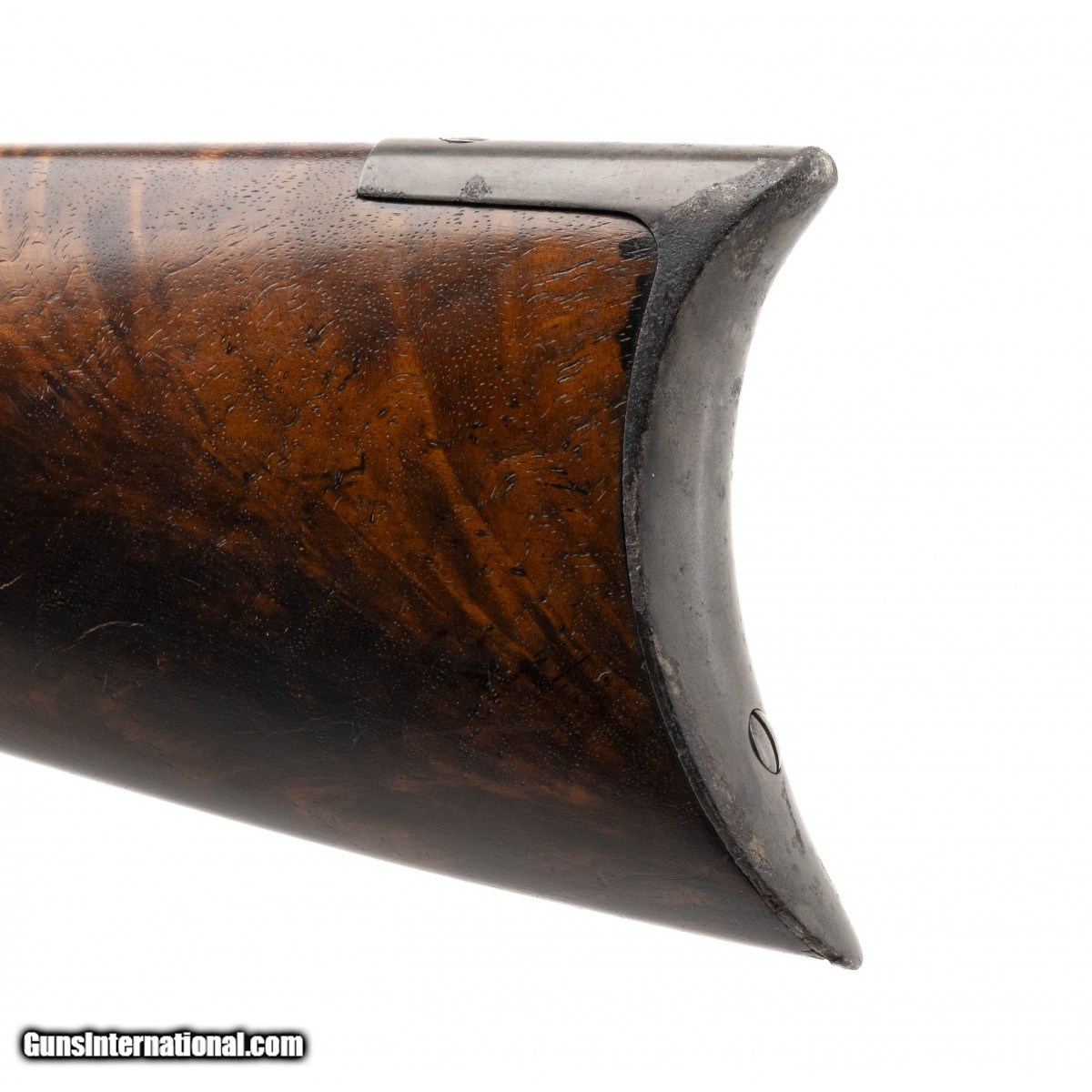 Description: "Serial number 218483. Made in 1886. 22 Caliber with a 24" of a half round half octagon barrel. Metal has been cleaned and has a light gray patina. Frame shows spots of pitting. Wood is very good as refinished. The stock is a deluxe checkered pistol grip with lost of figure. This gun comes with a factory letter confirming the configuration. These 22 calibers guns are rare and the Deluxe 22s are almost nonexistent. SOLD Antique: Yes |
