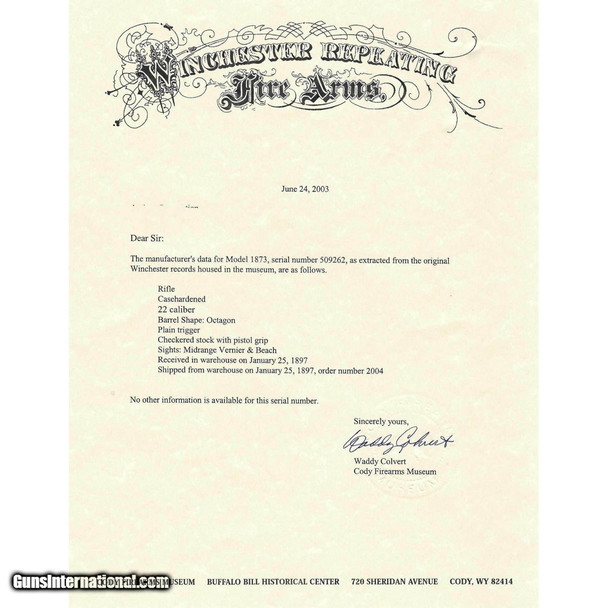 Description: " Serial number 509262. Made in 1897. 22 caliber with a 24" barrel. This gun has been professionally restored to meant condition. The metal has one hundred percent of restored finish. The wood appears to be original that has been refinished to near new condition. This is an extremely rare Winchester 1873 22 Caliber Deluxe. This gun comes with a factory letter confirming the configuration! SOLD Antique: Yes |