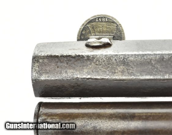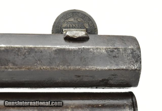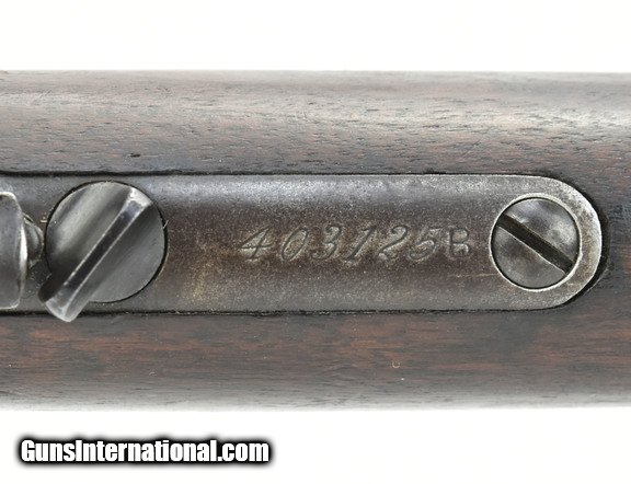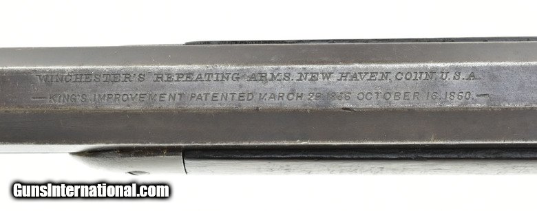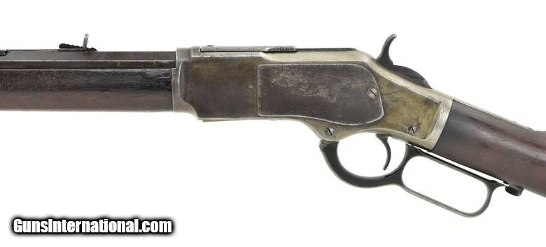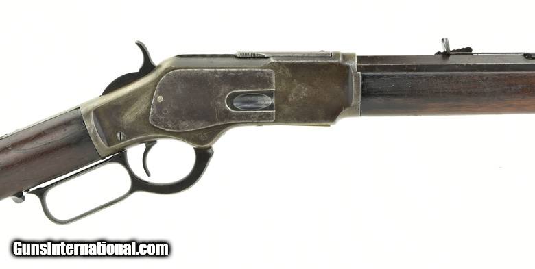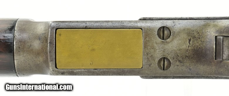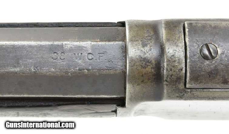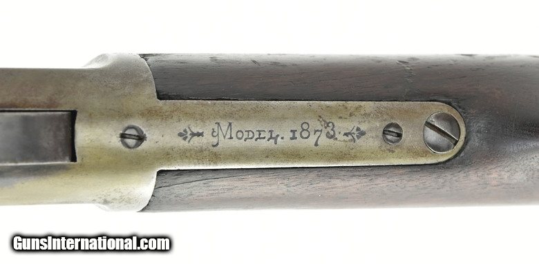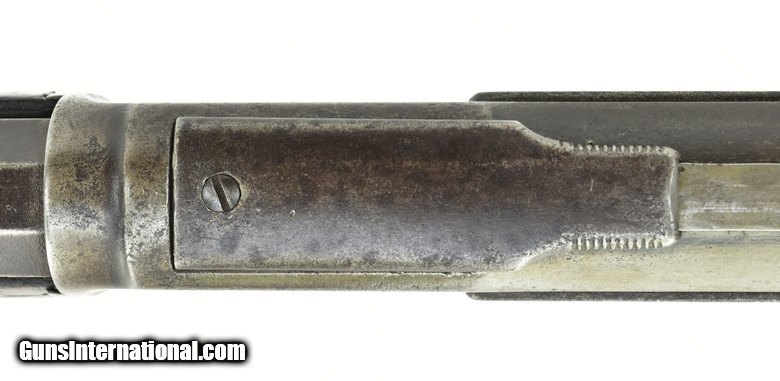 Description: " Winchester 1873 .38-40 caliber rifle. Made in 1891. Has 24” barrel. Barrel is reasonably sharp with a mostly brown patina, some pitting near the muzzle. The front sight has been replaced with an 1857 dated dime. The frame is dark gray to brown patina. Wood is very good as refinished with a coat of varnish. Bore has visible rifling with some pitting.