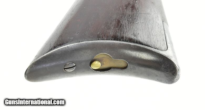 Winchester 1873 .38-40 caliber rifle. Made in 1891. Has 24” barrel. Barrel is reasonably sharp with a mostly brown patina, some pitting near the muzzle. The front sight has been replaced with an 1857 dated dime. The frame is dark gray to brown patina. Wood is very good as refinished with a coat of varnish. Bore has visible rifling with some pitting.