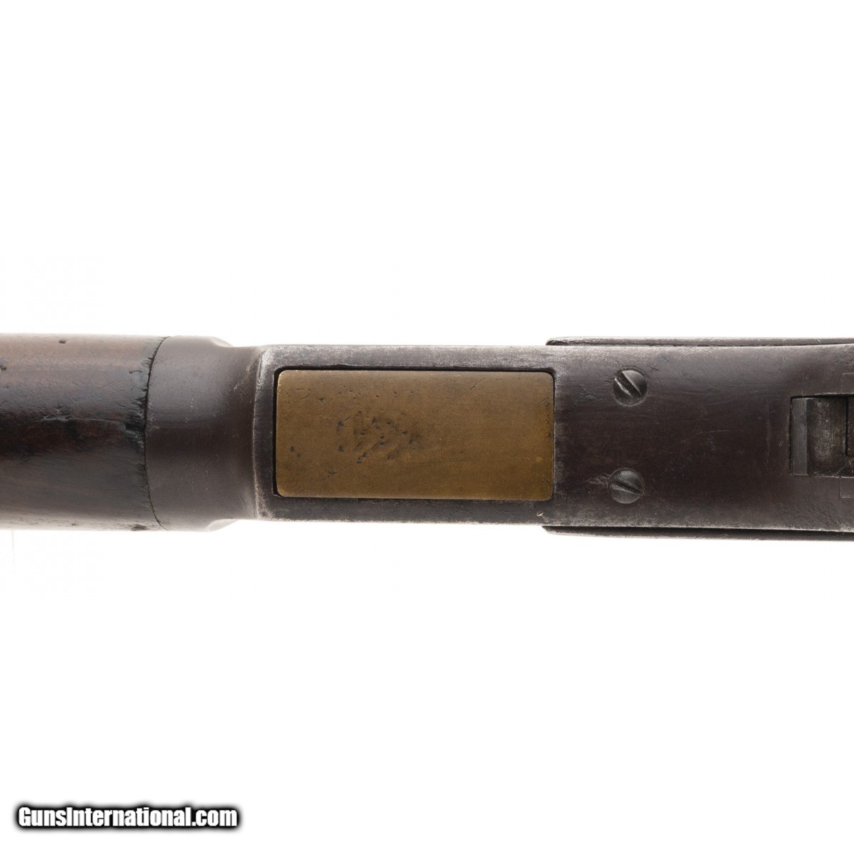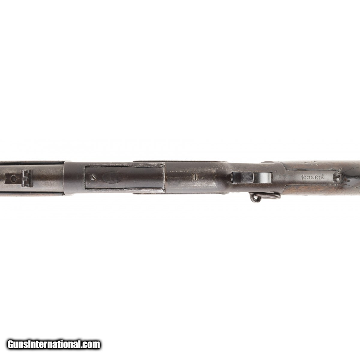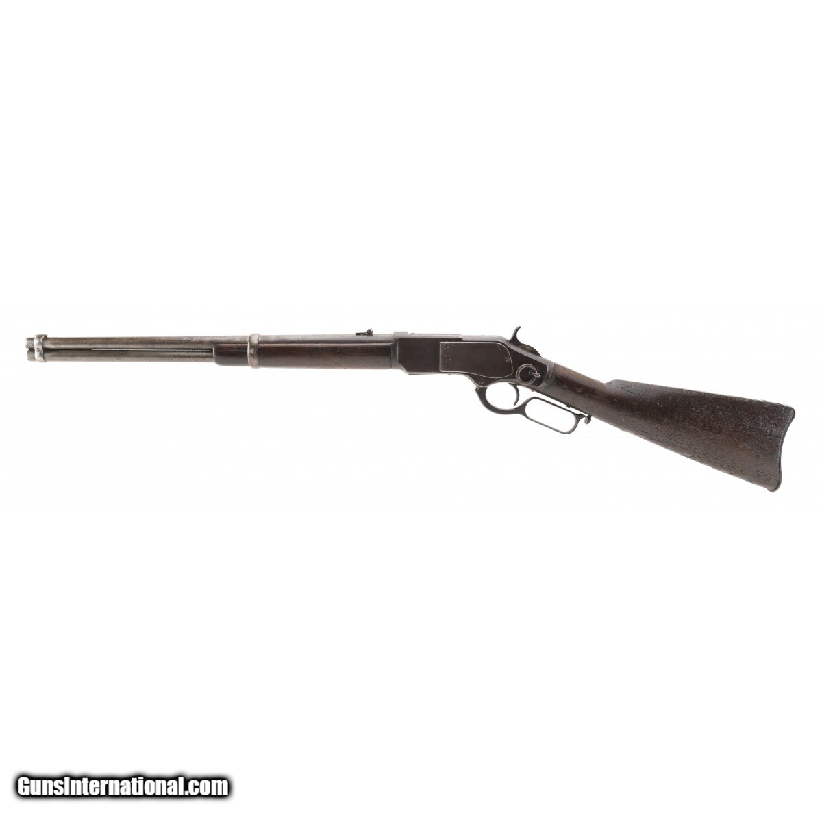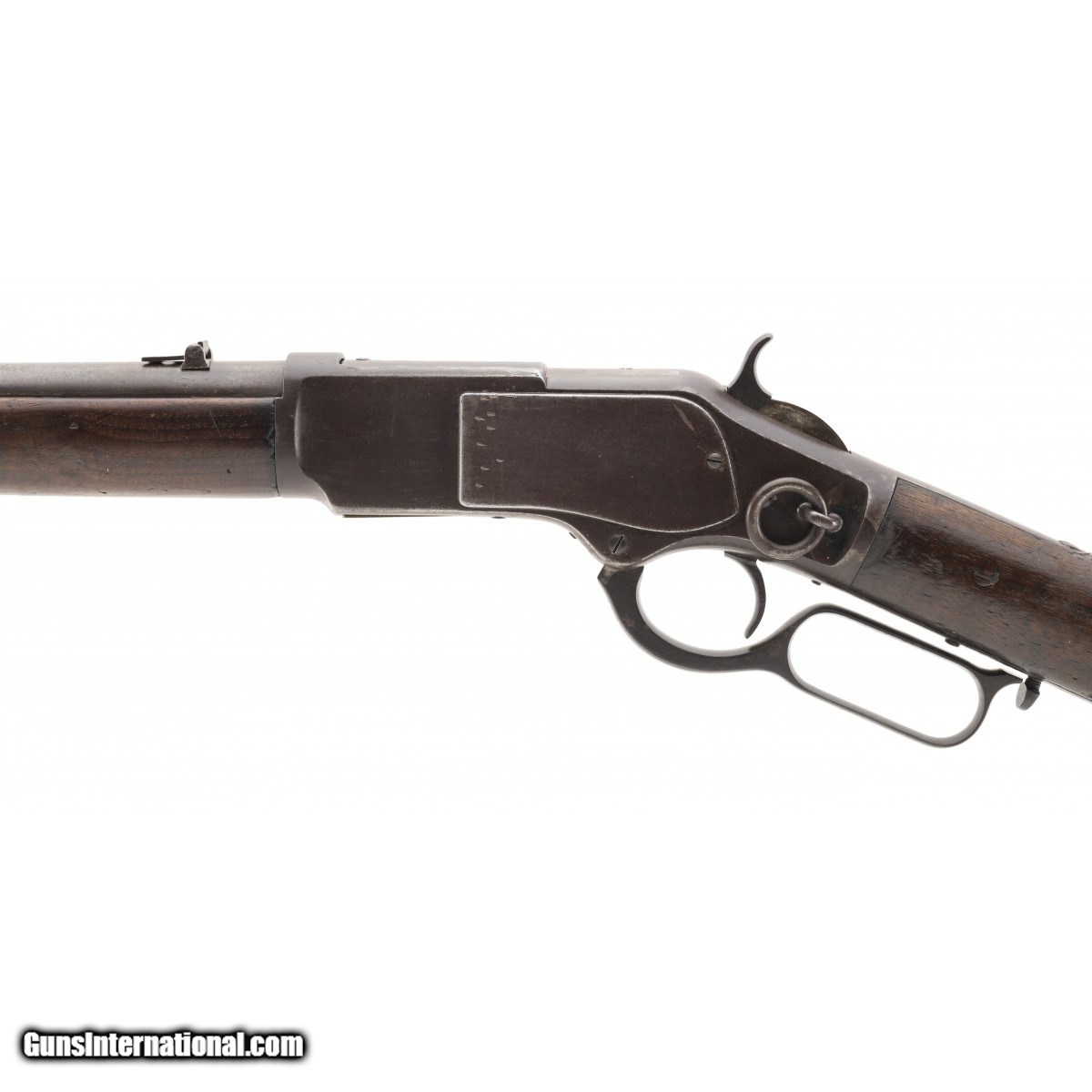 Description: "Made in 1876. 44-40 with a 20" barrel. Nice sharp gun with good clear markings. Barrel has a light brown to gray patina. Frame is a mostly brown patina with trace blue in the protected areas. Wood is very good and has a pleasing weathered appearance on the butt stock. The weathered appearance is on the left hand side of the butt stock and based on the condition of the rest of the gun makes us think this gun was probably carried in a rifle scabbard. Bore has strong rifling with some pitting. There is a ring about an inch from the muzzle. A blade has been added to the barrel band front sight. Very nice example of an honest 1st model Winchester 1873 Saddle Ring Carbine! SOLD Antique: Yes |