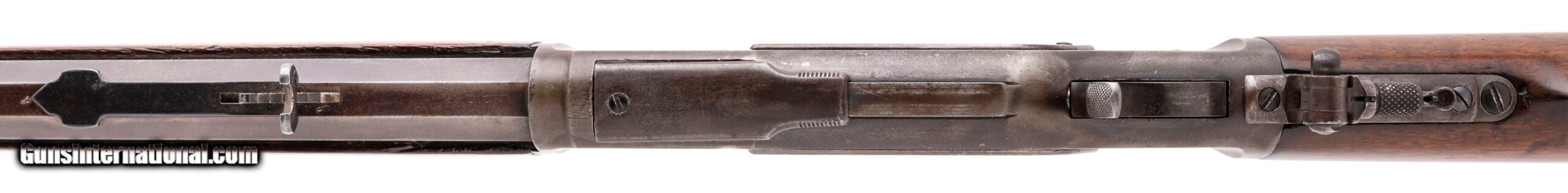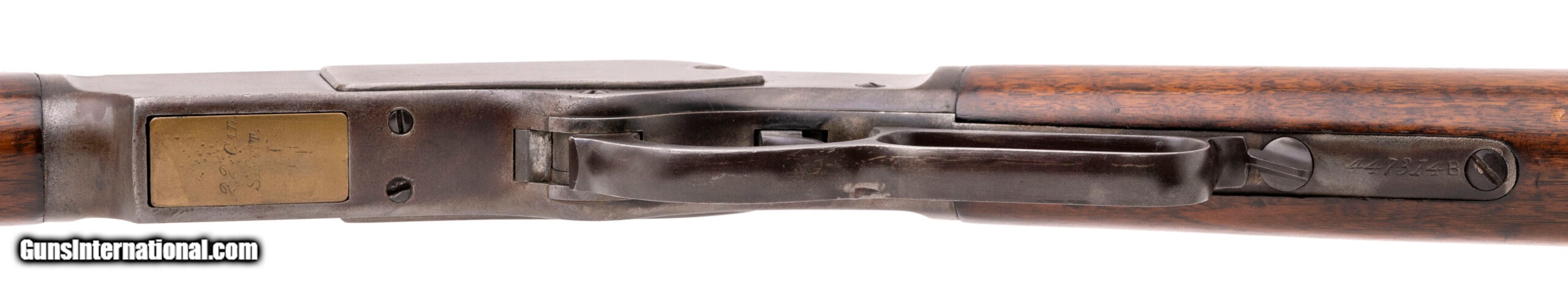 Description: "Serial No. 447314B, made in 1893, .22 short, 24" octagonal barrel marked “WINCHESTER’S REPEATING ARMS NEW HAVEN. CONN. U.S.A./ -KING’S IMPROVEMENT PATENTED MARCH 29.1866 OCTOBER 16.1860- “. Bore is good with light frosting visible in the grooves, rifling remains present. Finish is mostly a smooth light brown patina with the edges a visible grey patina, traces of blue is noted in protected areas. Forward of the receiver is marked “22 SHORT", 3RD model dust cover remains present. Tang has a Lyman peep sight added and shares the same patina as the rest of the rifle. Brass carrier has a faint “22 CAL/SHORT" visible. Wood is smooth with a light polish on the surface, minimal nicks and scratches are noted. Action is smooth and functions correctly. SOLD Antique: Yes |