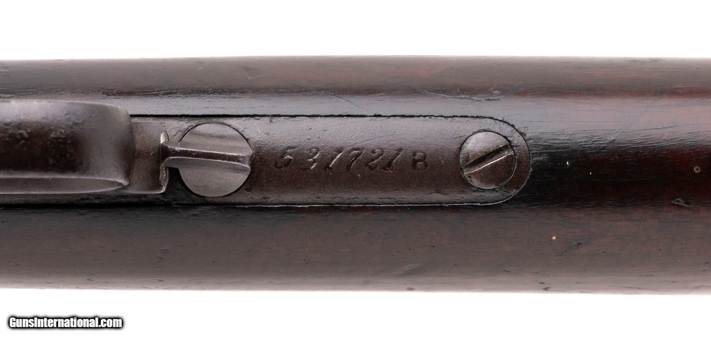 Description: "Serial No. 531721B, made in 1899, .32 W.C.F., 24" octagonal barrel marked “WINCHESTER’S REPEATING ARMS NEW HAVEN. CONN. U.S.A./ -KING’S IMPROVEMENT PATENTED MARCH 29.1866 OCTOBER 16.1860- “. Bore is dark with oxidation visible in the grooves, rifling remains strong. Metal is an even dark brown patina with scattered areas of surface oxidation noted. Forward of the receiver is marked “32 W.C.F.", 3RD model dust cover is present, tang is marked “Model 1873" in between faint decorative scroll. Brass carrier has “32 CAL" with the initials “AC" stamped just below. Wood shows expected nicks dings and scratches from handling and usage wear. The initials “AC" appears on the right side of the stock just above the lever latch. Action is tight and functions correctly. No question this rifle was a work horse to its owner “AC" SOLD Curio/Relic: Yes |