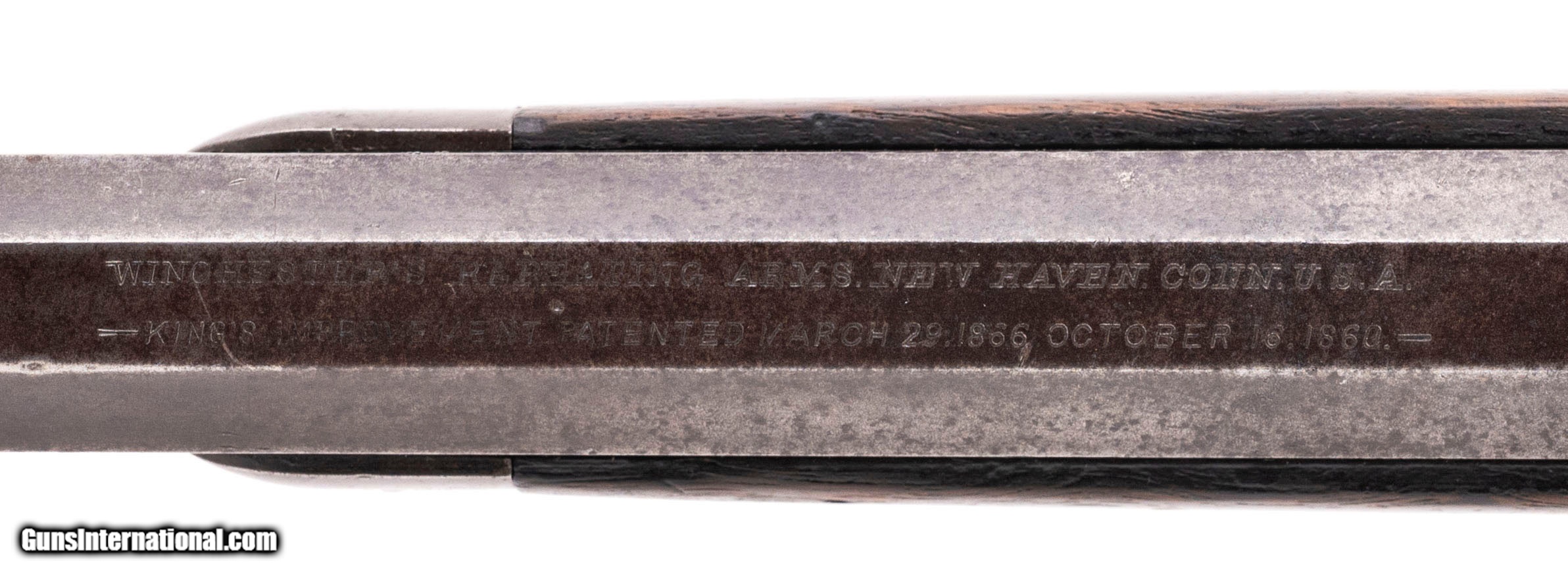Description: "Serial no 409859B, made in 1892, .32 W.C.F., 26" octagonal barrel marked “WINCHESTER’S REPEATING ARMS NEW HAVEN. CONN. U.S.A./ -KING’S IMPROVEMENT PATENTED MARCH 29.1866 OCTOBER 16.1860- “. Bore is dark with pitting and frosting visible in the lands and grooves, rifling remains visible. Metal is mostly a brown/grey patina with traces of original blue noted in protected areas. Forward of receiver is marked “32 W.C.F.", 3rd model dust cover is present. Tang is marked “MODEL 1873" in between decorative scroll, brass carrier has a faint “32 CAL" visible. Stock is good with light nicks, dings and scratches noted, varnish is flaking off in some areas. Action is good and functions correctly. SOLD Antique: Yes |