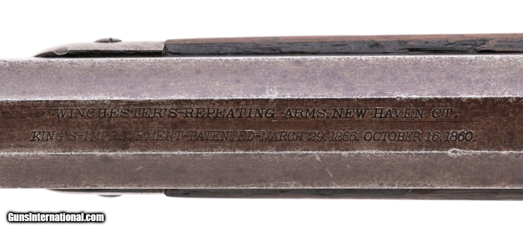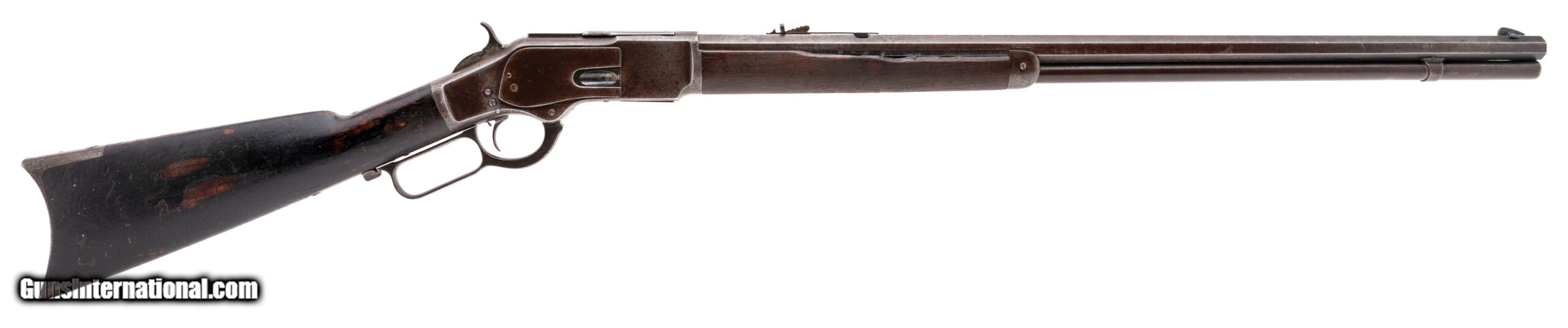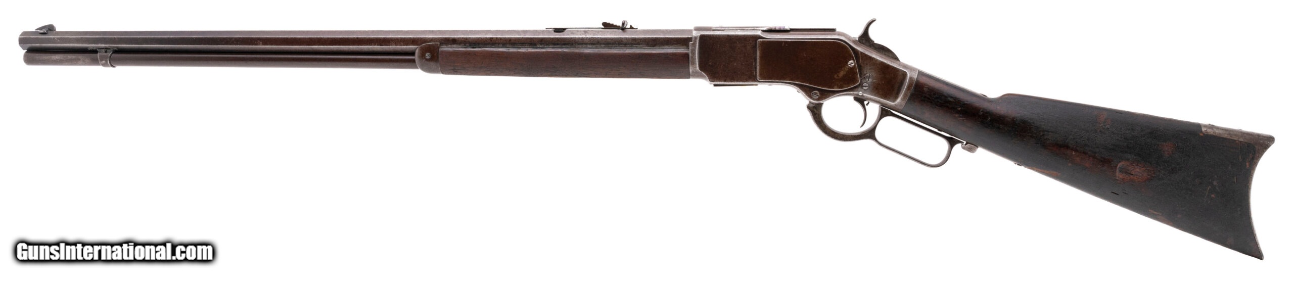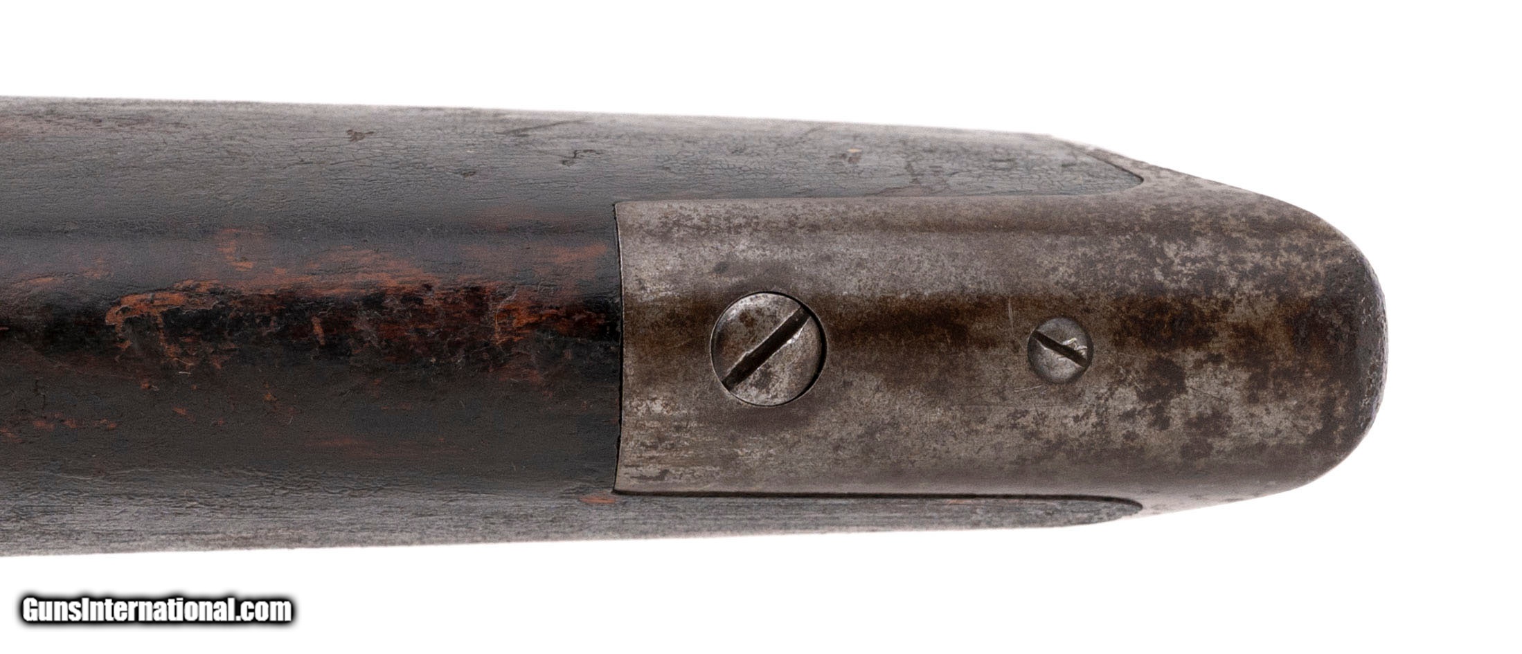 Description: "Serial No. 33877, made in 1879, .44-40, 28" octagonal barrel marked “WINCHESTER’S-REPEATING-ARMS. NEW HAVEN.CT./KINGS-IMPROVEMENT-PATENTED-MARCH 29.1866. OCTOBER 16.1860". Forward of receiver has no caliber stamp indicating rifle is in 44-40. Bore is bright with scattered oxidation visible in the grooves, rifling remains strong. Metal has turned to a brown/grey patina with traces of original blue visible in protected areas. 2nd Model dust cover is present, tang is marked “Model 1873" Brass carrier is unmarked. Wood has expected nicks, dings and scratches visible, with wood loss noted right side of the forearm. Set trigger and action both function correctly. SOLD Antique: Yes |