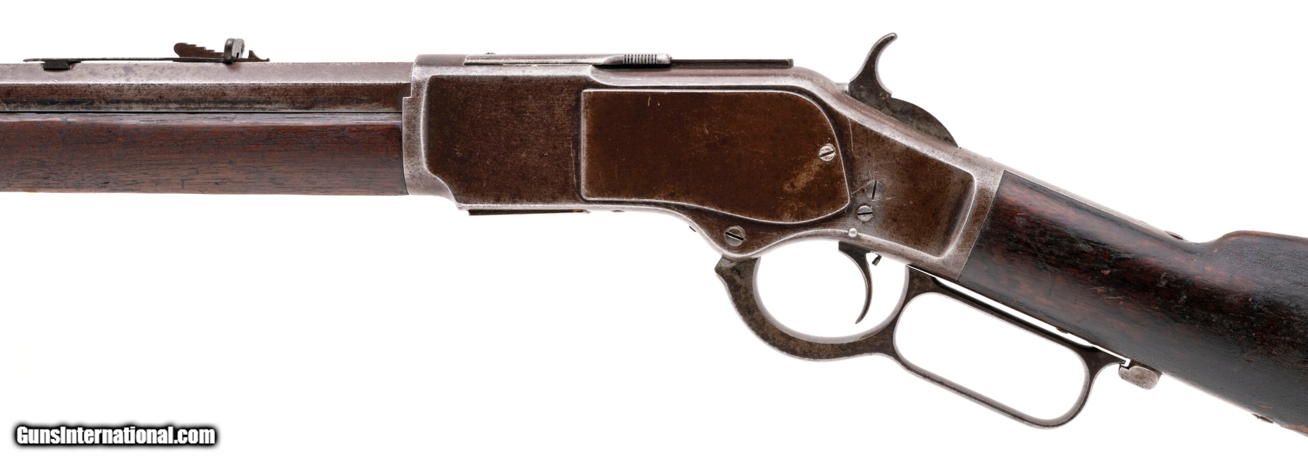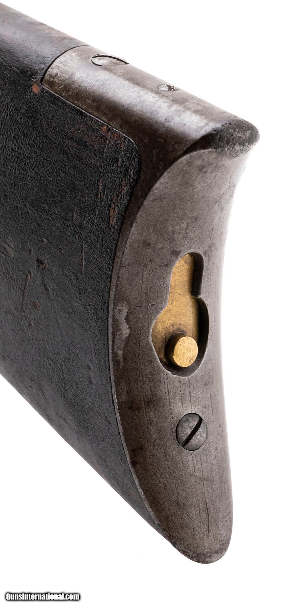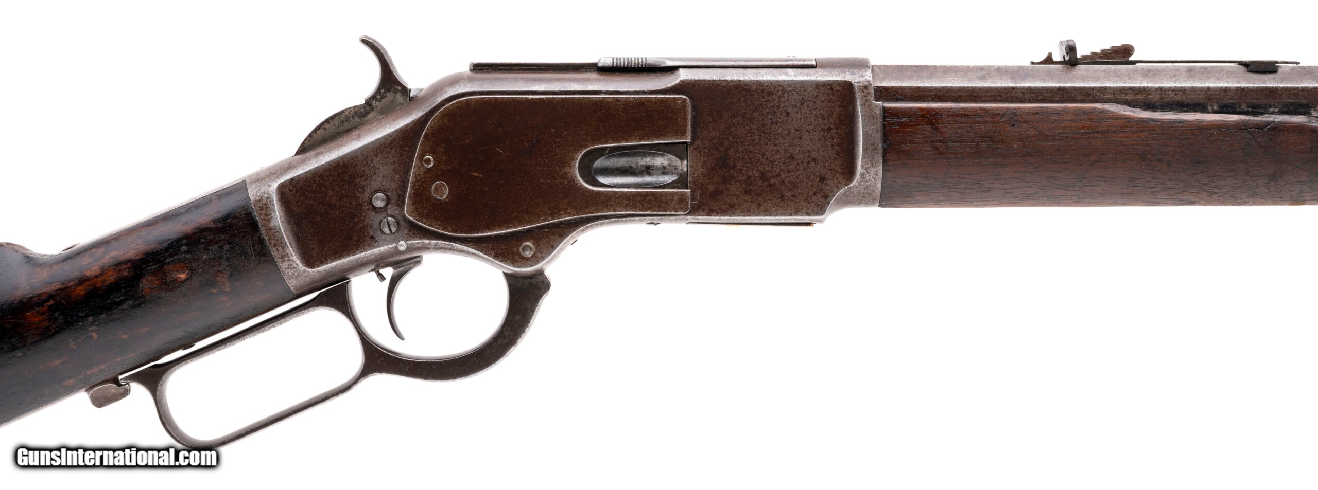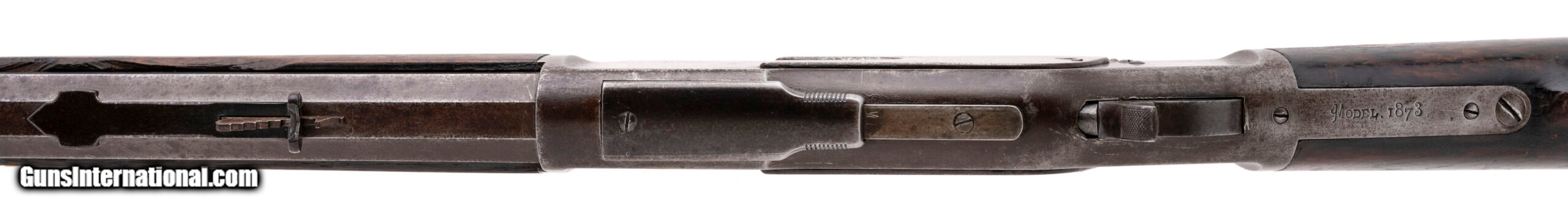 Description: "Serial No. 33877, made in 1879, .44-40, 28" octagonal barrel marked “WINCHESTER’S-REPEATING-ARMS. NEW HAVEN.CT./KINGS-IMPROVEMENT-PATENTED-MARCH 29.1866. OCTOBER 16.1860". Forward of receiver has no caliber stamp indicating rifle is in 44-40. Bore is bright with scattered oxidation visible in the grooves, rifling remains strong. Metal has turned to a brown/grey patina with traces of original blue visible in protected areas. 2nd Model dust cover is present, tang is marked “Model 1873" Brass carrier is unmarked. Wood has expected nicks, dings and scratches visible, with wood loss noted right side of the forearm. Set trigger and action both function correctly. SOLD Antique: Yes |