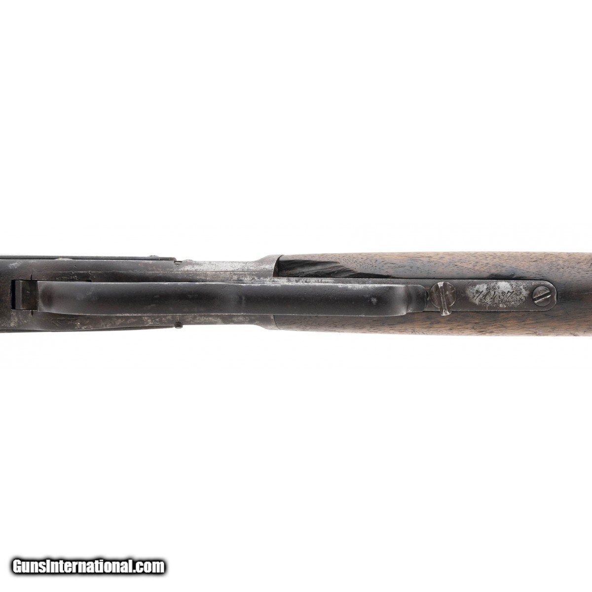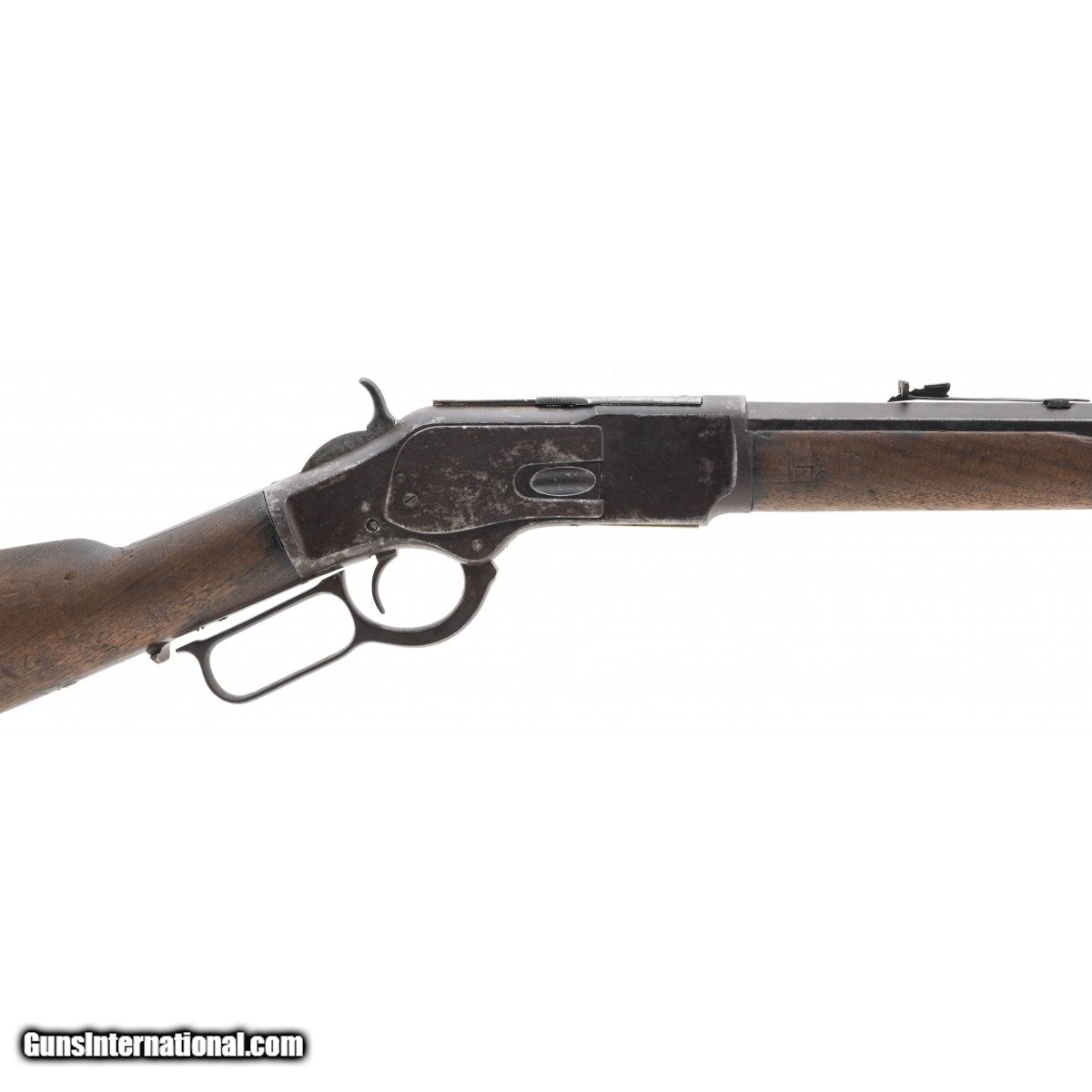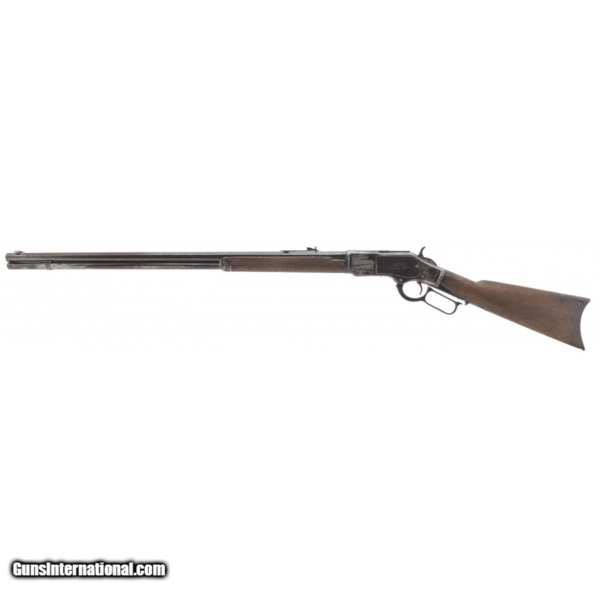 SN:74437. Special order 1873 with extra long barrel (30""). Manufactured in 1878. Metal has a brown and grey patina. Action works properly. Bore has strong rifling with pitting. Forearm has a chip and a crack that will need repair. Butt stock has a chip by tang. Butt plate is missing the cleaning rod door. Fair overall condition. An honest 1873 special order extra long rifle.