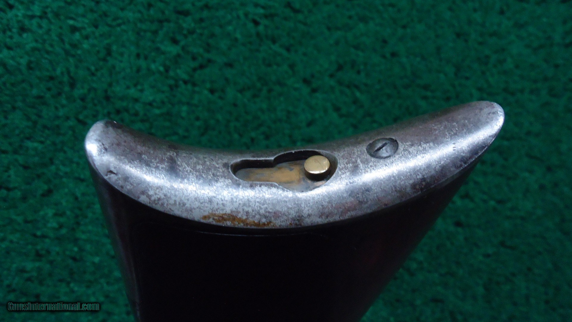 Description: Standard 24 inch octagon barrel chambered in the original 44 WCF caliber with full length mag tube. Features a good bore with strong rifling as well as light roughness scattered throughout. Blade front and a standard sporting rear sights. All metal surfaces have toned to a gunmetal gray/brown patina. Loading gate still retains most of its fire blue. Thumb print dust cover. Good markings. Special order Set Trigger that works although the head of the adjustment screw has broken off. Lever latch appears to be modified with small wings to make it easier to turn. Straight grain walnuts look and fit well. Just the usual light handling mars. A good example of an early Model 1873 rifle made in 1876. Leroy Merz Antique Firearms specializes in antique and vintage Winchesters and other fine American firearms. Since 1965 Mr. Merz has taken part in the world of firearms and has been a contributor to many well known reference books. We have hundreds of additional guns in every price range at our home online. Search for Merz Antiques in google. SOLD Antique: Yes Rifle Caliber: .44-40 Winchester |