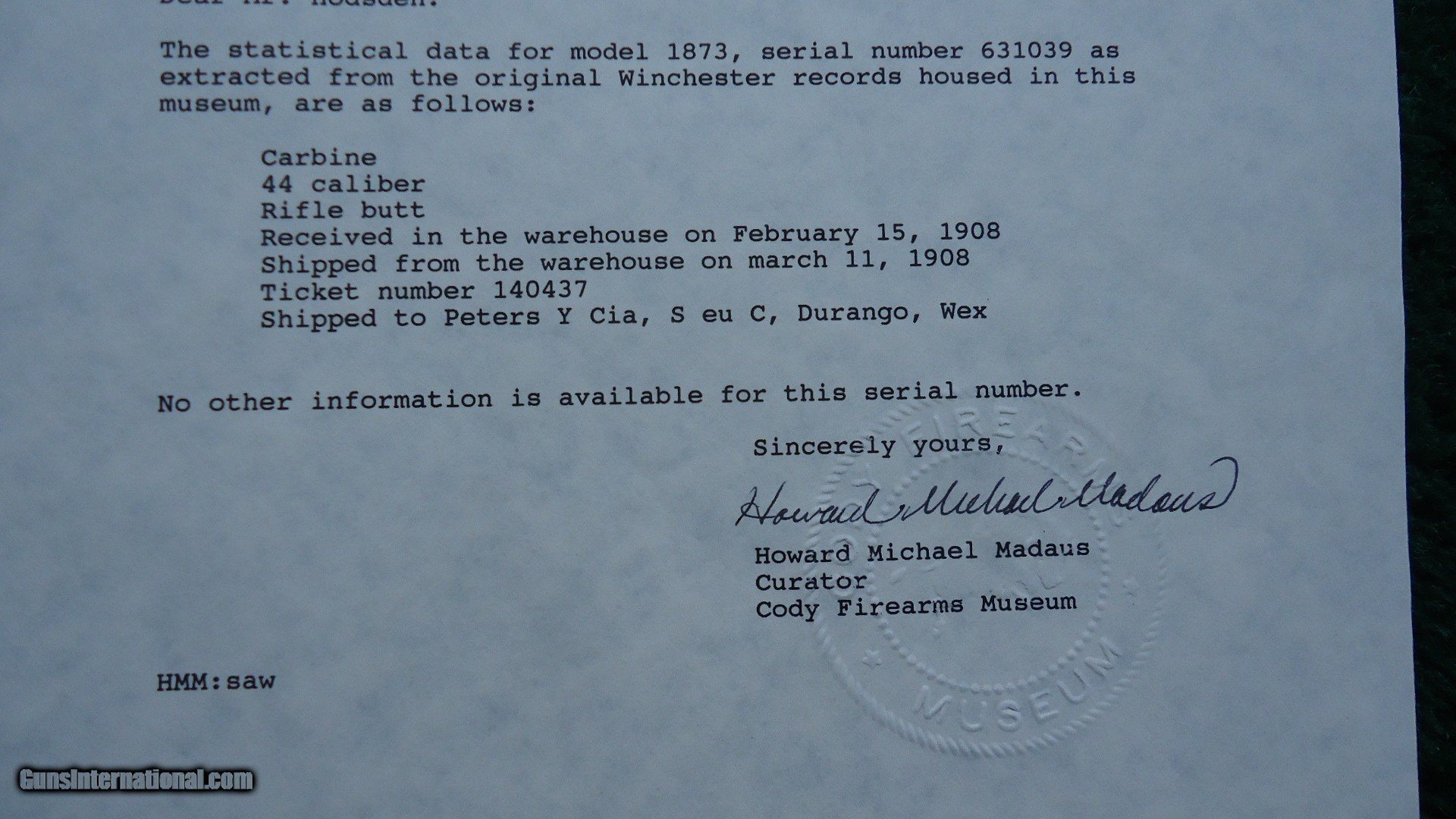 *Sale Pending* - WINCHESTER MODEL 1873 CARBINE WITH SPECIAL ORDER RIFLE BUTT AND FACTORY LETTER IN 44 WCF