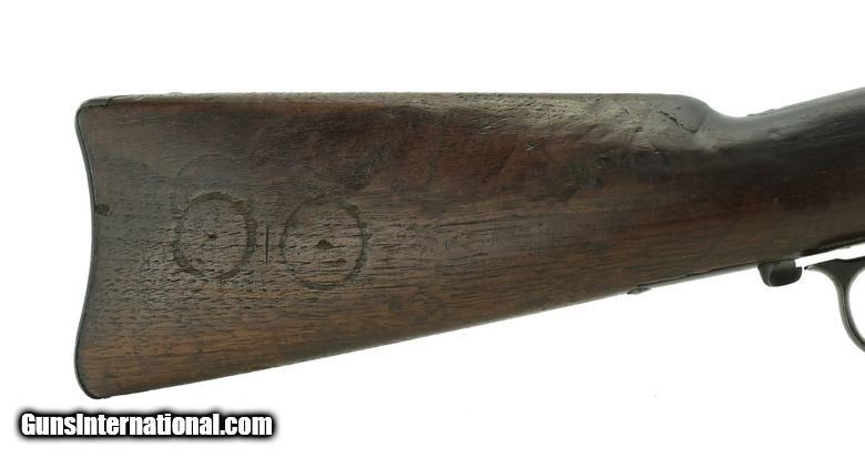 Description: Winchester Model 1873 Saddle Ring Carbine. Manufactured in 1888. Caliber .44-40. Bore has good rifling and medium corrosion in the grooves. Action works perfectly. The stock appears to have what may be a ranch brand. Looks like OO (double O) or possibly 88? The left side of the stock has additional carving. Very colorful ’73. SOLD Antique: Yes |