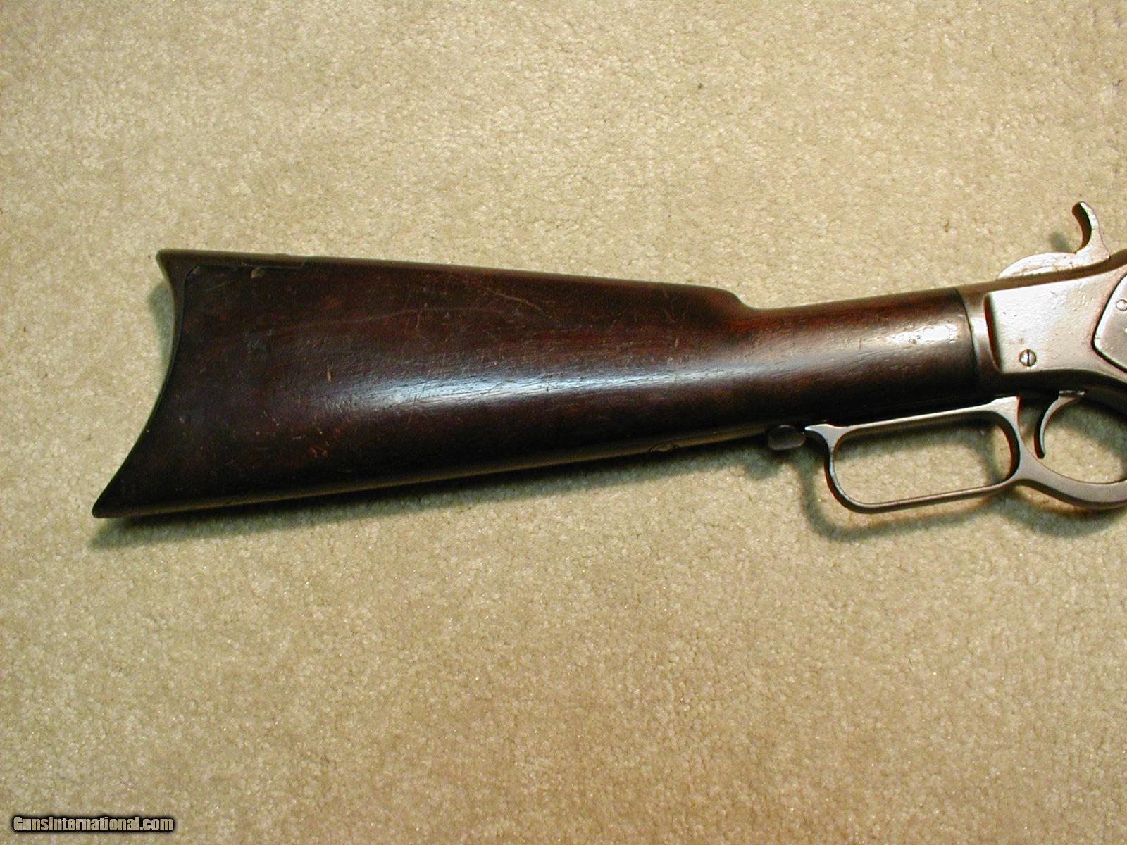Description: 1873 .32-20 OCTAGON RIFLE, MADE 1885, this is a very early manufacture date for the .32-20 as that caliber was introduced only in 1882 and came out of Arizona, an honest uncleaned aged brown barrel and mag tube with some traces of blue in the protected areas, receiver is also an attractive aged brown patina with some blue on the loading gate, fine+ wood with some honest light saddle wear on the bottom of the forend ahead of the receiver, original dust cover- has some deep scratches toward the back end, minor- mellow uncleaned brass lifter with engraved caliber markings, tight action, bore is a little dark with good rifling and some light scattered roughness that ought to clean out better, original sights, correct original butt plate without the trap for cleaning rods as was only used for the .32-20 caliber rifles. SOLD Antique: Yes Manufacturer: Winchester Model: 1873 oct. rifle Serial Number: 196XXX Caliber Info: .32-20 Condition: VG+ Barrels: 24" oct |
