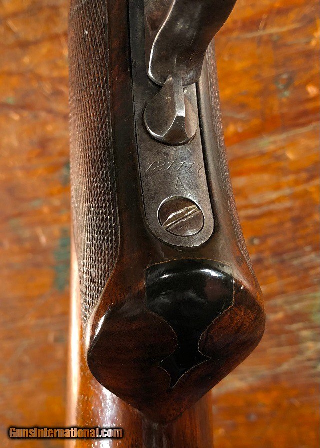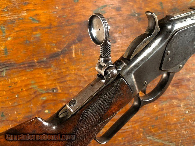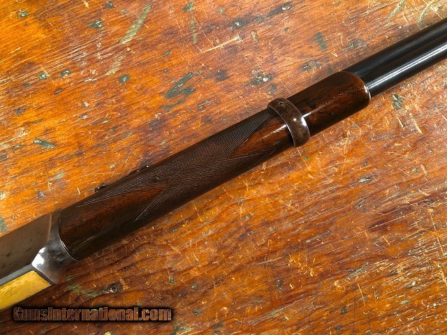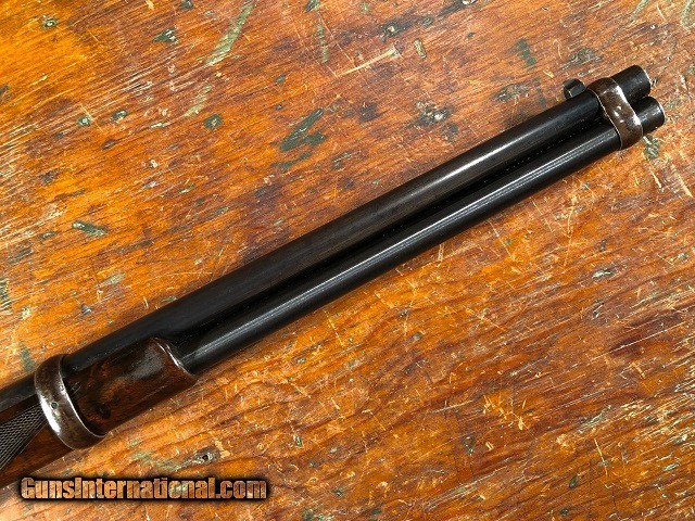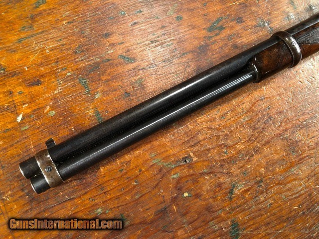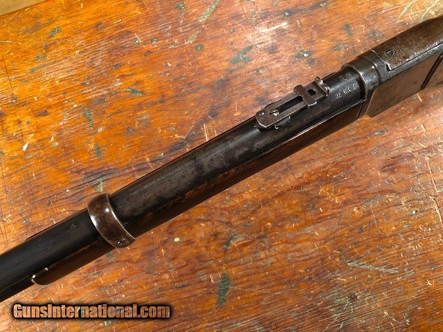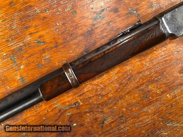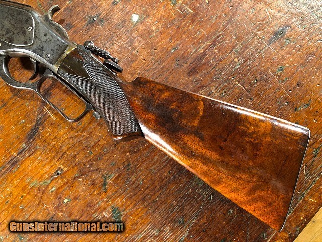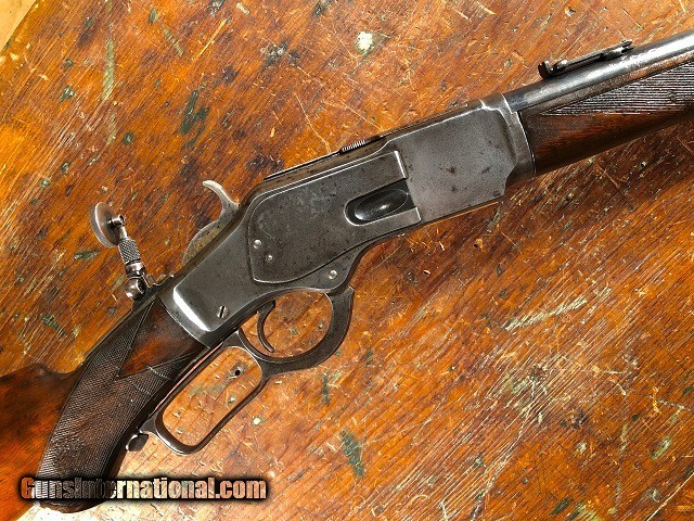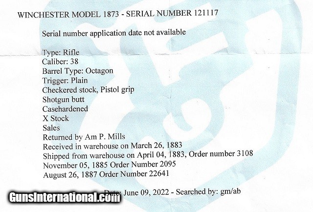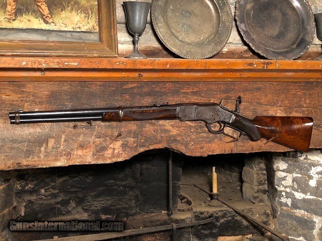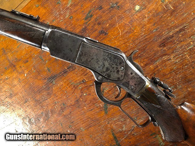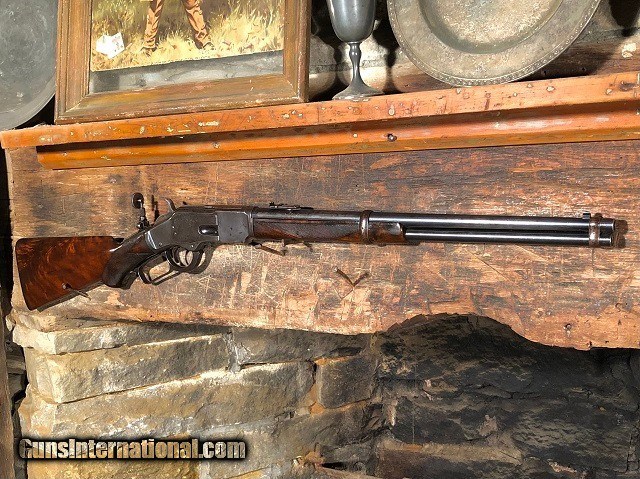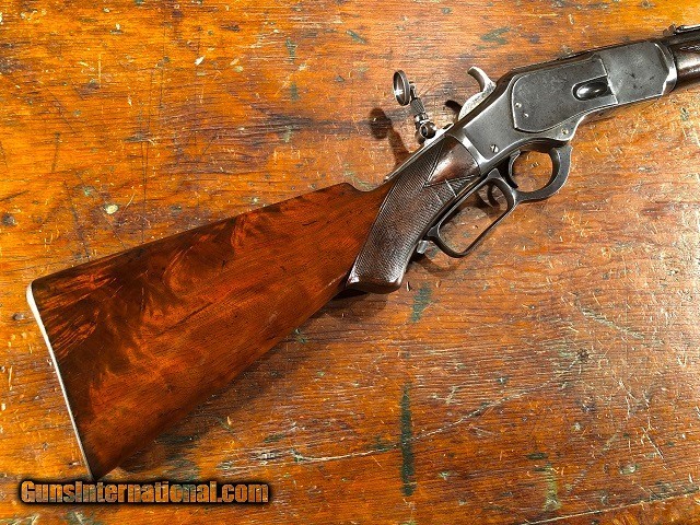 Description: *SALE PENDING* Rare & Intriguing Promotional Exhibition Display Model 1873 Winchester Deluxe Lever Action Rifle/Carbine with Case Hardened Frame, Fancy Checkered Pistol Grip Stock, Shotgun Butt, Tang Sight, & Mail Order Barrel, .38-40 WCF, mfg. 1883. This is a really neat Winchester that was specially made as an exhibition showpiece for American Powder Mills and subsequently converted into a carbine during the first quarter of the 20th century utilizing a Winchester factory mail order 20" barrel with correct carbine sights and barrel bands. Winchester factory records indicate the gun was originally ordered as an octagon barrel rifle in .38-40 caliber with plain trigger, checkered stock, pistol grip, shotgun butt, casehardened, X stock, sales, returned by Am. P. Mills, received in warehouse March 26 1883, shipped April 4 1883, (return) November 5 1885, (return) August 26 1887. American Powder Mills was a premier gunpowder manufacturer in Massachusetts founded in 1883 which Winchester used extensively for their ammunition. American Powder Mills did have several "test" guns on hand at their factory for experimenting with cartridge loads however a photograph in the possession of the Maynard Historical Society shows that these were very plain rifles purchased purely for their functionality. Given the special order deluxe configuration of this gun, "Sales" noted in the records with multiple returns, and that fact that it was made during the company's inaugural year suggest that it was used as a showpiece for promotional display at conventions and exhibitions. The frame, lever, trigger, and hammer have turned mostly silver with some very faint whispers of mottled case color visible and stronger traces remaining on the hammer. There are a few small spots of superfine pinprick pitting scattered along the edges of the frame on the left side but overall the surfaces are smooth and edges sharp. The barrel and magazine tube retain 70% bright original bluing thinning along the top while the barrel bands have turned plum. The stock is beautifully figured and features a checkered pistolgrip and forearm with original ebony grip inlay. The forearm is the original which has been altered to carbine length with the correct band fitted in place of the original rifle nosecap. The wood has had a thin coat of varnish added and there are some repaired cracks on the left side of the wrist behind the frame with moderate edge loss along the right upper tang and a thin 1" sliver at the right lower tang. The wood-to-metal fit along the buttplate, forearm, and most of the lower tang remains very good. The very tip of the upper tang and the lower tang just behind the frame show repair work. Matching factory assembly number "910" marked on the lower tang, stock, and buttplate with "XX" additionally stamped on the lower tang. Crystal clear Winchester barrel address and upper tang model designation with serial number "121117 A" marked on the lower tang. The breech is boldly stamped "38 W.C.F." with Winchester's "WP" proof and the additional "P" proof mark indicating that the barrel was made by Winchester for mail order purchase and installation outside the factory. The mail order proof was introduced in 1912 and the model '73 was discontinued in 1919 with some guns assembled through 1923 so the barrel would have been ordered within this specific time frame. The "38 CAL" inscribed brass carrier is worn yet legible. Original hammer, trigger, lever, lever locking nut, screws, dust cover, post front sight, "1873" marked flip-up ladder rear sight, and adjustable tang sight with peep aperture. The action is crisp and functions perfectly. The carrier remains sharp, the lever snaps shut on it's own, and the dust cover opens and closes securely. Fairly bright bore with strong rifling and moderate fine blackpowder frosting throughout. A rare factory promotional Deluxe that is seldom encountered and will make a great historical addition to any Winchester collection. Jeremiah Johnson Trading sells antique firearms manufactured prior to 1899 and muzzleloading blackpowder reproductions only. For the purpose of these conditions the term "antique firearm" will hence include muzzleloading blackpowder reproductions. Buyers must be 21 years of age or older and have no felony convictions to purchase antique firearms. Antique firearms do not require Federal licensing and may be shipped directly to the buyer with the following exceptions. No antique firearms will be shipped to Washington D. C. or any of the five boroughs of New York City (or residents thereof). Some restrictions may apply to antique firearms shipped to California and will be noted in the item description if applicable. Any handgun (antique or muzzleloading blackpowder reproduction) shipped to New Jersey must ship to a licensed FFL holder. Any muzzleloading blackpowder reproduction rifle, shotgun, or handgun shipped to Illinois must ship to an FFL holder. No international sales of antique firearms which may fire conventional metallic cartridges or any reproductions regardless of ignition. Antique muzzleloaders, or antiques which fire obsolete cartridges, may be shipped internationally however it is the responsibility of the buyer to know and abide by their local laws and provide proof that the antique arm is legal to receive and own. Payment can be made by money order, banker's check, personal check, or credit card (no fees). Please allow 7-10 business days for clearance on personal checks. If paying by credit card please disregard 's auto-checkout and call us directly to process your order. If not satisfied with an item within 3 days of receiving it, simply return the item in the same condition as shipped for a full refund, minus return shipping costs. Cleaning, disassembly, or altering of a firearm in any way will void inspection privileges. Layaway may be allowed upon negotiation, but will void inspection privileges. Buyer pays actual shipping & insurance costs. 