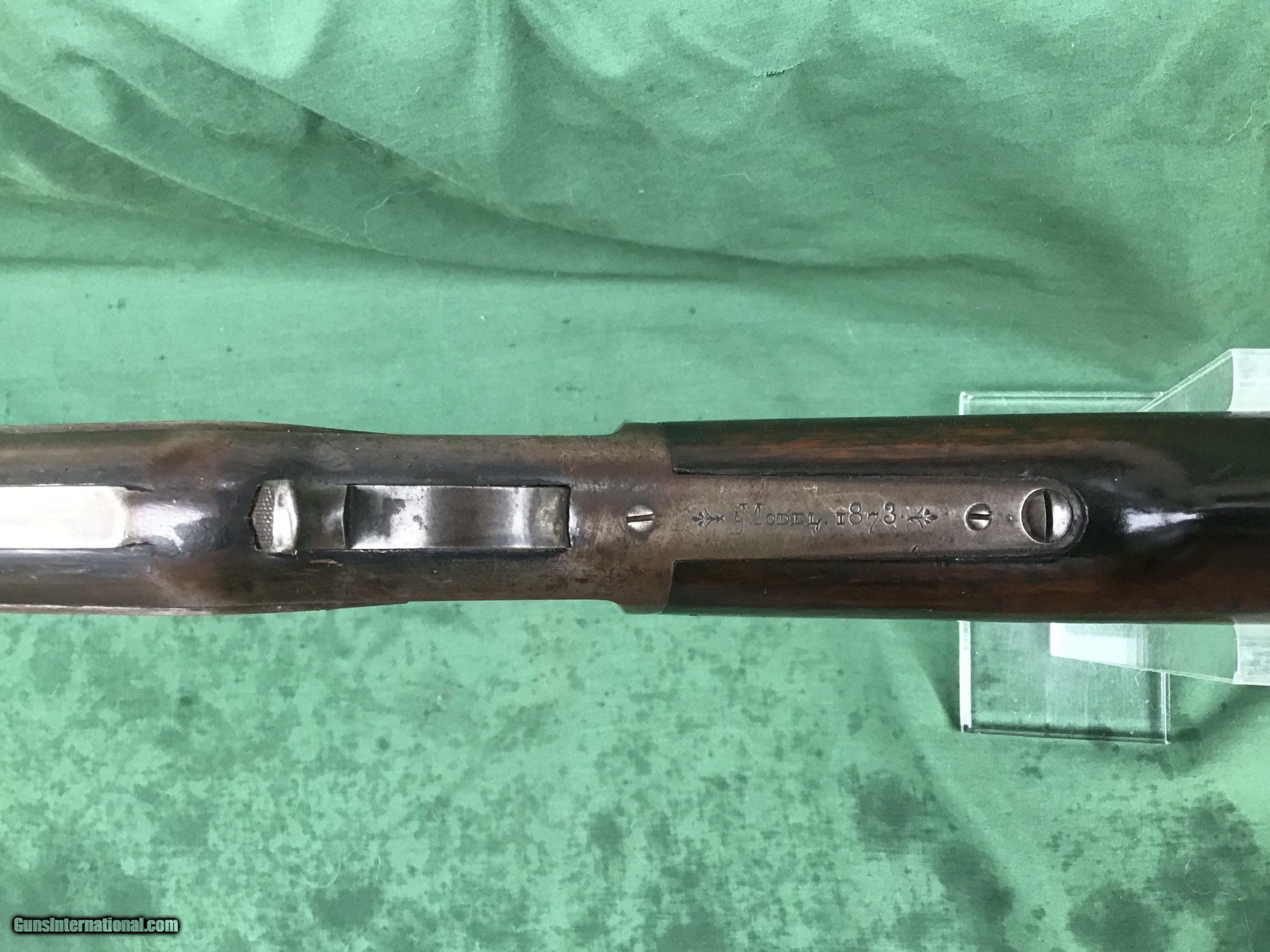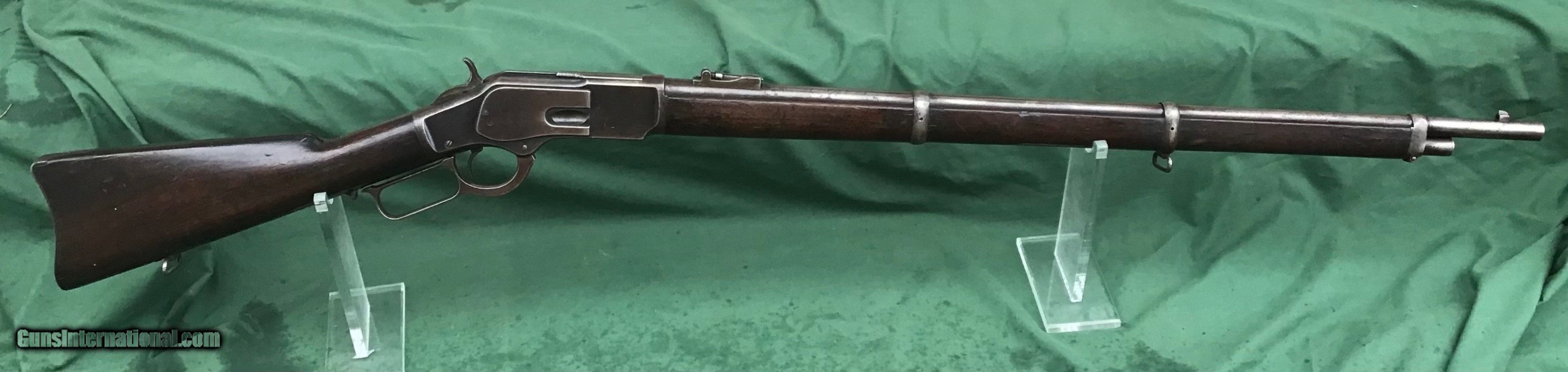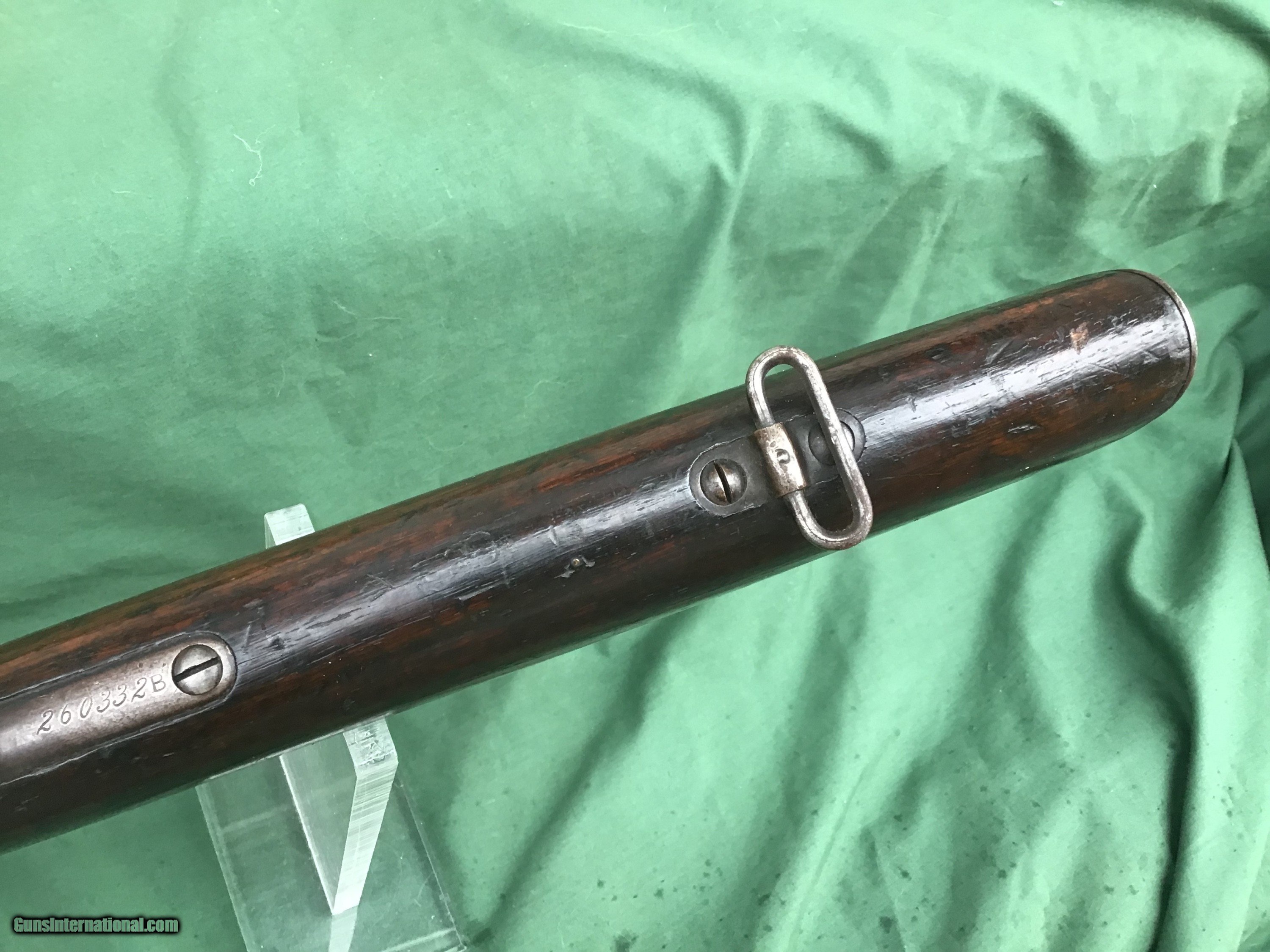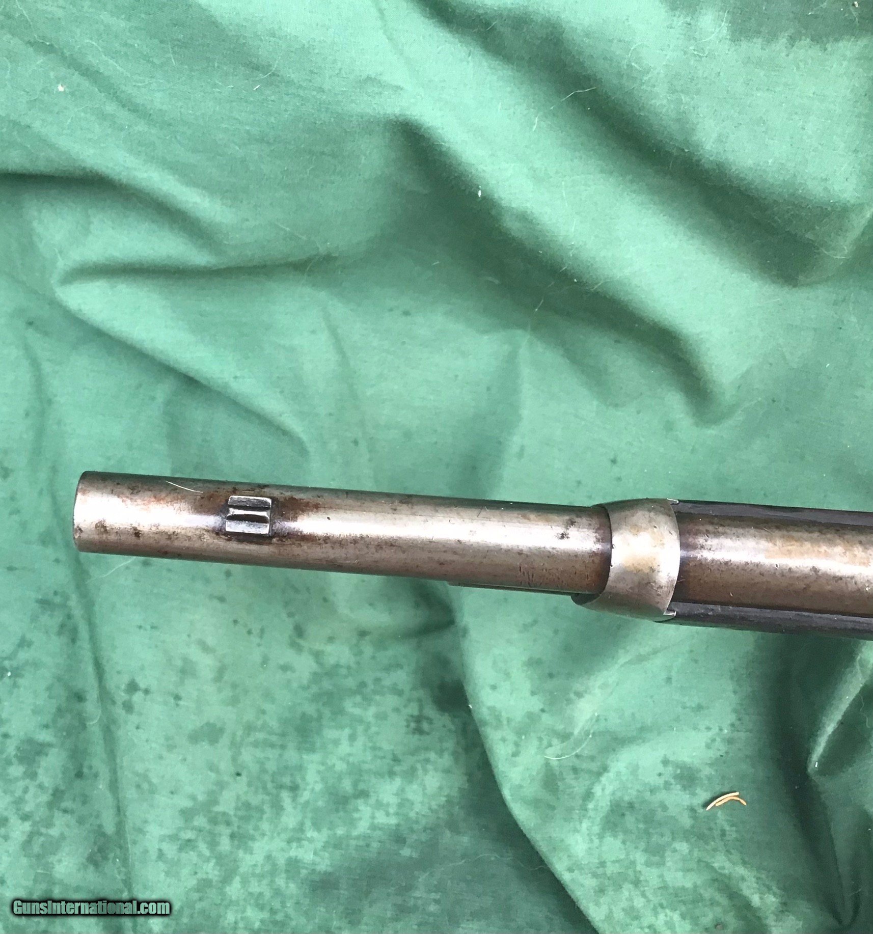Description: Model 1873 Winchester Musket. 3rd model manufactured in 1888. 44-40 with 30" barrel. Original sights and great markings. Action functions smoothly. Very nice bore, I will rate it a 7.5 / 8 on a scale from 1 to 10. Barrel retains original blue in protected areas and the remainder a gray / brown patina. Receiver retains 55-60% of its original finish. Both forend and buttstock are in good condition showing normal handling marks. All original and in above average condition. Please feel free to ask questions. SOLD Antique: Yes |