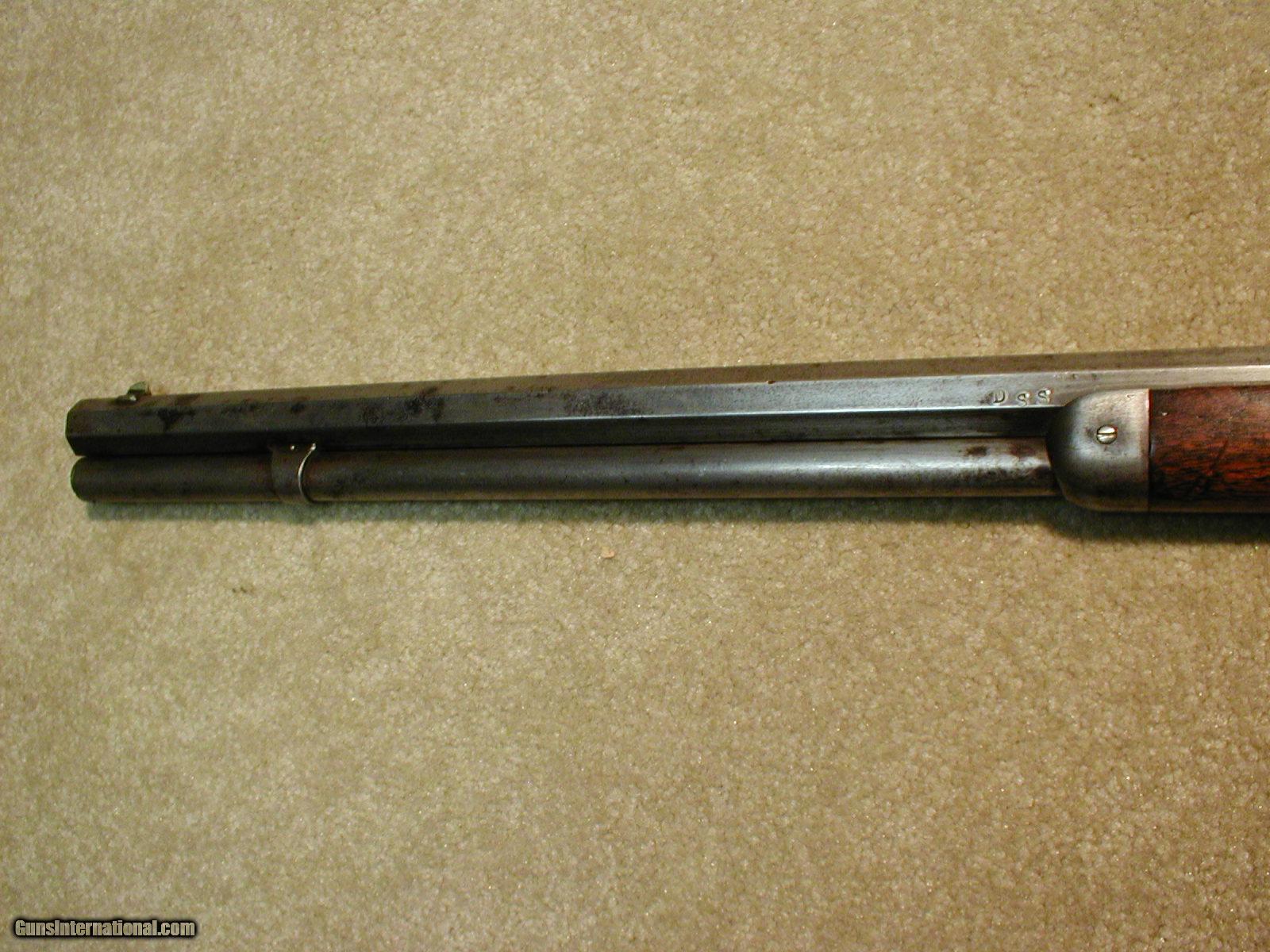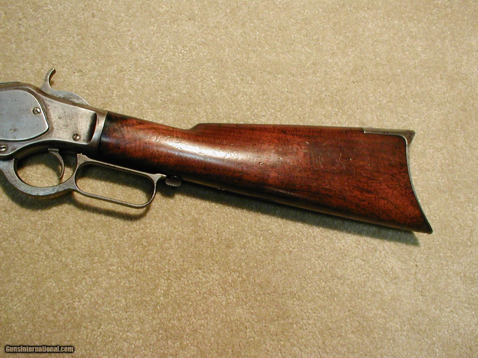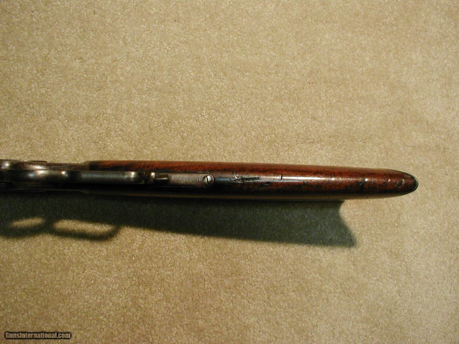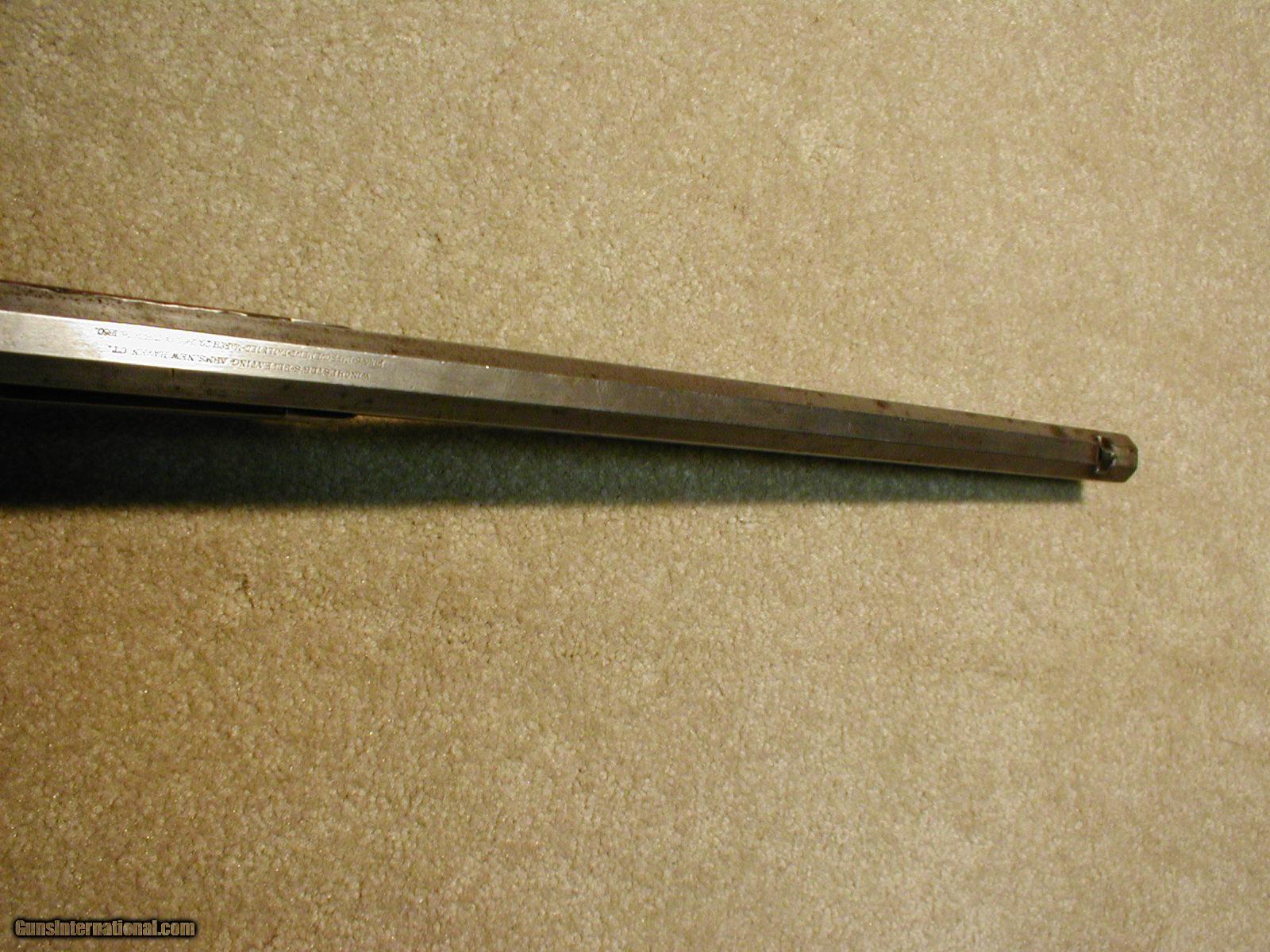 Description: CLASSIC 1873 .44-40 OCTAGON RIFLE, MADE 1886, a standard frontier rifle with fine+ butt stock that shows light handling only and tight wood to metal fit, forend shows a little more wear but still fine (what may look like a crack in the forend is simply a couple of old and worn in scratches), metal is mostly a gray color with some aged blue in protected areas and on the loading gate, original sights, bore is surprisingly decent with good rifling and some light scattered surface roughness and wear, the small letters "D.S.S." are stamped in the left side of the barrel ahead of the forend cap and on the left forward side of the receiver- meaning unknown- mellow brass lifter with "44 Cal" markings, sharp barrel and tang markings, original dust cover intact and working properly. SOLD Antique: Yes Manufacturer: Winchester Model: 1873 oct. rifle Serial Number: 196XXX Caliber Info: 44-40 Condition: VG Barrels: 24" oct |