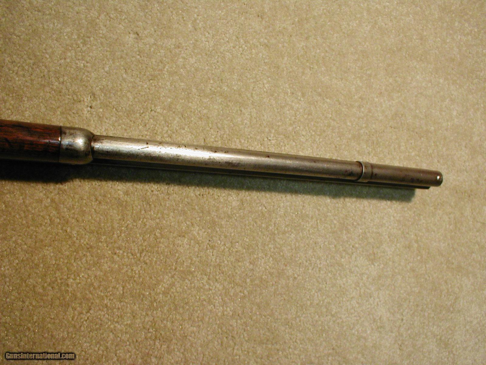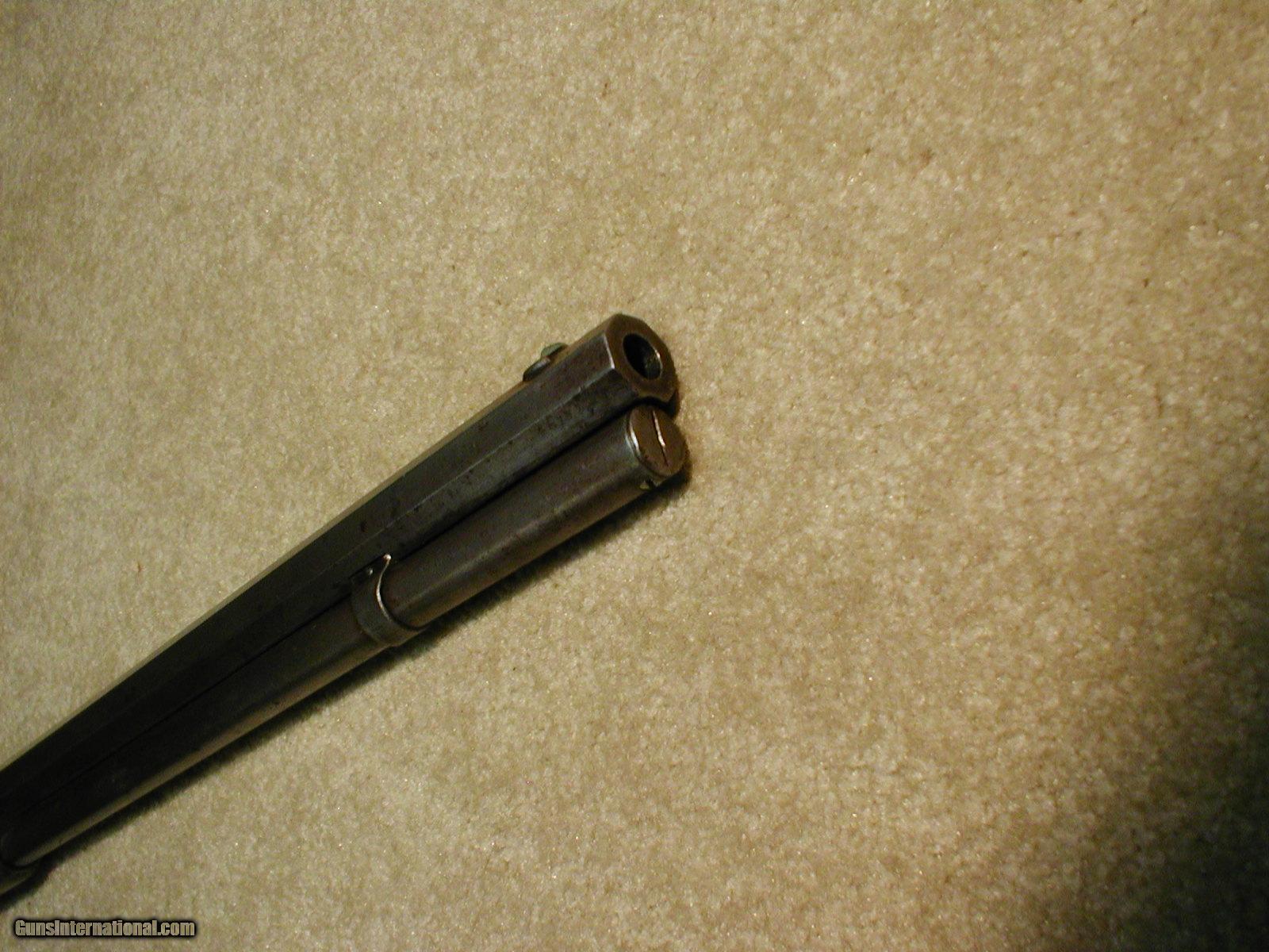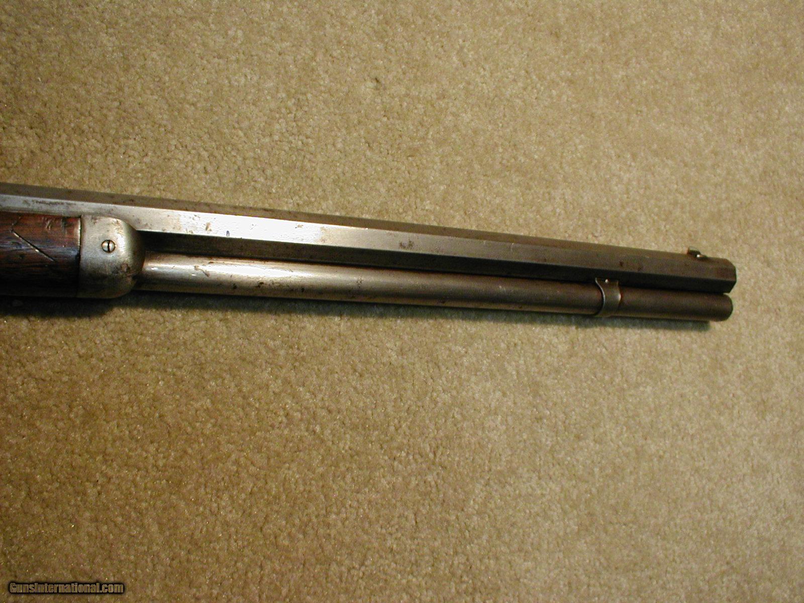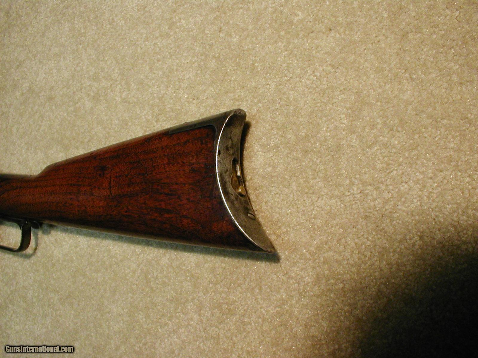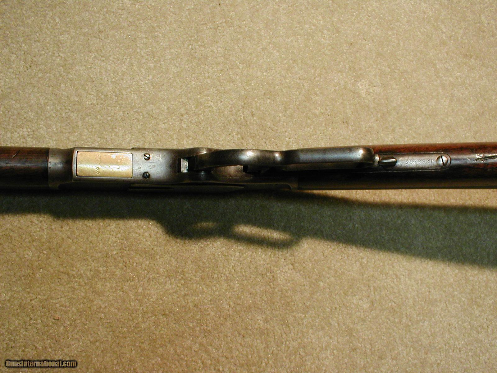 Description: CLASSIC 1873 .44-40 OCTAGON RIFLE, MADE 1886, a standard frontier rifle with fine+ butt stock that shows light handling only and tight wood to metal fit, forend shows a little more wear but still fine (what may look like a crack in the forend is simply a couple of old and worn in scratches), metal is mostly a gray color with some aged blue in protected areas and on the loading gate, original sights, bore is surprisingly decent with good rifling and some light scattered surface roughness and wear, the small letters "D.S.S." are stamped in the left side of the barrel ahead of the forend cap and on the left forward side of the receiver- meaning unknown- mellow brass lifter with "44 Cal" markings, sharp barrel and tang markings, original dust cover intact and working properly. SOLD Antique: Yes Manufacturer: Winchester Model: 1873 oct. rifle Serial Number: 196XXX Caliber Info: 44-40 Condition: VG Barrels: 24" oct |