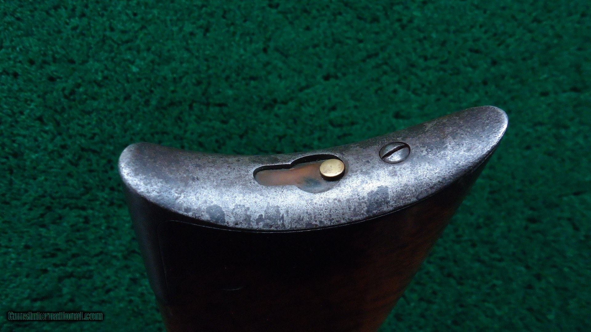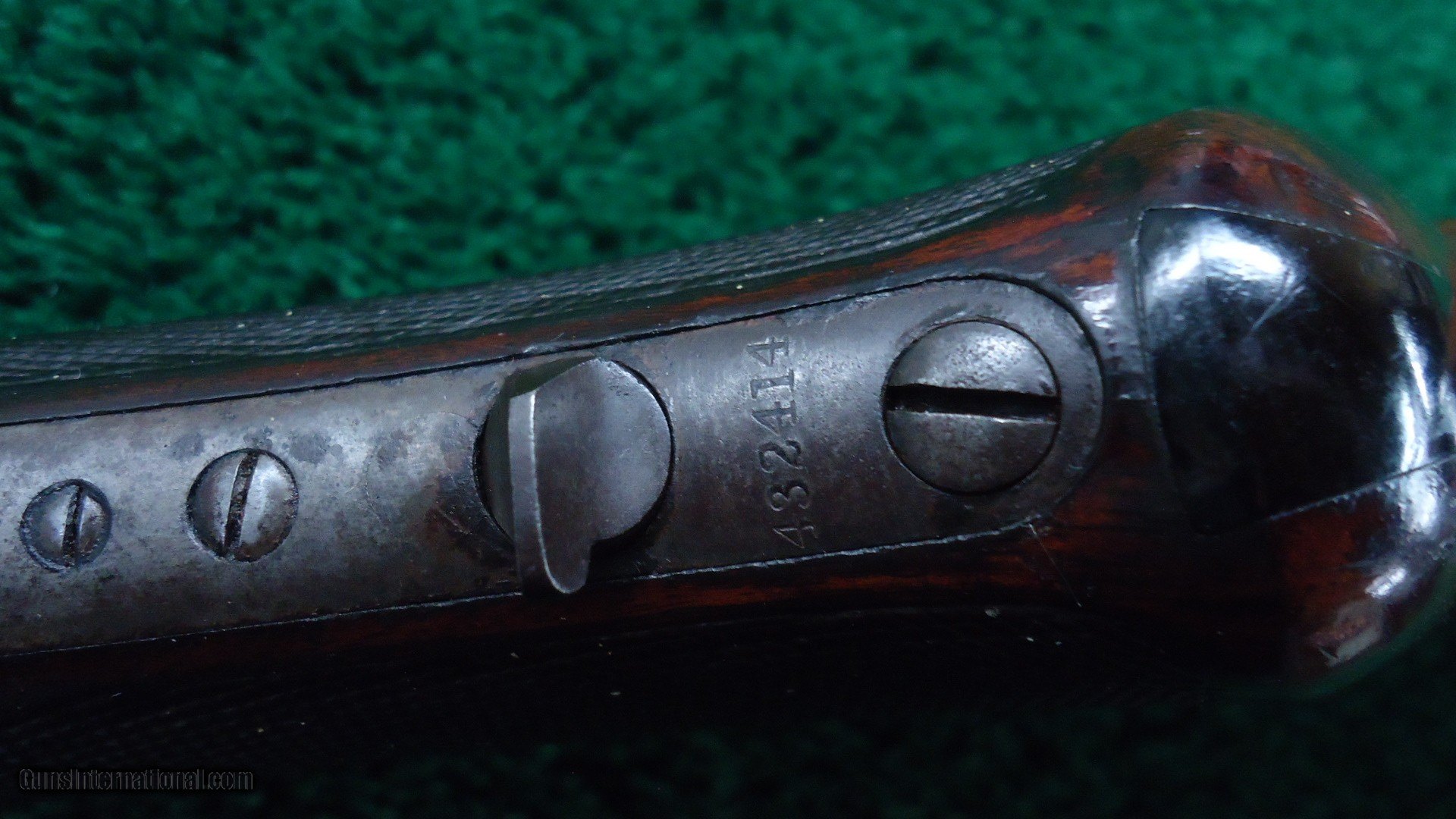 Description: 24 inch octagon barrel chambered in 38 WCF caliber with a full length mag tube. Deluxe checkered walnut stock with pistolgrip and crescent butt. Traces of the original case colors remain on the frame in protected areas as well as the hammer and lever. Barrel and mag tube are brown/gray patina as well as the forend cap. Some ever so light pitting on the bottom of the mag tube. Sights include a blade front and buckhorn rear. A nice bright shiny bore. Wood is in fine condition with some minor dings and scratches but looks good overall. Not a bad 3rd Model special order Deluxe 1873 rifle that was made in 1892. Leroy Merz Antique Firearms specializes in antique and vintage Winchesters and other fine American firearms. Since 1965 Mr. Merz has taken part in the world of firearms and has been a contributor to many well known reference books. We have hundreds of additional guns in every price range at our home online. Search for Merz Antiques in google. SOLD Antique: Yes Rifle Caliber: .38-40 Winchester |
