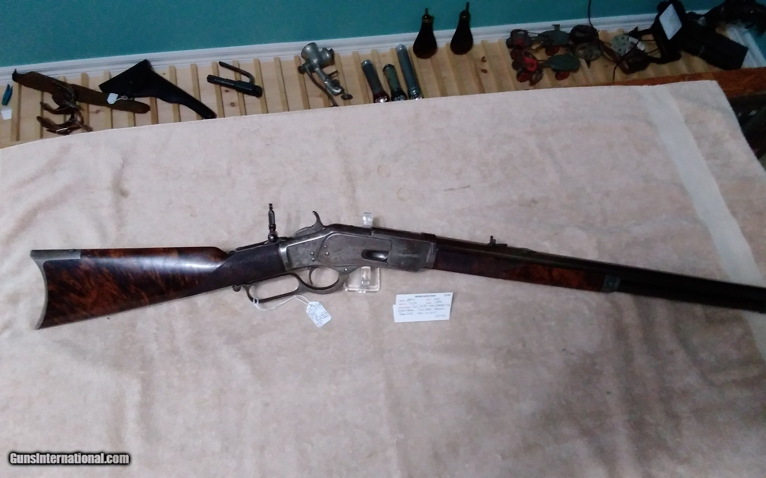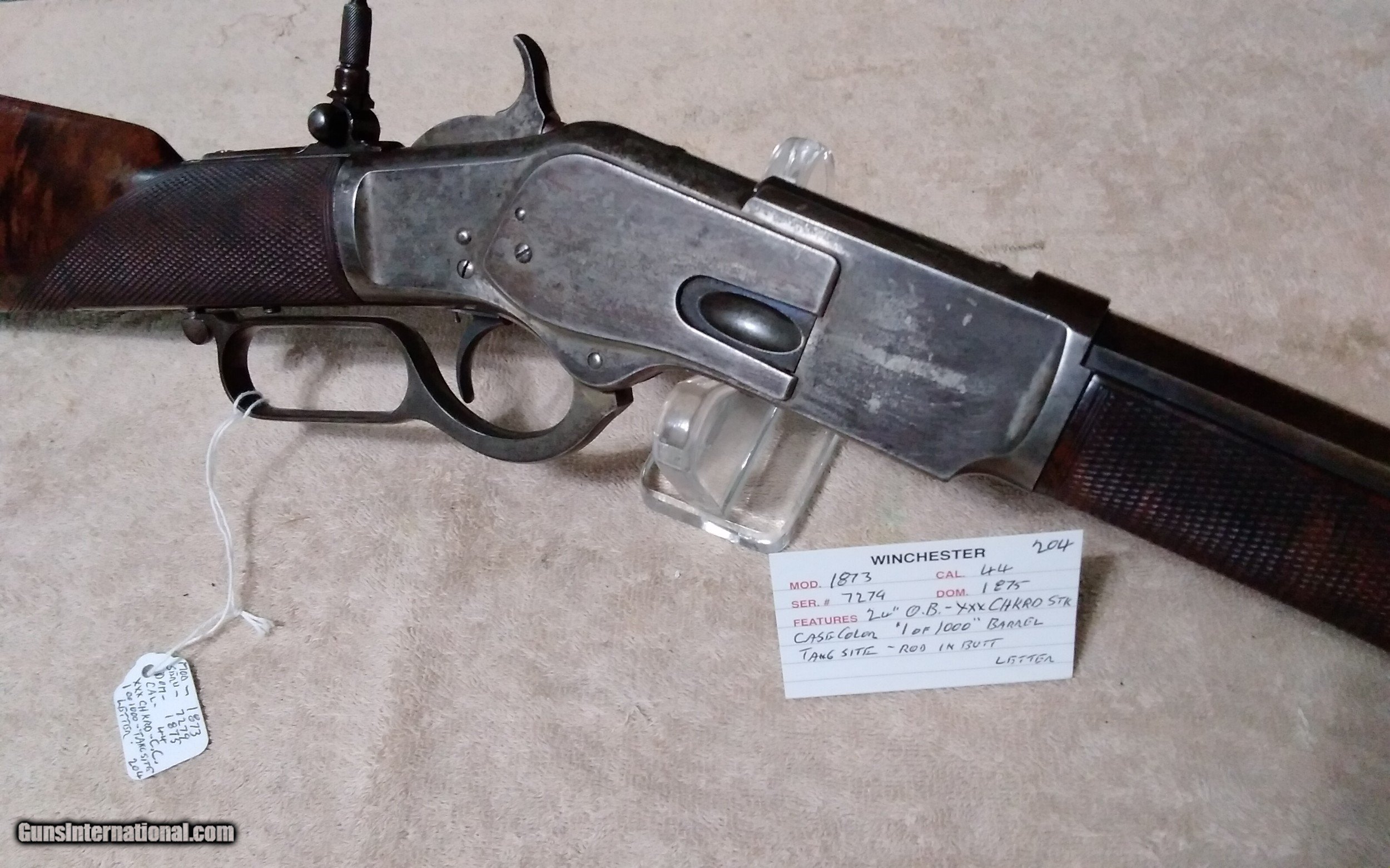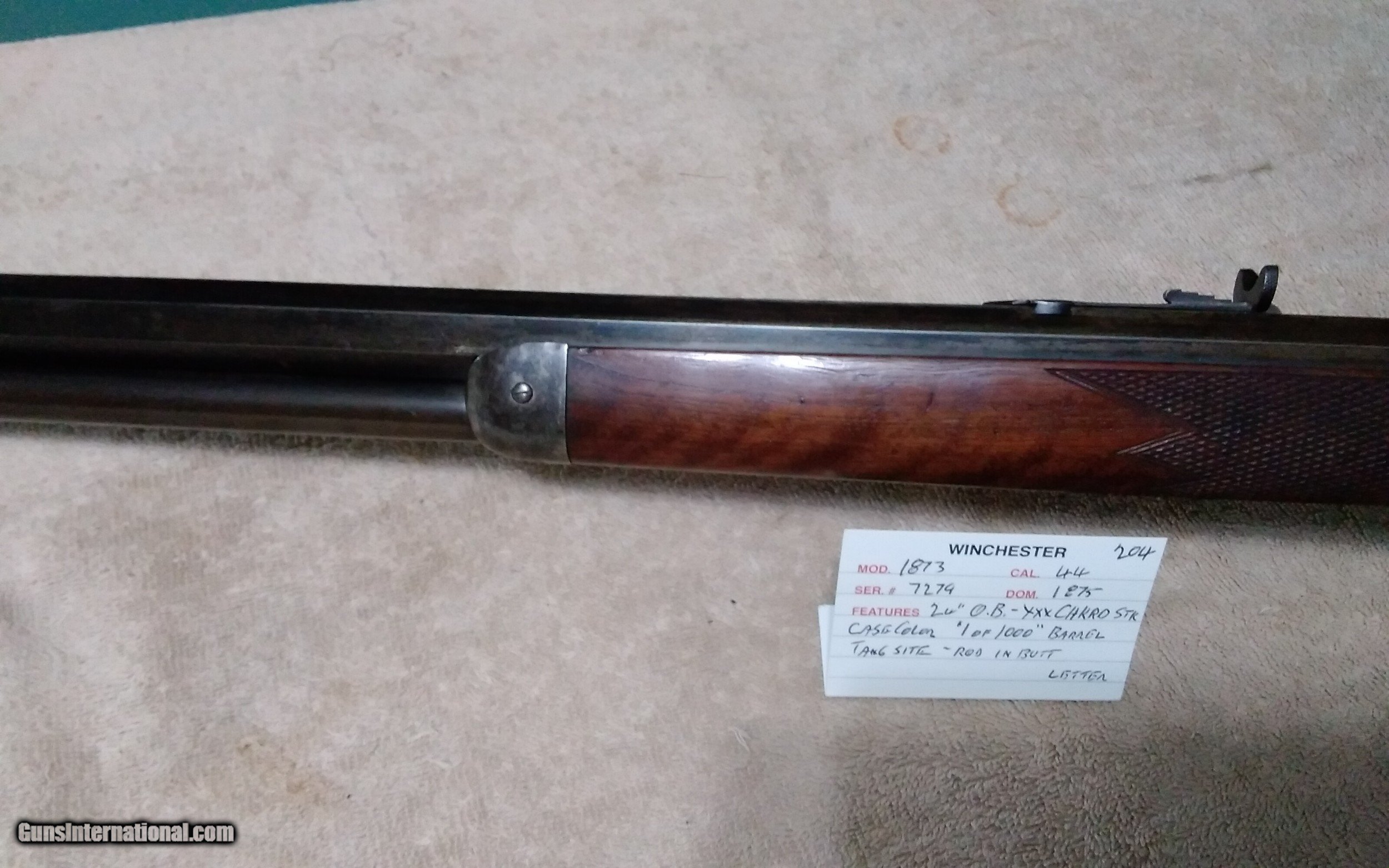 Description: SOLD SOLD SOLD I am offering this Deluxe 1st. mod. 1873 Winchester rifle. ser#7279 which falls right in the middle of several "1 of 1000" guns. Although This one does not letter as a 1 of 1000 , it is a fine deluxe 1st model and I guess the possibility is there. The gun was mfg.'d in 1875 with xxx checkered stocks , 24" oct. bbl. and case colored receiver, all the numbers match so nothing has been changed or added, however The tang sight may be an addition. There is lots of barrel blue remaining and the stocks are fine with no cracks or gouges. I can supply additional info and pics upon request. The gun is in Canada and I will look after all shipping or import fees etc. I am asking $28,000.00 shipped to Your door. I do offer a full money back refund on described condition. I am open to trades or offers.Call Harry at 519-522-1764 SOLD Antique: Yes Rifle Caliber: .44-40 Winchester Manufacturer: Winchester Model: 1873 Serial Number: 7279 Barrel Length: 24 Bore: shiny Condition: exc. Metal Condition: exc. Wood Condition: exc.+ Bore Condition: exc. Barrel Type: octagon Action: tight Triggers: set Stock: wood |