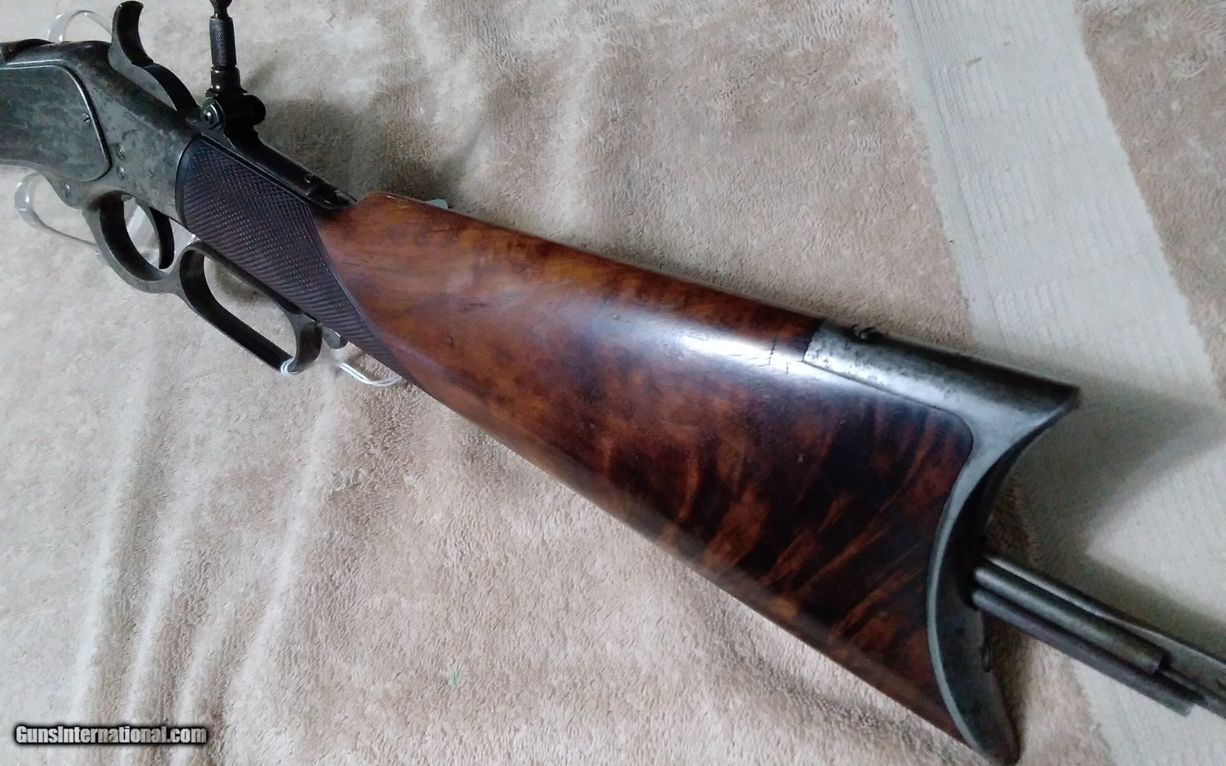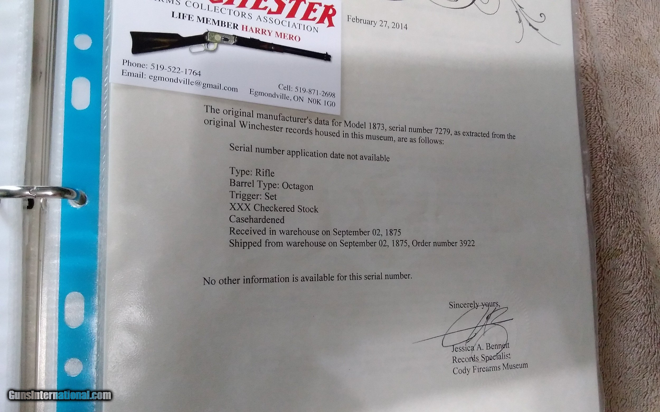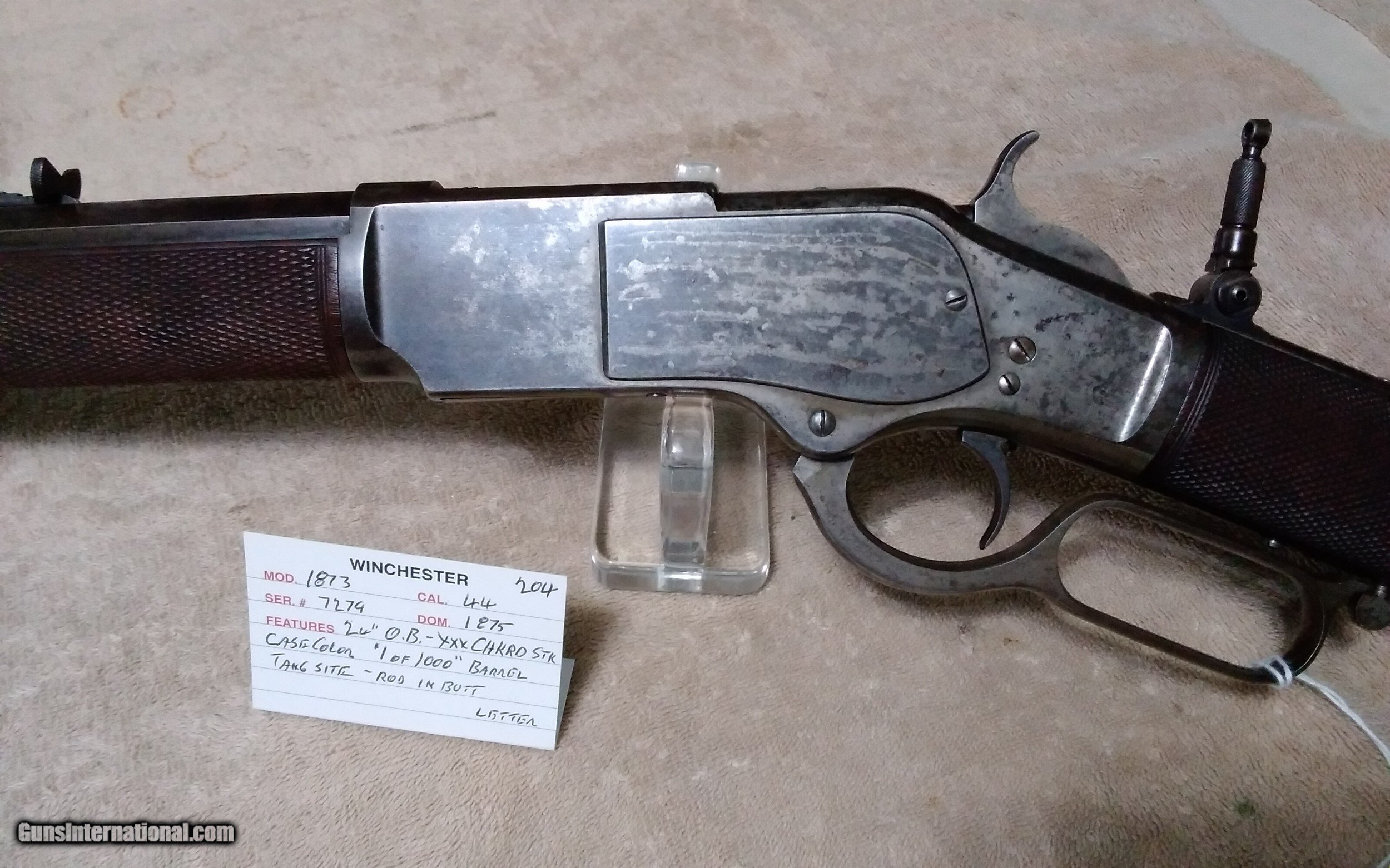 Description: SOLD SOLD SOLD I am offering this Deluxe 1st. mod. 1873 Winchester rifle. ser#7279 which falls right in the middle of several "1 of 1000" guns. Although This one does not letter as a 1 of 1000 , it is a fine deluxe 1st model and I guess the possibility is there. The gun was mfg.'d in 1875 with xxx checkered stocks , 24" oct. bbl. and case colored receiver, all the numbers match so nothing has been changed or added, however The tang sight may be an addition. There is lots of barrel blue remaining and the stocks are fine with no cracks or gouges. I can supply additional info and pics upon request. The gun is in Canada and I will look after all shipping or import fees etc. I am asking $28,000.00 shipped to Your door. I do offer a full money back refund on described condition. I am open to trades or offers.Call Harry at 519-522-1764 SOLD Antique: Yes Rifle Caliber: .44-40 Winchester Manufacturer: Winchester Model: 1873 Serial Number: 7279 Barrel Length: 24 Bore: shiny Condition: exc. Metal Condition: exc. Wood Condition: exc.+ Bore Condition: exc. Barrel Type: octagon Action: tight Triggers: set Stock: wood |