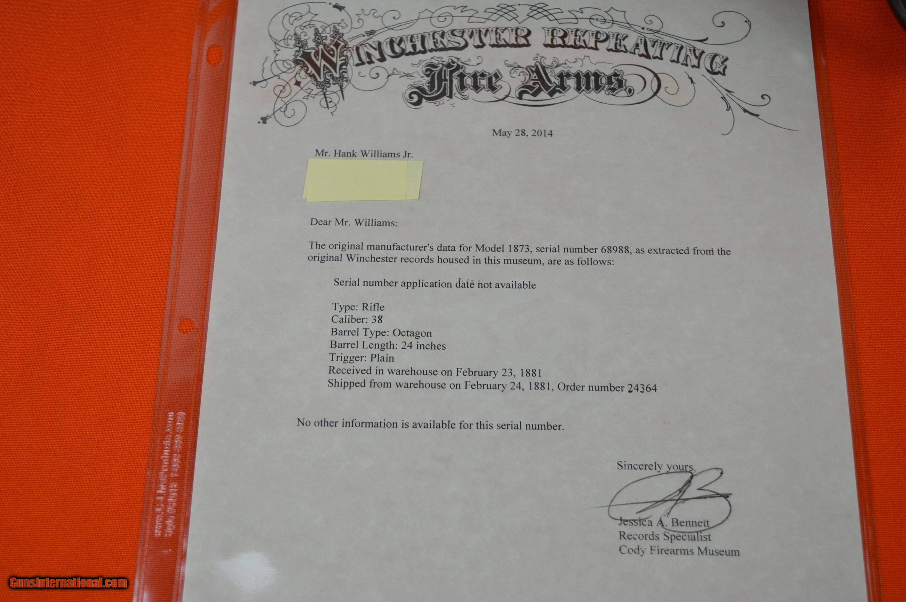 Hank Williams Jr Collection Winchester 1873 38-40 2nd Model with Winchester Letter, Shotgun Butt,24" Octagonal Barrel with Bright Bore, Mfg. 1881