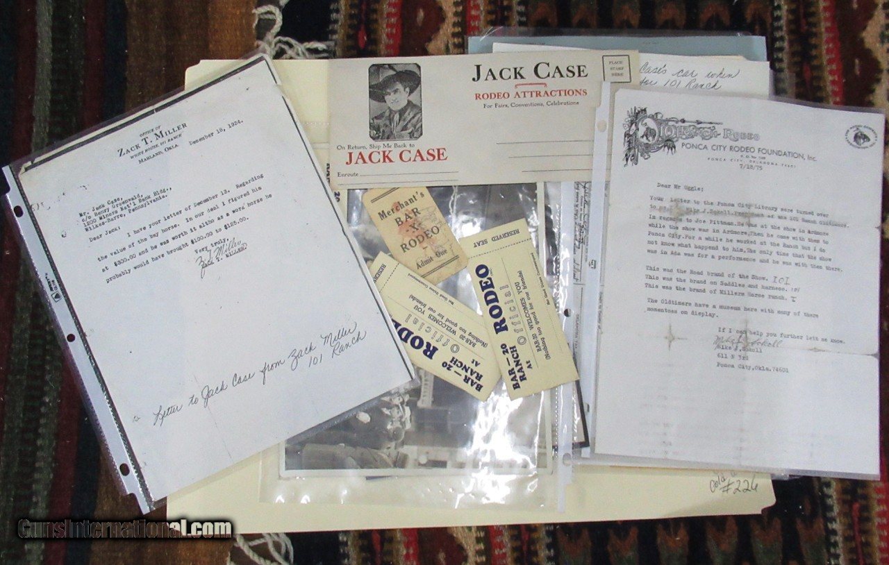 Description: 101 Ranch, Gold Plated Winchester Model 1873, SRC; Serial No. 461401B; Made 1893; .44-40 Caliber with a 20” Barrel; This SRC belonged to Jack Case who traveled all over the United States during and after the Great Depression, producing and performing in rodeo shows. He managed his own rodeo shows under the company name “Jack Case Rodeo Attractions” and later outfit as the “Bar-20 Ranch Rodeo”, whose appearances were sponsored by such organizations as the Family Welfare Agency, American Legion Posts, and regional Elk Lodges. Case was the assistant arena director of the Pendleton Round-Up in 1923 and went on to direct and perform in Buck Taylor’s Wild West Show at the Million Dollar Pier in Atlantic City, New Jersey. Case also performed with his friend Miller’s 101 Ranch Wild West Show, which toured all over America, and Case acted as manager of the 101 Ranch shows during their European tours in 1924 and 1926. This Winchester is a .44-40 caliber SRC with a 20” Barrel. The entire exterior is Gold washed or Gold plated except the dust cover, saddle ring, elevator, and door in the butt plate which are nickel. The barrel markings are light but readable. The rear sight is a flip up, ladder sight and the front sight is a standard blade. Stamped on the left side of the lower tang is “J. Case” which is not visible with the butt stock in place. The walnut butt stock is in good condition with gaps in the wood to metal fit. The forearm has a chip missing from either side in front of the frame. The action functions properly and the bore is dark. The lever return spring is not functioning properly. Affixed to the right side plate is a 25 cent token from the 101 Ranch store. This Winchester is accompanied by a large folder of personal photos, documents, flyers and personal correspondence from Jack Case. Jack was born Willard Luna Case, Sept. 3, 1902 in Edneyville, North Carolina, he disliked his name and started going by Jack or J.W. Case. There is no record of his death information but it is likely he died sometime in the last quarter of the 20th century. Also Accompanied by a Vintage Elgin, Open Face Pocket Watch. Marked on back “Ft. Worth, Tex. / Jack Case / 1928”, 17 Jewel, Serial No. 29176335, Silver Case, in Running Order. Accompanied by Personal items such as photographs, unused tickets to the “Bar-20 Ranch Rodeo”, copies of letters, copies of communications between Jack Case and Miller, photocopy of 1933 motor vehicle registration on a Studebaker Sedan that Jack used while working at the 101 Ranch. An 8x10 black and white photograph of Jack Case and group of people in front of the Fort Durkee Hotel, business card from Upland Riding Academy, J.W. Case Prop., and other personal documents and membership cards. One of the Best Items Coming From the 101 Ranch Collection of Buddy King, Canadian, Texas; See All Photos for Condition; No Texts; Call (254)541-5765 or Email Only; PERSONAL PROPERTY of Harold Wieser; Price: $6,975 + $75 S&H Via USPS PRIORITY MAIL; Payment Address: Harold Wieser - 1466 U.S. Hwy 77 - Rosebud, TX 76570; SEND PAYMENTS VIA USPS PRIORITY MAIL; BEWARE of SCAMS!!! – DO NOT SEND MONEY or CORRESPONDENTS ELECTRONICALLY UNLESS YOU HAVE SPOKEN to HAROLD WIESER FIRST! 254-541-5765 SOLD Antique: Yes Manufacturer: Winchester Model: 1873 Serial Number: 461401B |