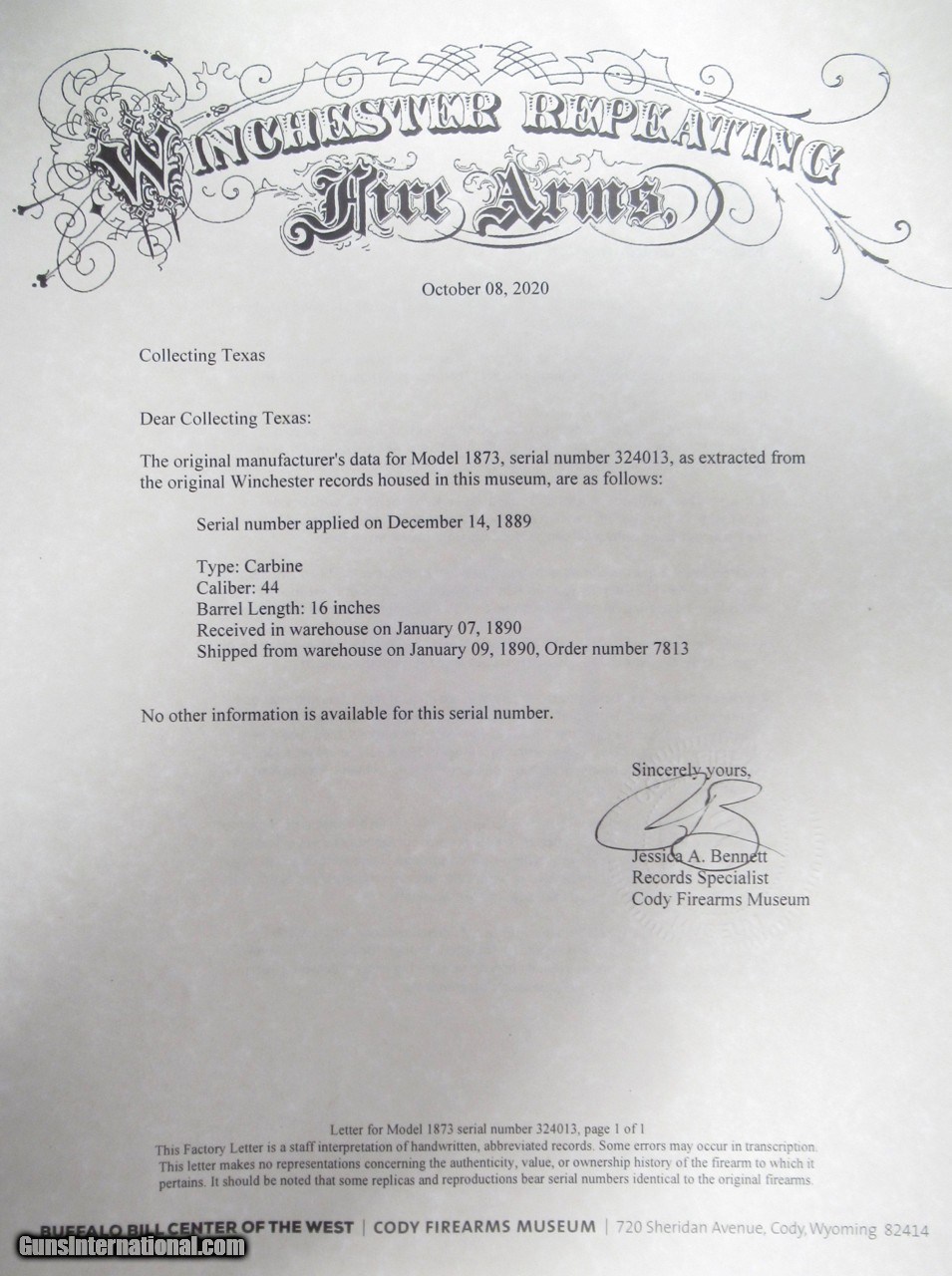 Description: Winchester Model 1873 Trapper Rifle; Serial No. 324013; 44/40 Caliber; Rare Original 16” Barrel; Shipped January 9, 1890 with Special Order #7813; No original finish remains; Markings Good; 100% Correct and Original; Good Action; Strong Bore with moderate even frosting throughout; 132 Year-Old Original Winchester Trapper out of Alpine, Texas; Note: Lower tang bent, does not affect function; See All Photos for Condition; No Texts; Call (254)541-5765 or Email Only; PERSONAL PROPERTY of Harold Wieser; Price: $5,500 + $75 S&H Via USPS PRIORITY MAIL; Payment Address: Harold Wieser - 1466 U.S. Hwy 77 - Rosebud, TX 76570; SEND PAYMENTS VIA USPS PRIORITY MAIL; SOLD Antique: Yes Manufacturer: Winchester Model: 1873 Trapper Serial Number: 324013 |
