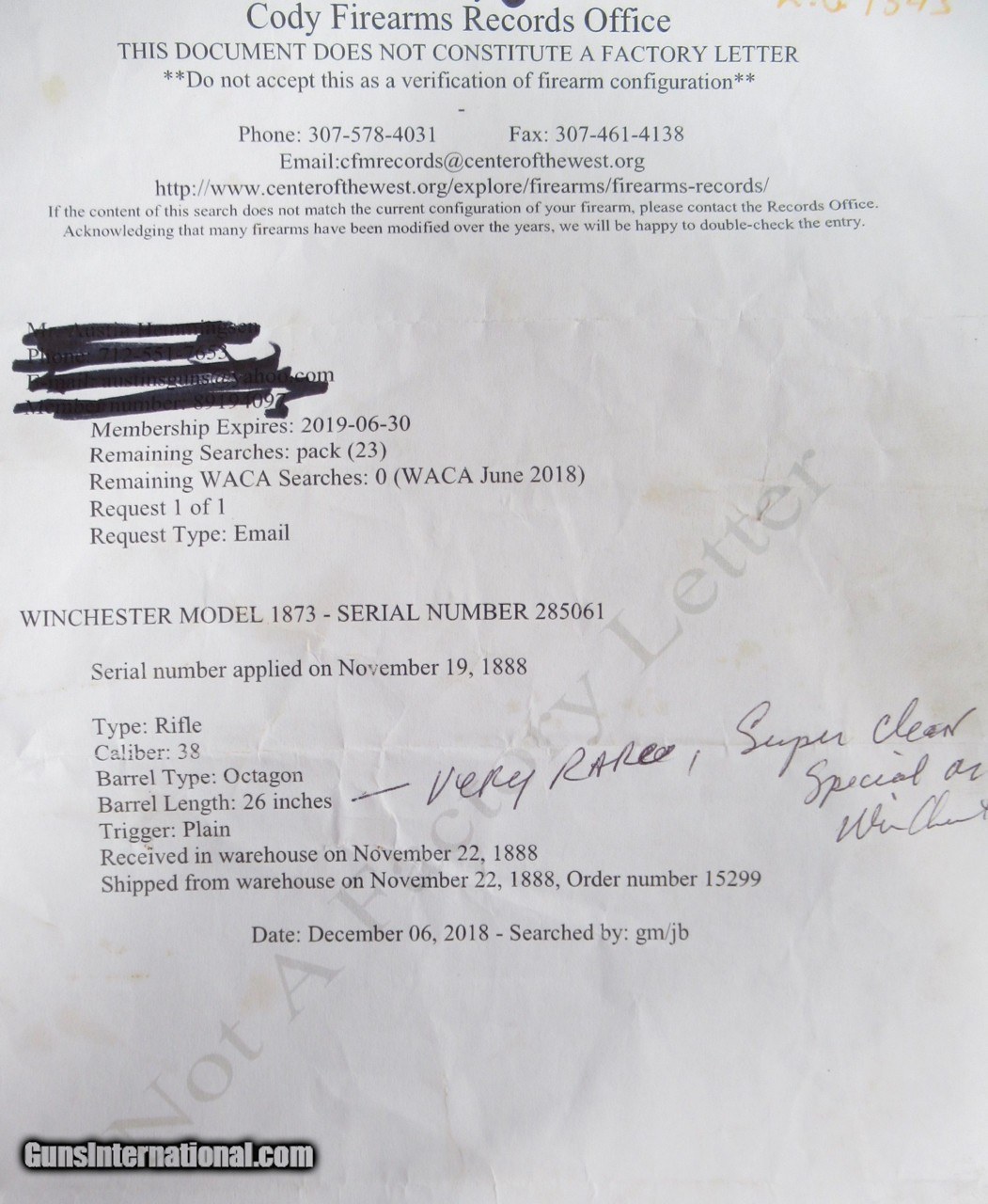 NICE SPECIAL ORDER MODEL 1873 WINCHESTER RIFLE SHIPPED 1888 from COLLECTING TEXAS – 38 W.C.F with EXTRA LONG 26” BARREL