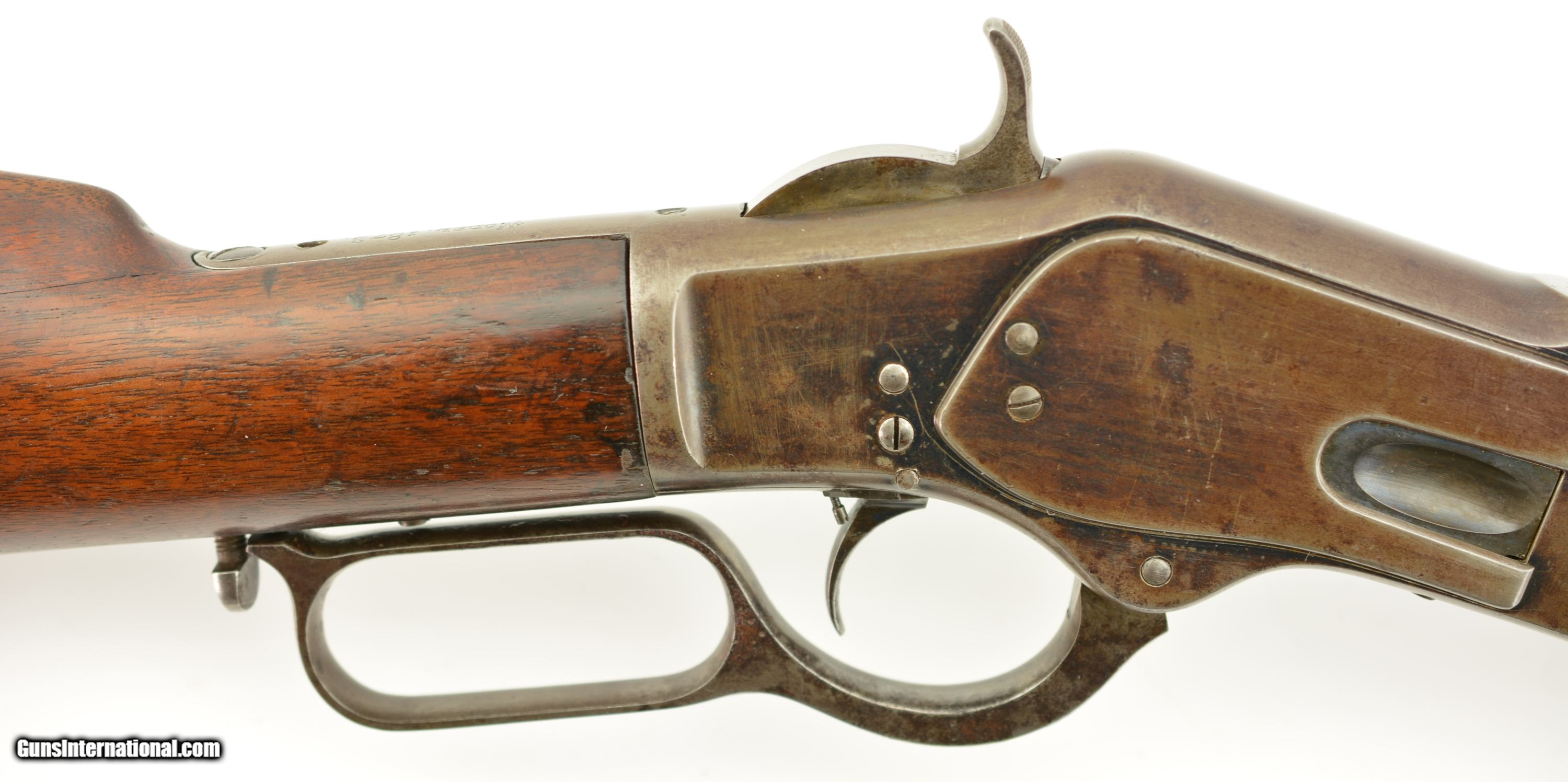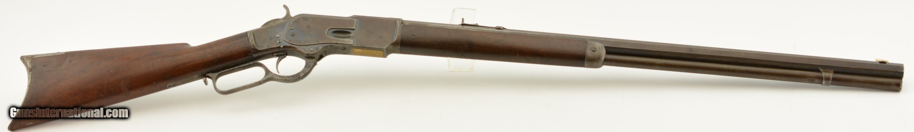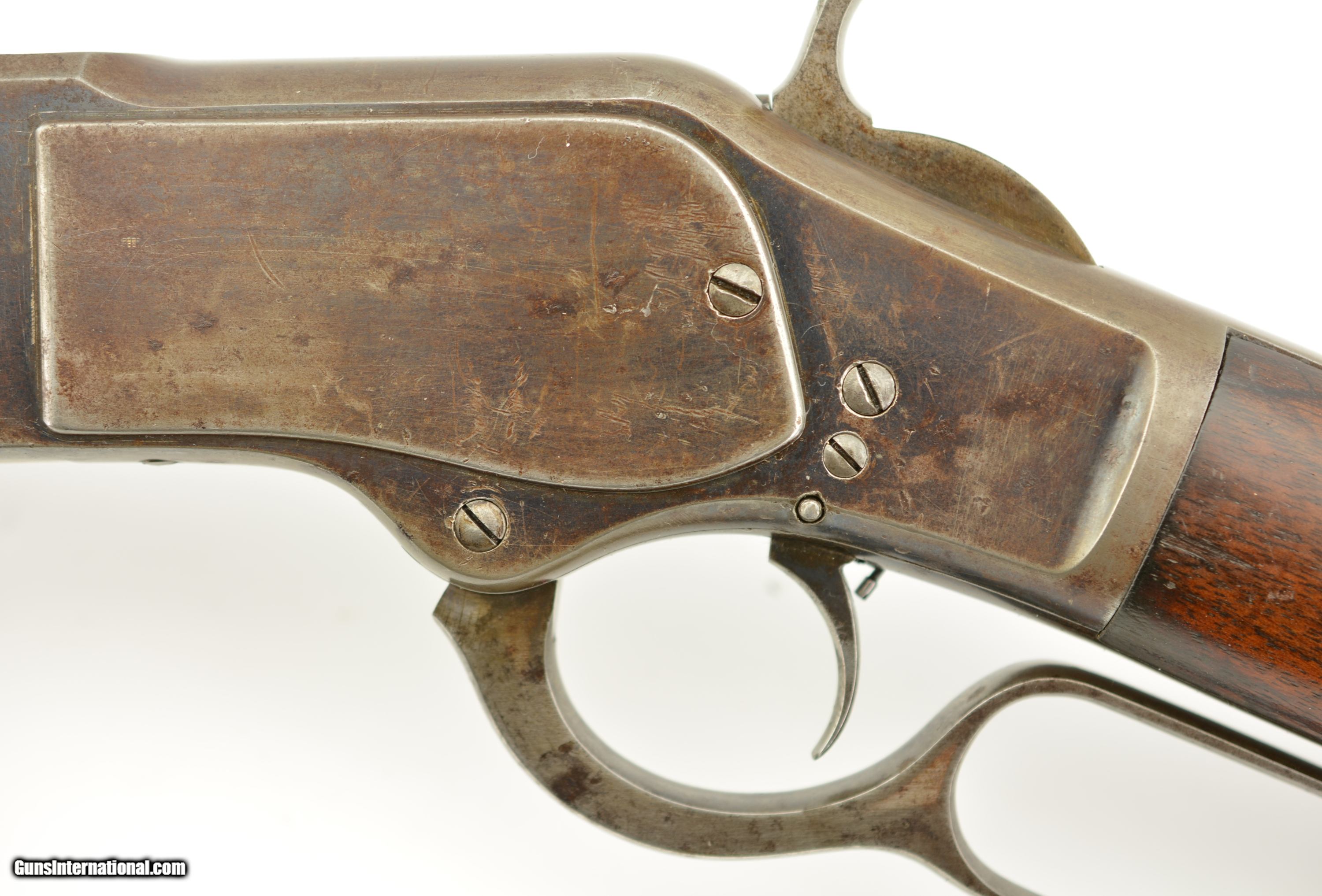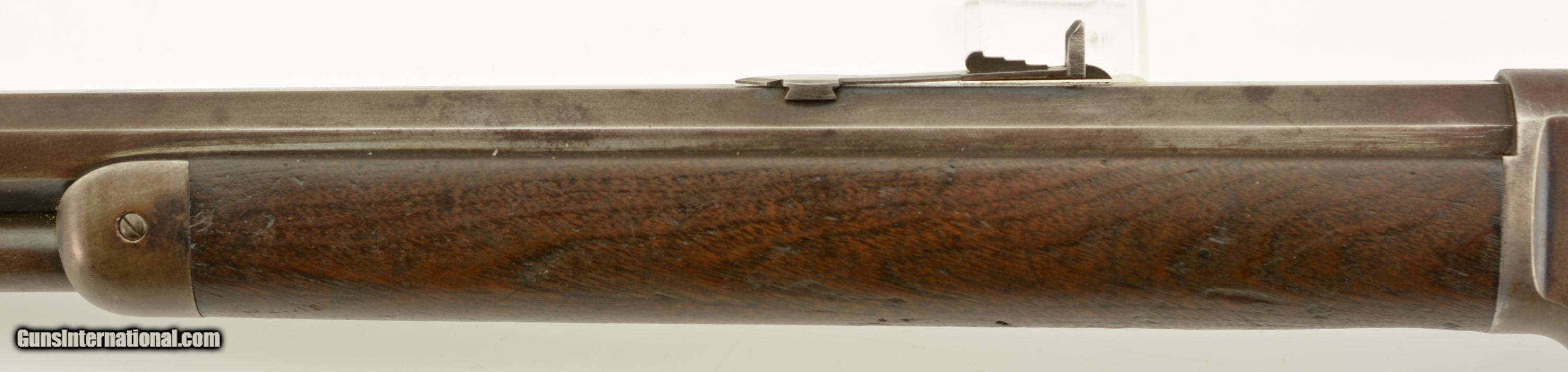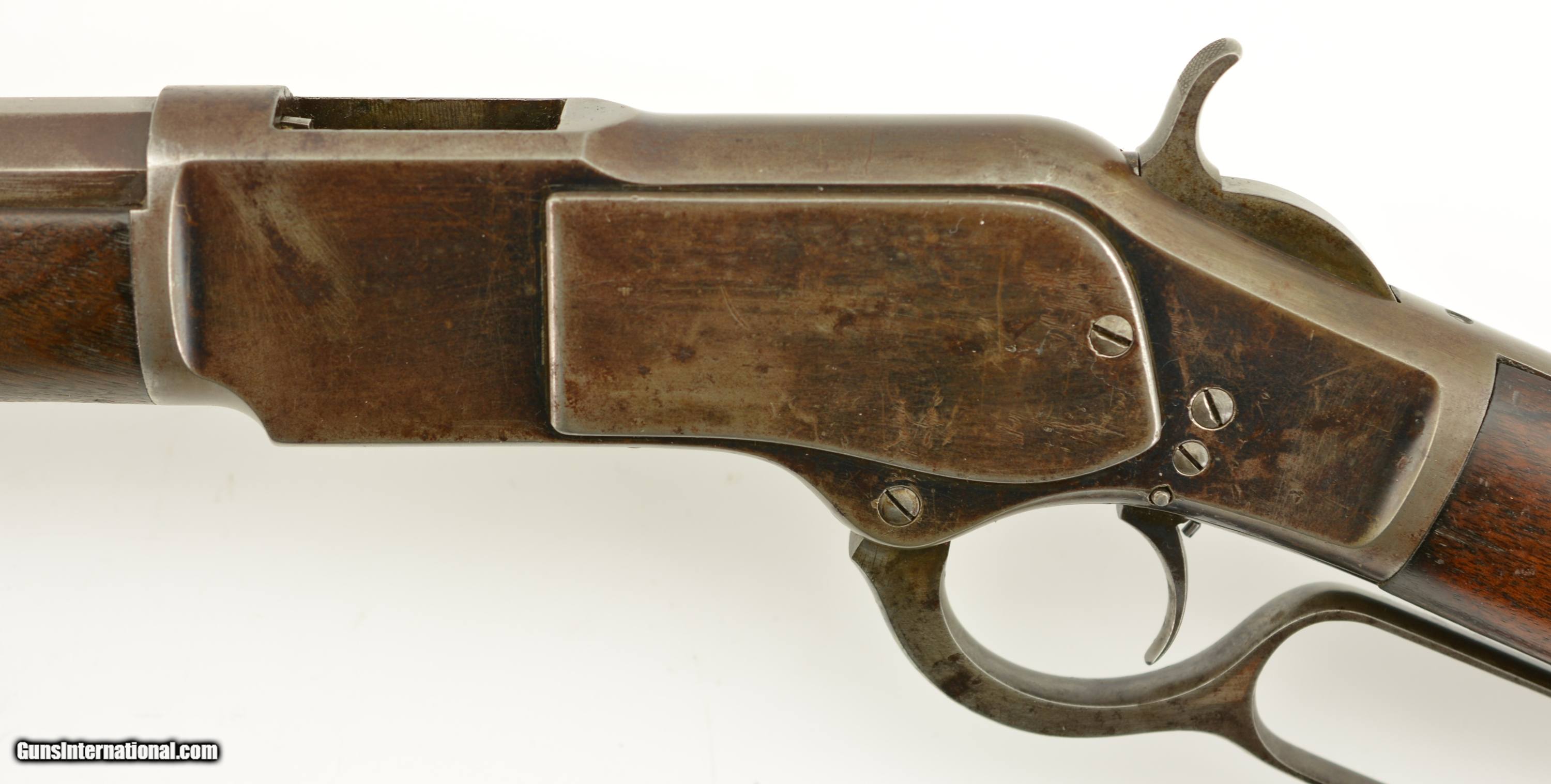 Description: Serial #27908, .44 WCF (.44-40), 26" octagon barrel with a fine, bright bore that has some mild freckling within the grooves. This is an 1878-made rifle that has about 10-20% of the original blue finish, mostly on protected areas, with the balance having aged to a mellow plum-brown patina with gray fading along the high edges and projections. The correct, unmarked cartridge lifter has an overall yellow-ochre tarnish, and no dustcover was ever fitted to the receiver. The lever and hammer have a mottled gray-brown patina, and the action is tight, with virtually no play in the lever when unlocked. The rifle is equipped with a factory single-set trigger which breaks cleanly and crisply. The smooth walnut forend and buttstock have numerous small handling marks and bruises throughout the original oil finish. The crescent buttplate has an overall mottled gray-brown patina with areas of brown oxidation at the toe and heel, and the stock compartment is empty. The rifle is further equipped with a period bone sliver front sight blade, and an original buckhorn rear sight that has been milled flat along the sides. The accompanying 2022-dated Cody Firearms Data Sheet specifies that the rifle was received in the warehouse on January 26, 1878, and shipped out on April 2 of the same year. Little is known about these open-top Model 1873s, but all known examples are found within the 27200 & 27999 serial number range. This is a very good-fine example of a highly desirable Model 1873 Winchester variant, and would make a great addition to any collection. Antique SOLD Antique: Yes |