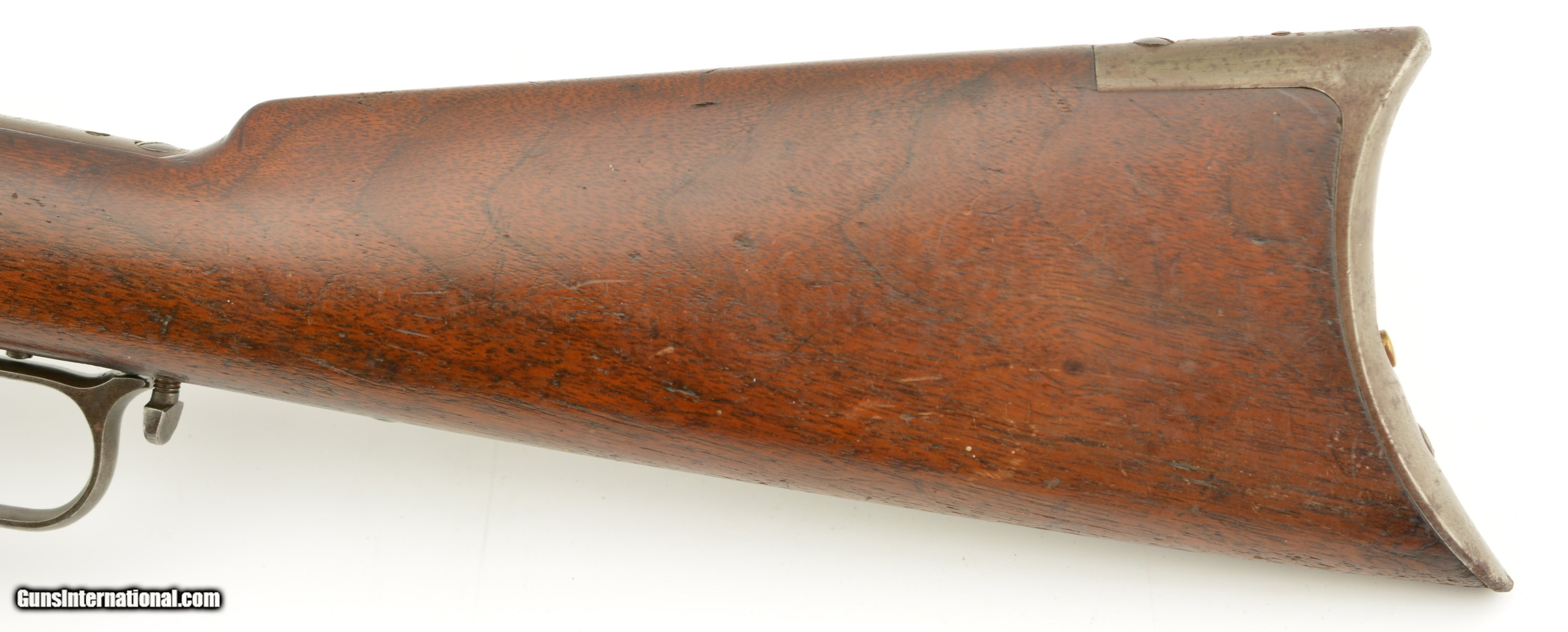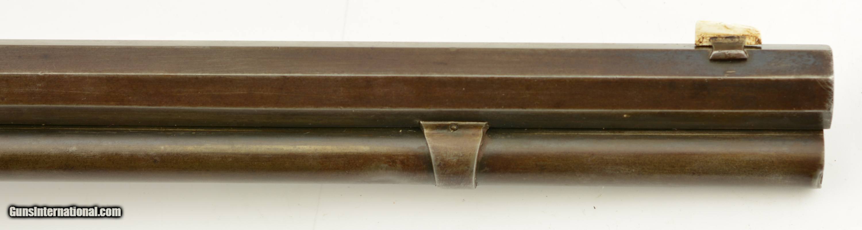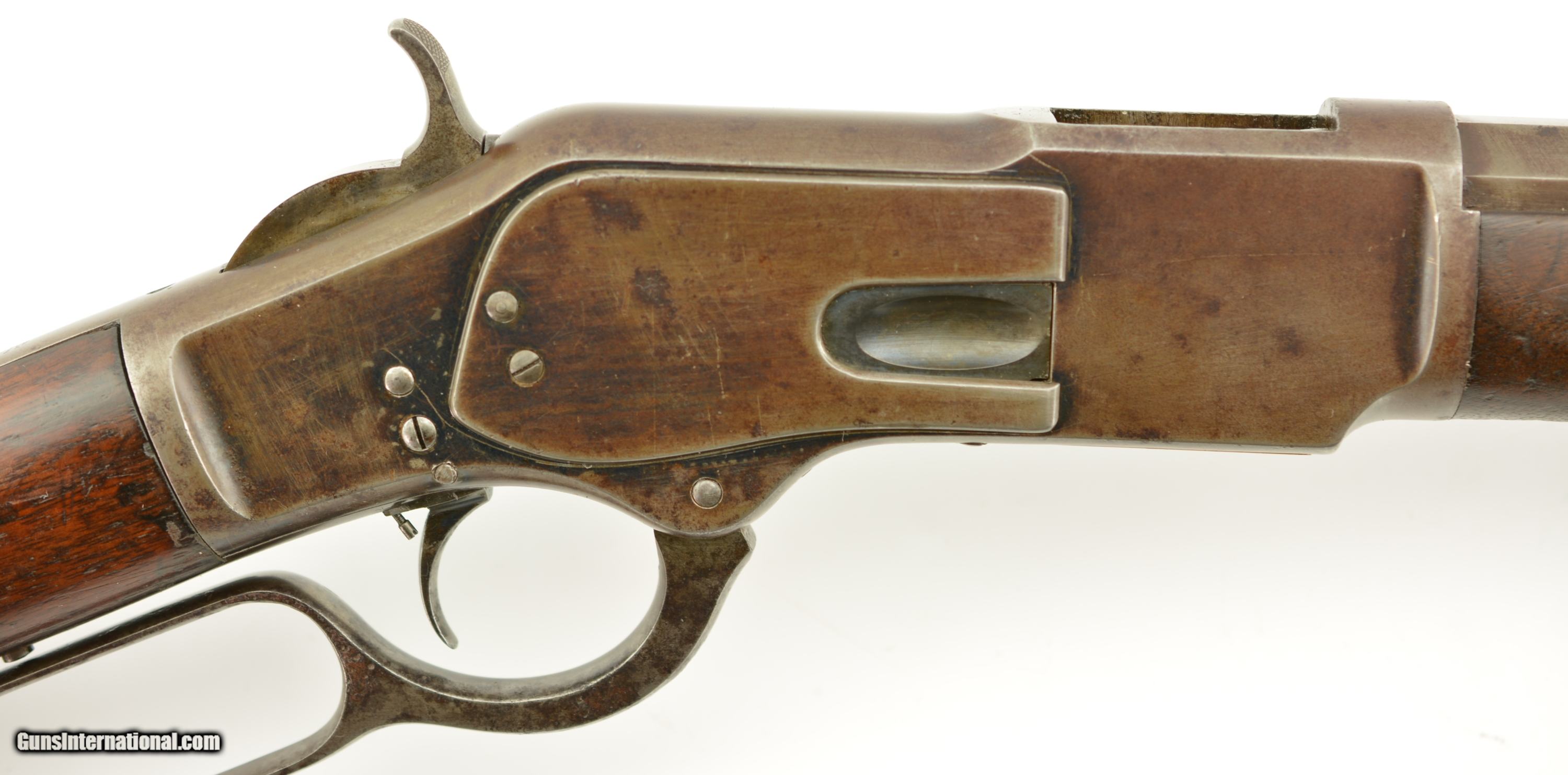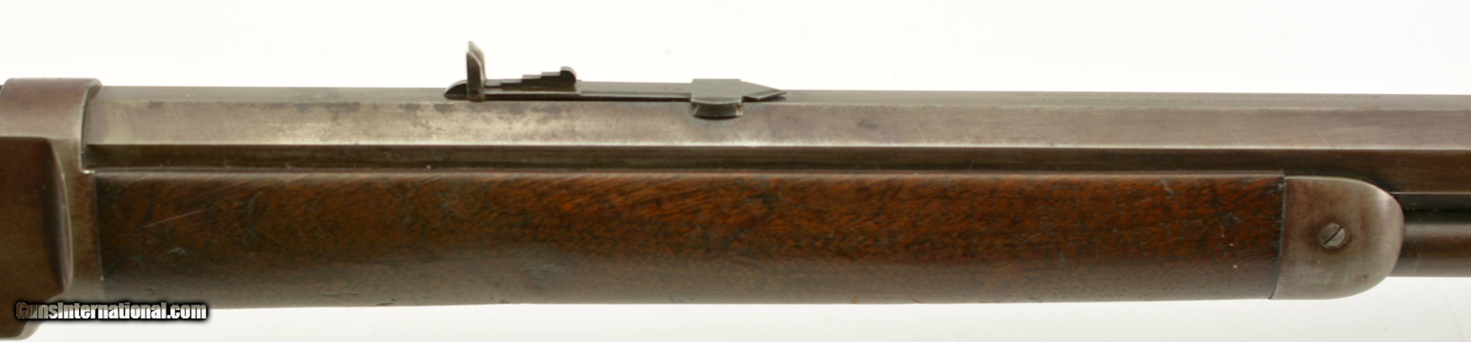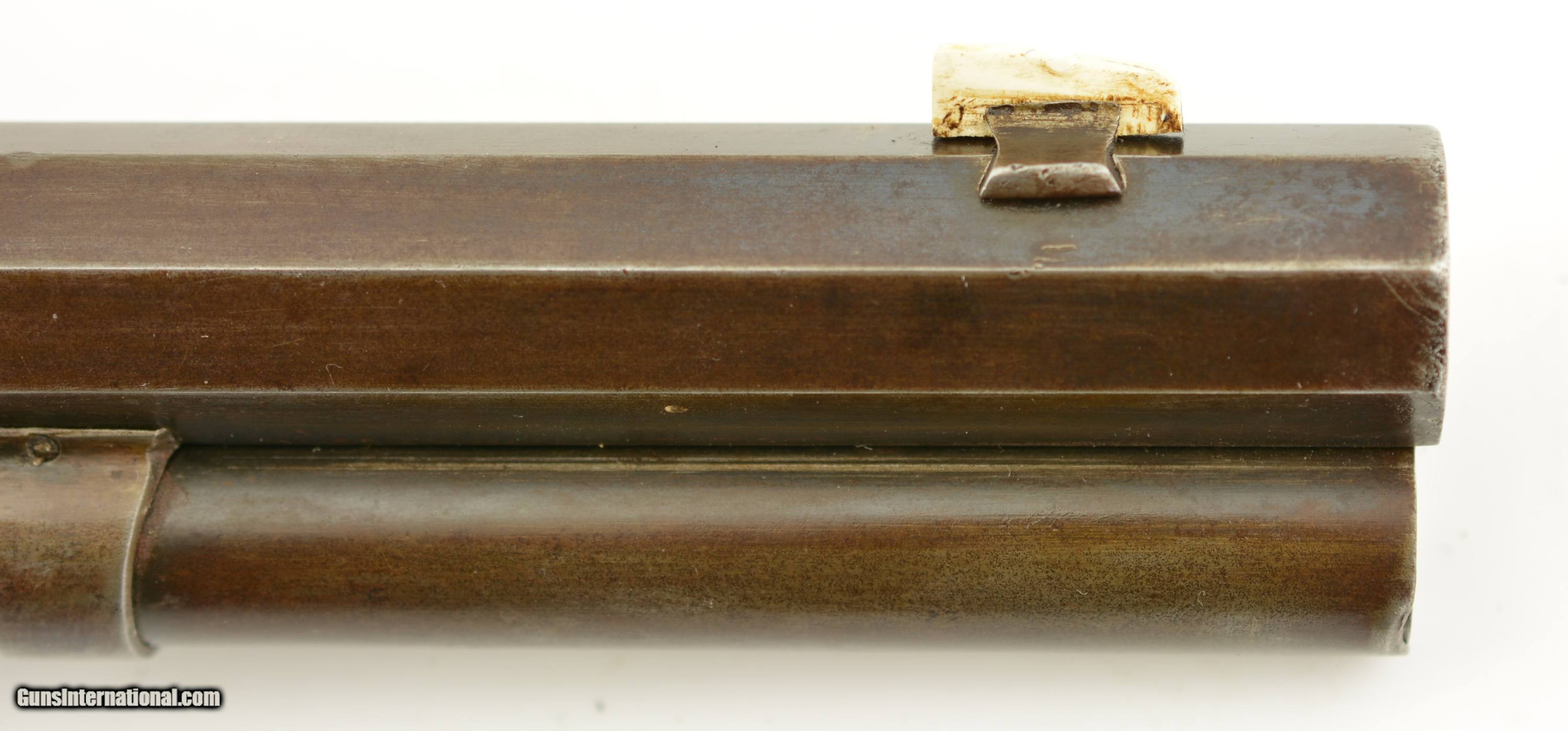 Description: Serial #27908, .44 WCF (.44-40), 26" octagon barrel with a fine, bright bore that has some mild freckling within the grooves. This is an 1878-made rifle that has about 10-20% of the original blue finish, mostly on protected areas, with the balance having aged to a mellow plum-brown patina with gray fading along the high edges and projections. The correct, unmarked cartridge lifter has an overall yellow-ochre tarnish, and no dustcover was ever fitted to the receiver. The lever and hammer have a mottled gray-brown patina, and the action is tight, with virtually no play in the lever when unlocked. The rifle is equipped with a factory single-set trigger which breaks cleanly and crisply. The smooth walnut forend and buttstock have numerous small handling marks and bruises throughout the original oil finish. The crescent buttplate has an overall mottled gray-brown patina with areas of brown oxidation at the toe and heel, and the stock compartment is empty. The rifle is further equipped with a period bone sliver front sight blade, and an original buckhorn rear sight that has been milled flat along the sides. The accompanying 2022-dated Cody Firearms Data Sheet specifies that the rifle was received in the warehouse on January 26, 1878, and shipped out on April 2 of the same year. Little is known about these open-top Model 1873s, but all known examples are found within the 27200 & 27999 serial number range. This is a very good-fine example of a highly desirable Model 1873 Winchester variant, and would make a great addition to any collection. Antique SOLD Antique: Yes |