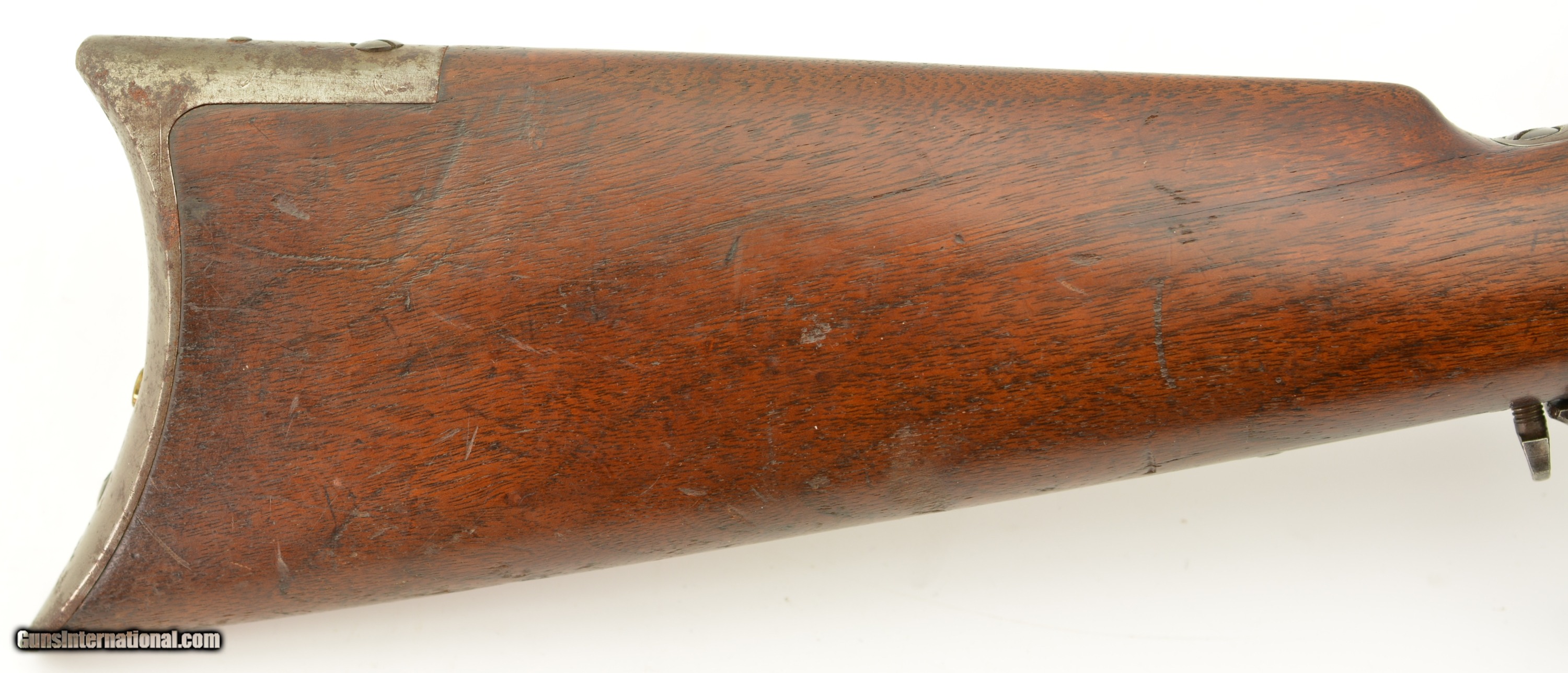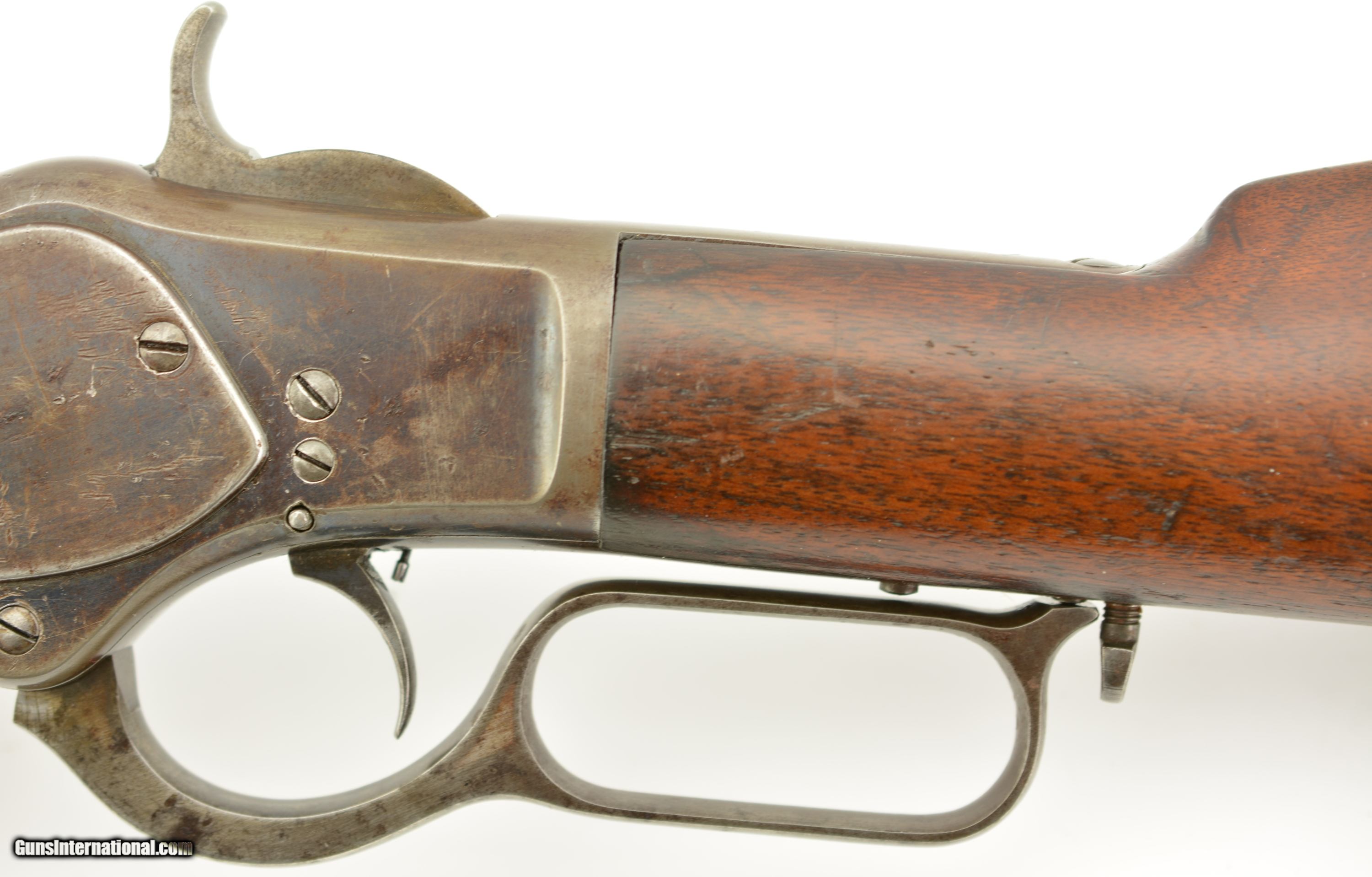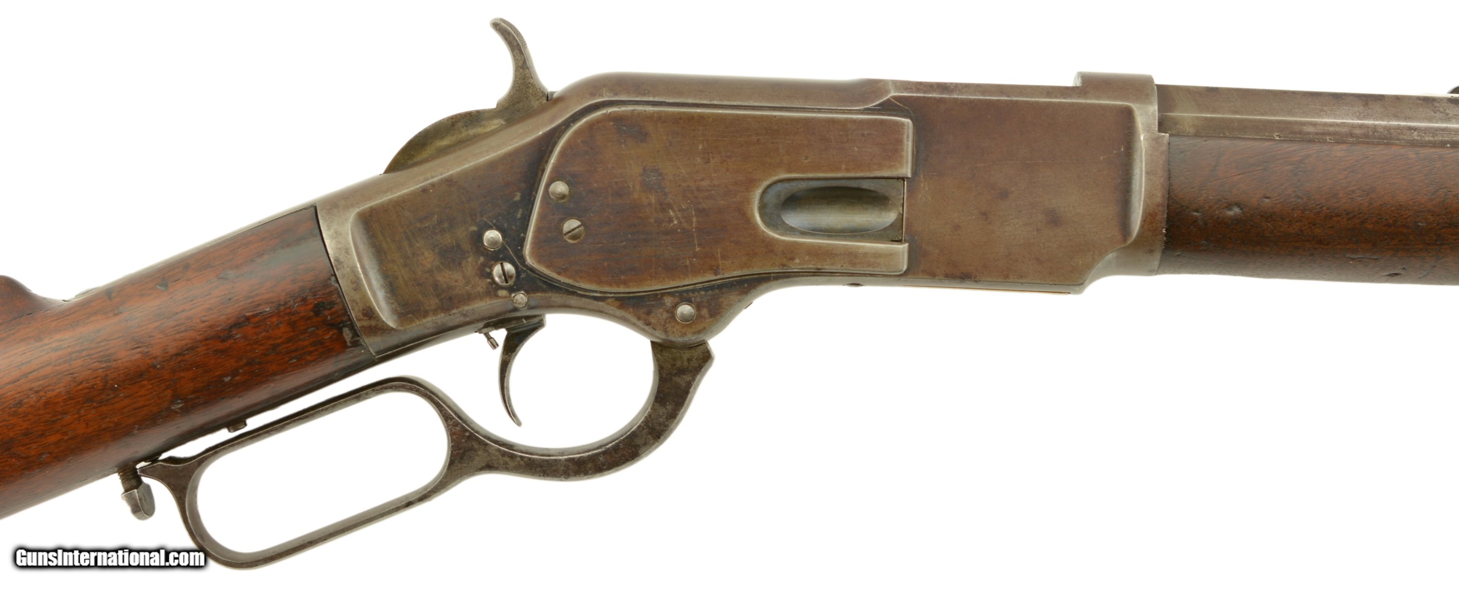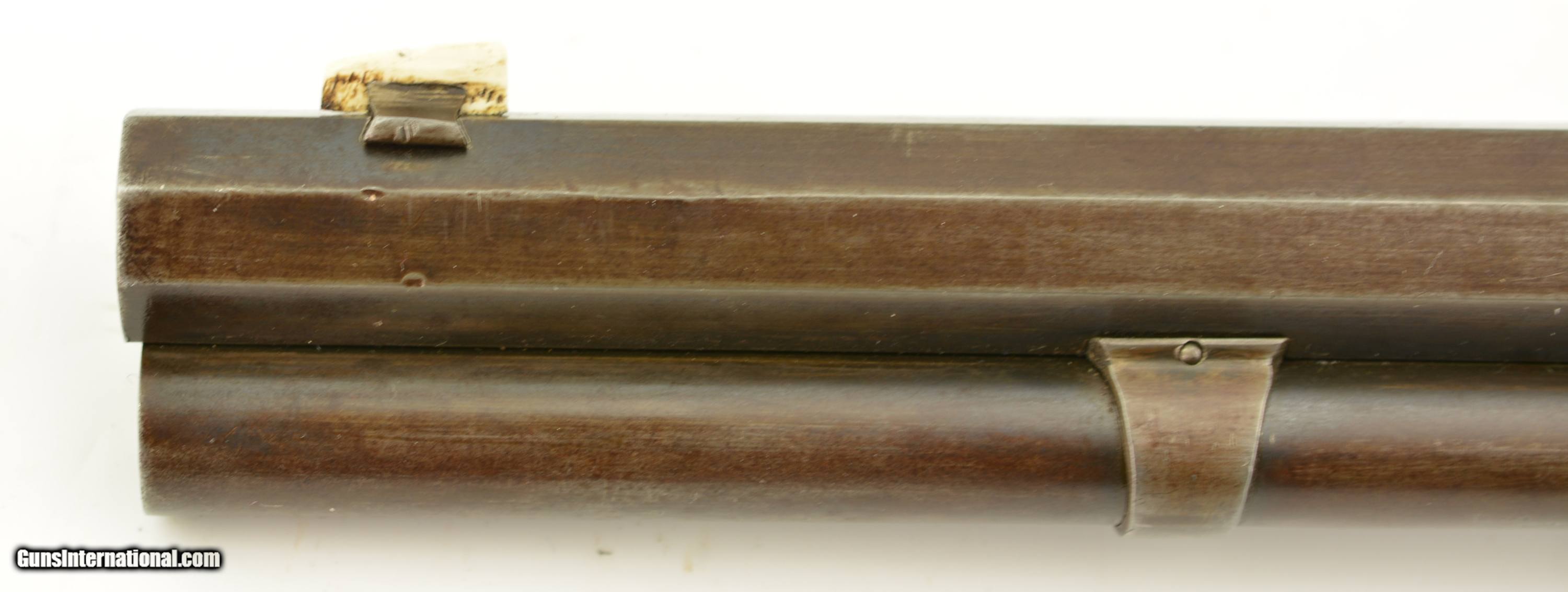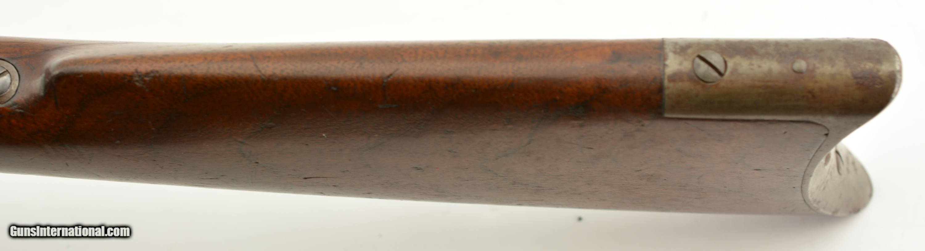 Description: Serial #27908, .44 WCF (.44-40), 26" octagon barrel with a fine, bright bore that has some mild freckling within the grooves. This is an 1878-made rifle that has about 10-20% of the original blue finish, mostly on protected areas, with the balance having aged to a mellow plum-brown patina with gray fading along the high edges and projections. The correct, unmarked cartridge lifter has an overall yellow-ochre tarnish, and no dustcover was ever fitted to the receiver. The lever and hammer have a mottled gray-brown patina, and the action is tight, with virtually no play in the lever when unlocked. The rifle is equipped with a factory single-set trigger which breaks cleanly and crisply. The smooth walnut forend and buttstock have numerous small handling marks and bruises throughout the original oil finish. The crescent buttplate has an overall mottled gray-brown patina with areas of brown oxidation at the toe and heel, and the stock compartment is empty. The rifle is further equipped with a period bone sliver front sight blade, and an original buckhorn rear sight that has been milled flat along the sides. The accompanying 2022-dated Cody Firearms Data Sheet specifies that the rifle was received in the warehouse on January 26, 1878, and shipped out on April 2 of the same year. Little is known about these open-top Model 1873s, but all known examples are found within the 27200 & 27999 serial number range. This is a very good-fine example of a highly desirable Model 1873 Winchester variant, and would make a great addition to any collection. Antique SOLD Antique: Yes |
