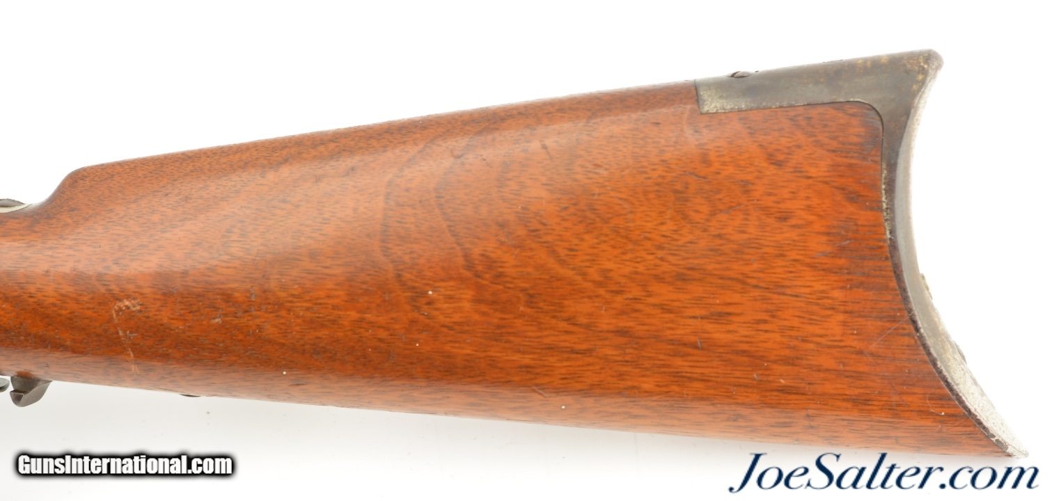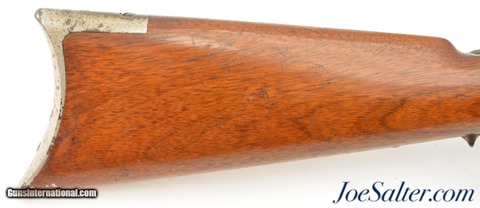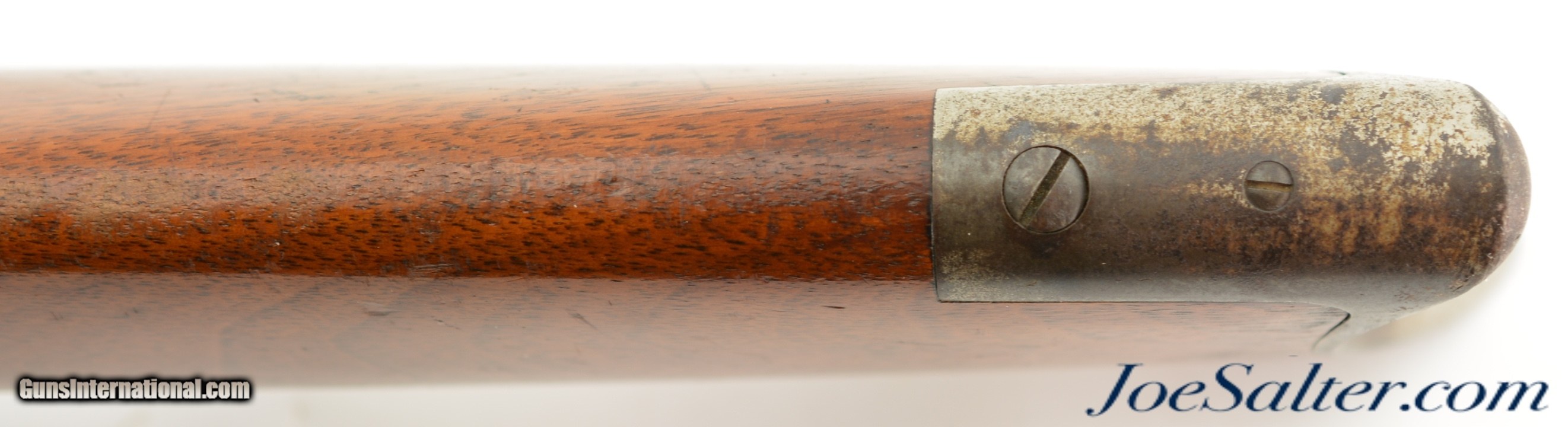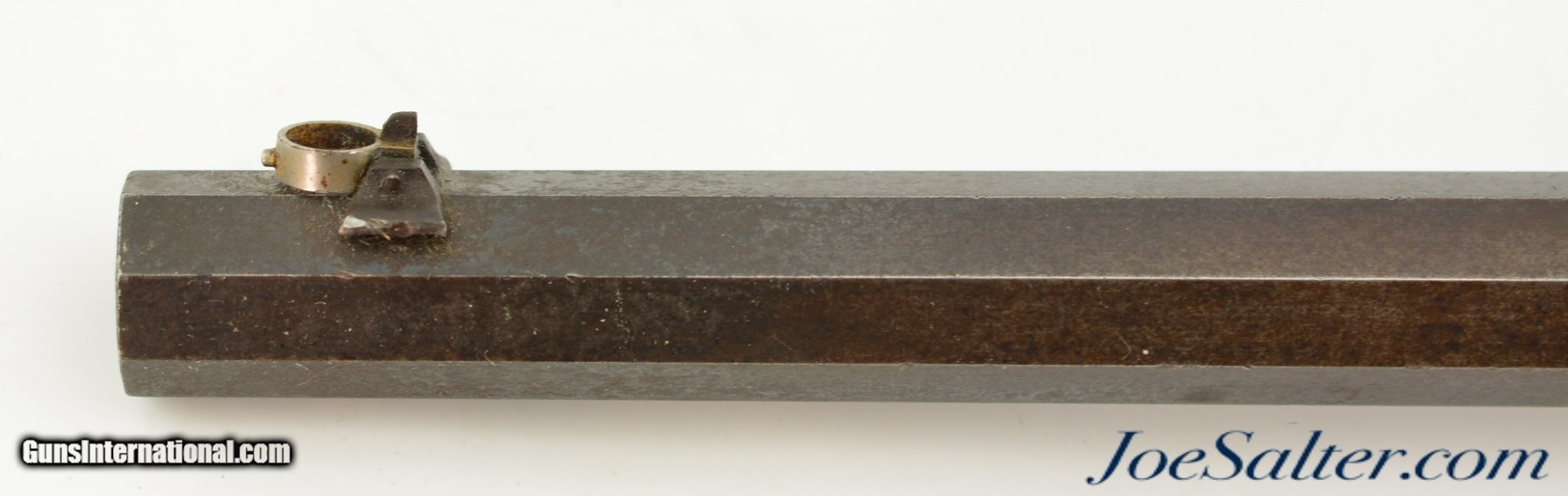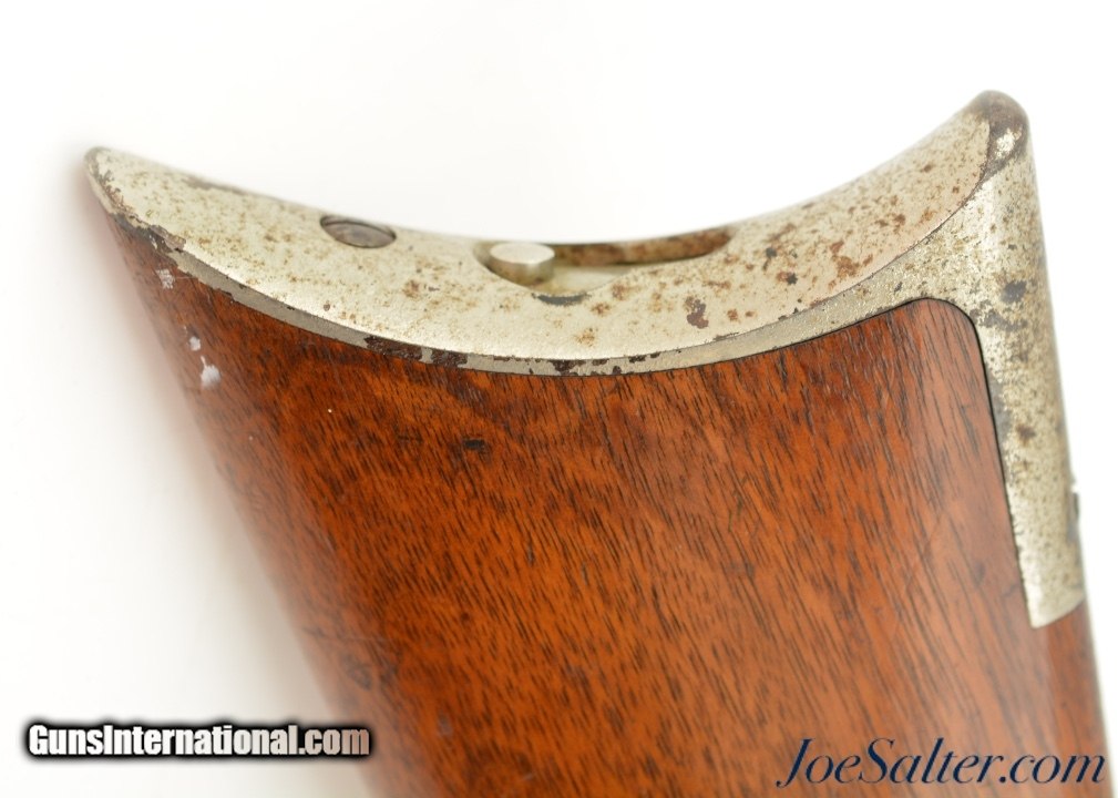 Description: Serial #66558, .38 WCF (.38-40), 24" octagon barrel with a fine, bright bore that has some mild freckling within the grooves at the muzzle. This is a handsome rifle that originally left the factory warehouse on February 11, 1881, as a standard rifle with round barrel. Interestingly, it was returned to the Winchester factory the next year so that the following features could be added: octagon barrel, half-magazine, nickel plated trim, and peep and Beach sights; with a second shipment from the warehouse, in its new configuration, on December 12, 1882. The rifle remains in its second, factory-upgraded form, although the specified "peep" sight is no longer present. The barrel has an overall smooth plum-brown patina, with some traces of original blue remaining on protected areas, and thin silvering along the edges of the barrel facets. The Beach front sight added by the factory is still installed, and is mated to an original Winchester rear barrel sight. The frame and forend cap have retained 60-70% of the nickel plated finish with the balance flaked to plum-brown in small spots throughout, and has larger brown areas at the carry point towards the front and underside of the frame. Muted color case-hardening can still be seen on the hammer, but the lever has turned a uniform plum-brown patina over time. The smooth walnut forend and straight-wrist stock have numerous small handling marks and small surface blemishes scattered throughout the original varnish, and the crescent steel buttplate has much of the Winchester nickel finish remaining, although there is wear to the underlying metal on the left side, consistent with longtime use by a right-handed shooter. Also included is a 2024-dated Cody Data Sheet that confirms the shipment dates and configuration of the upgraded rifle. Factory-returned and upgraded rifles are very seldom seen, and this example is in very good condition overall. Antique SOLD |