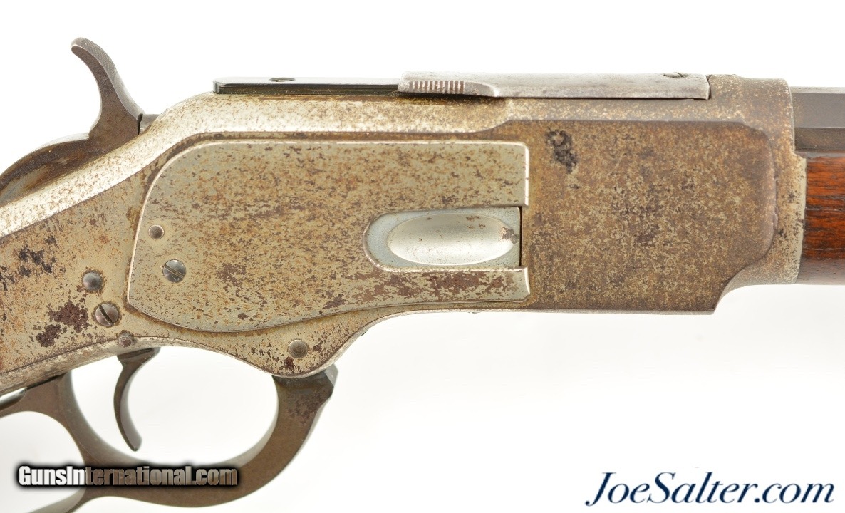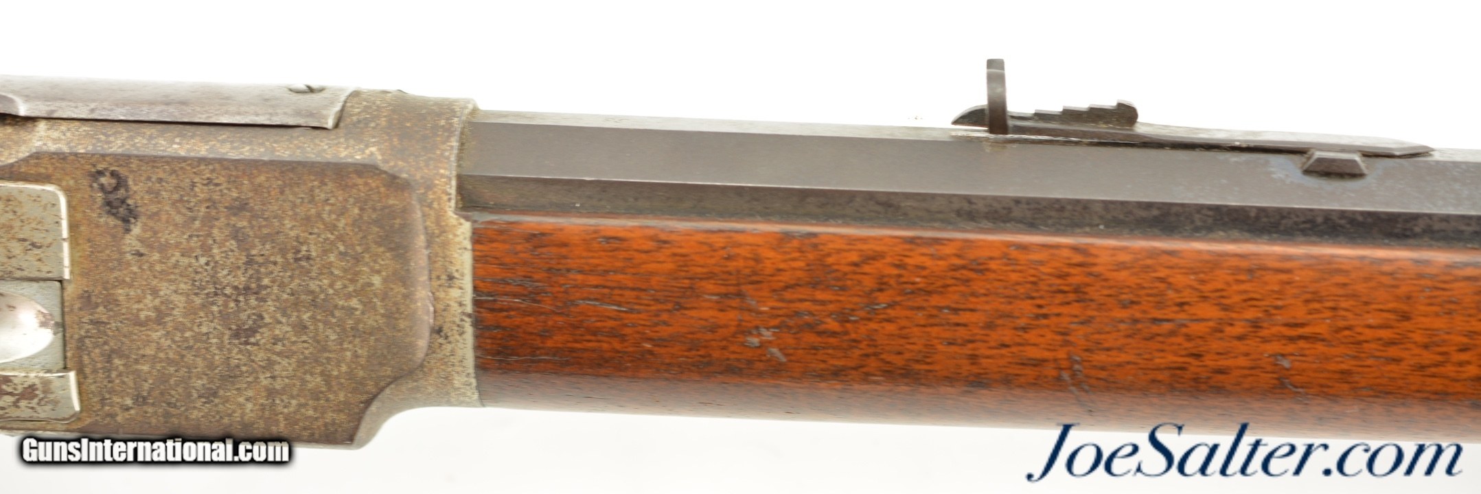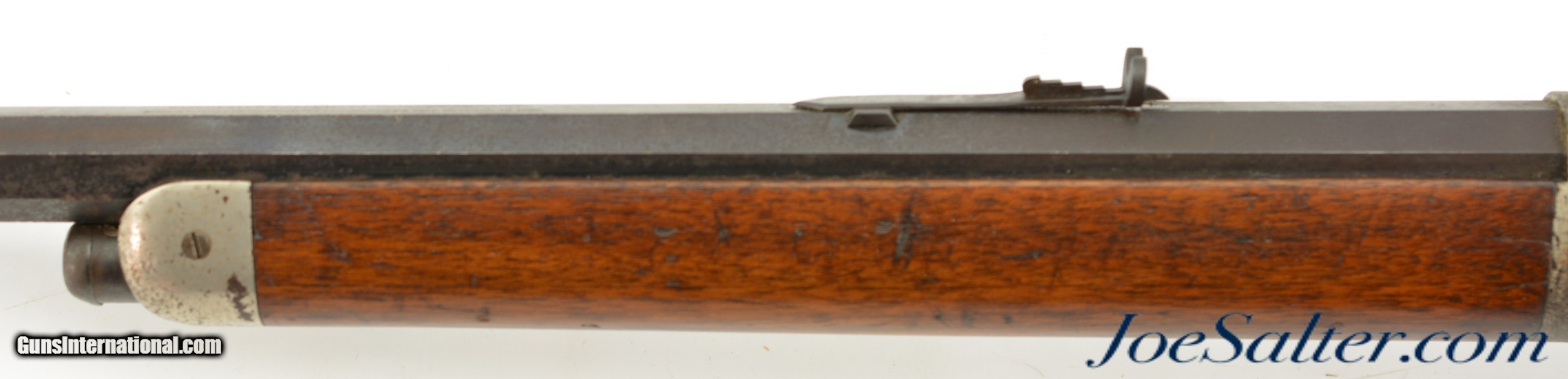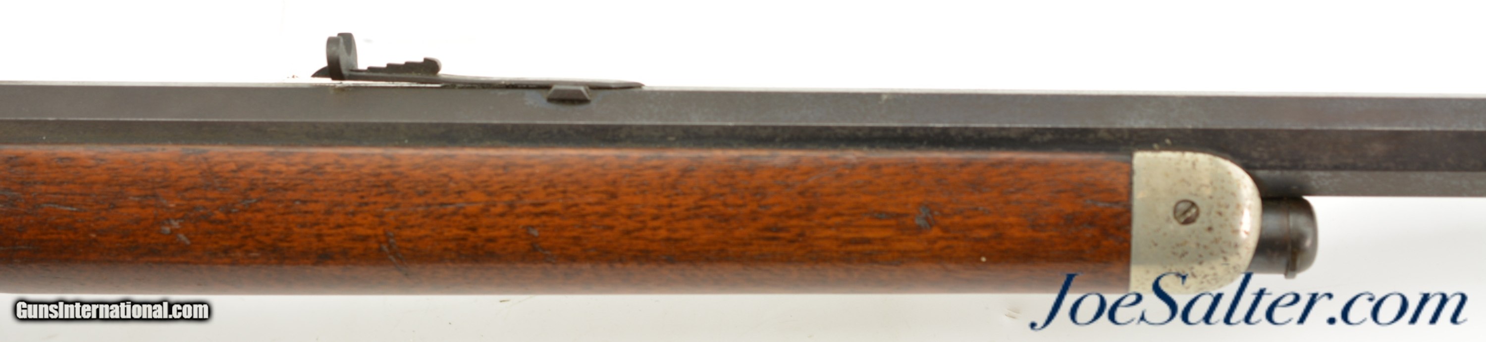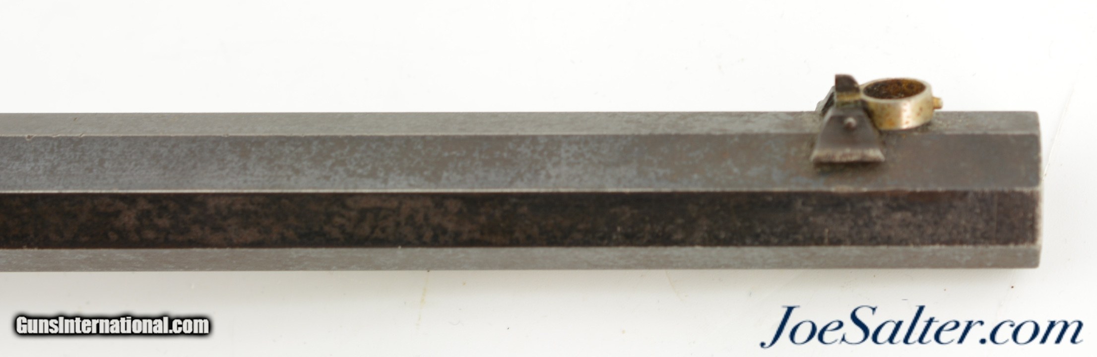 Description: Serial #66558, .38 WCF (.38-40), 24" octagon barrel with a fine, bright bore that has some mild freckling within the grooves at the muzzle. This is a handsome rifle that originally left the factory warehouse on February 11, 1881, as a standard rifle with round barrel. Interestingly, it was returned to the Winchester factory the next year so that the following features could be added: octagon barrel, half-magazine, nickel plated trim, and peep and Beach sights; with a second shipment from the warehouse, in its new configuration, on December 12, 1882. The rifle remains in its second, factory-upgraded form, although the specified "peep" sight is no longer present. The barrel has an overall smooth plum-brown patina, with some traces of original blue remaining on protected areas, and thin silvering along the edges of the barrel facets. The Beach front sight added by the factory is still installed, and is mated to an original Winchester rear barrel sight. The frame and forend cap have retained 60-70% of the nickel plated finish with the balance flaked to plum-brown in small spots throughout, and has larger brown areas at the carry point towards the front and underside of the frame. Muted color case-hardening can still be seen on the hammer, but the lever has turned a uniform plum-brown patina over time. The smooth walnut forend and straight-wrist stock have numerous small handling marks and small surface blemishes scattered throughout the original varnish, and the crescent steel buttplate has much of the Winchester nickel finish remaining, although there is wear to the underlying metal on the left side, consistent with longtime use by a right-handed shooter. Also included is a 2024-dated Cody Data Sheet that confirms the shipment dates and configuration of the upgraded rifle. Factory-returned and upgraded rifles are very seldom seen, and this example is in very good condition overall. Antique SOLD |