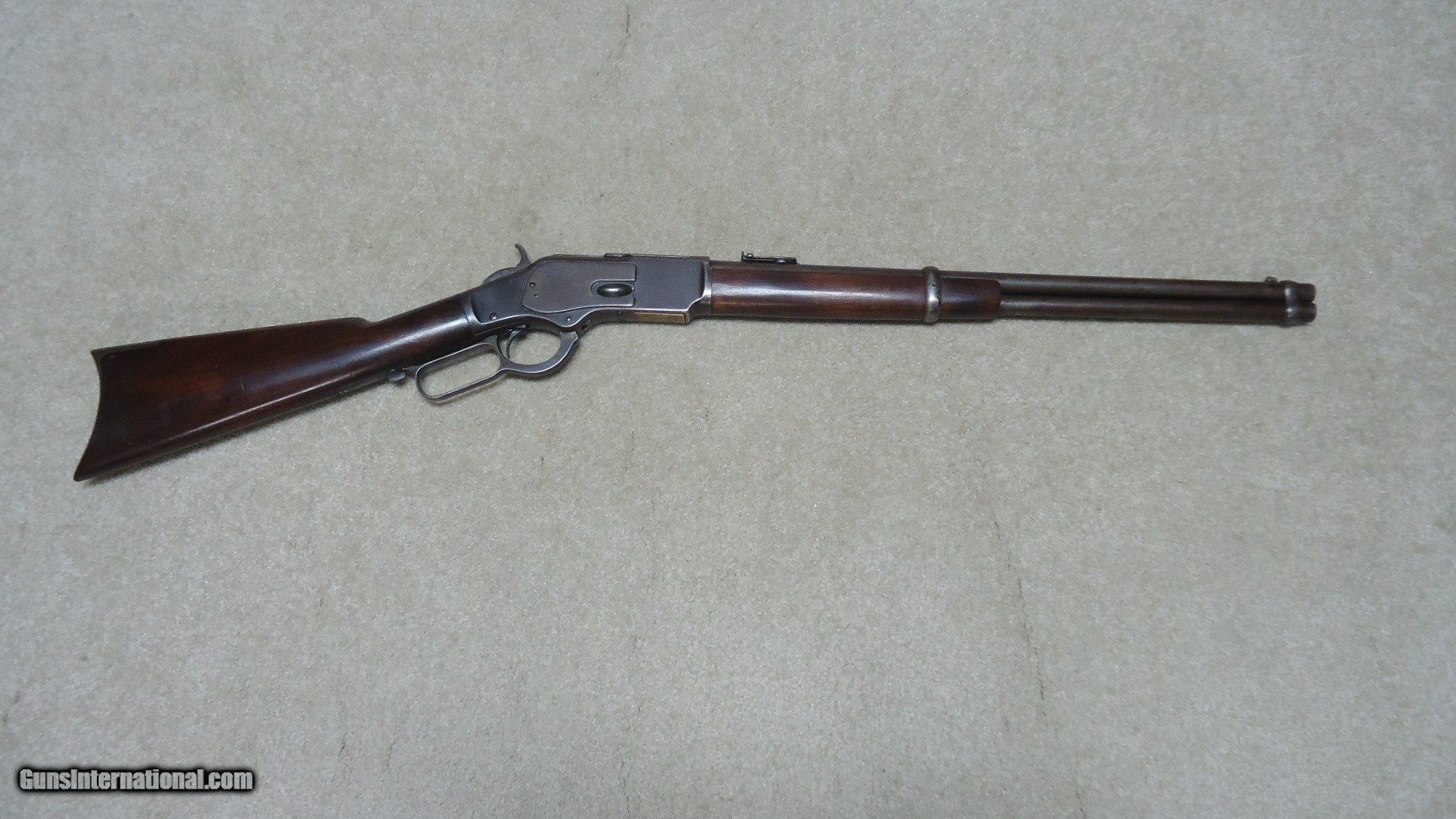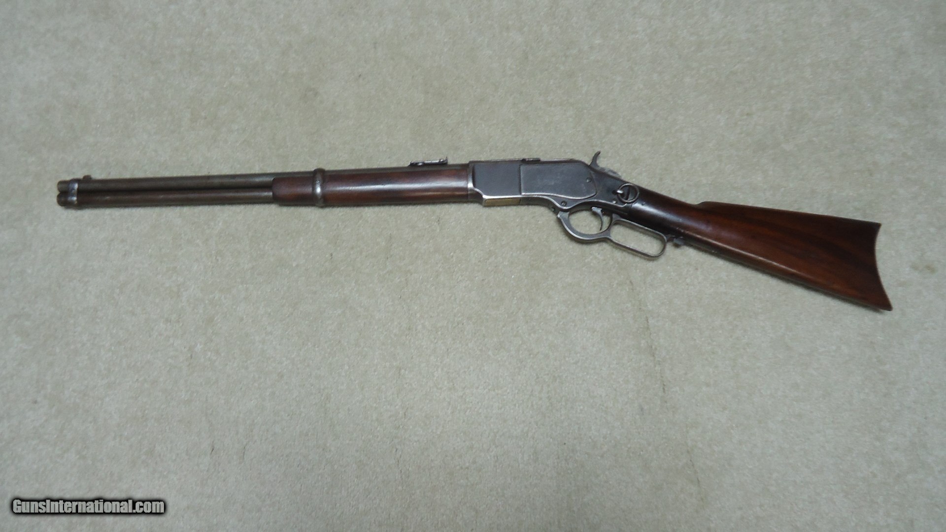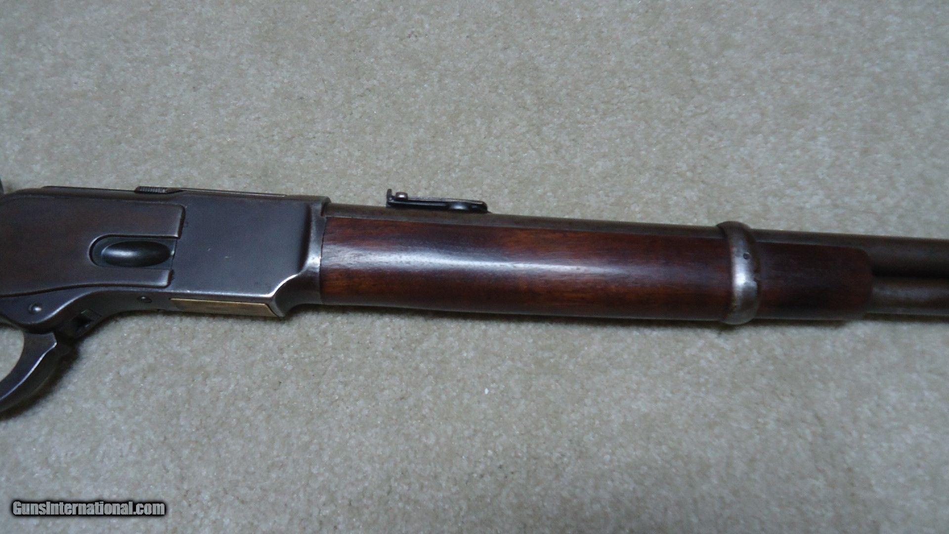 Description: RARE SPECIAL ORDER 1873 .44-40 SADDLE RING CARBINE THAT WILL LETTER WITH CRESCENT RIFLE STYLE BUTT (INSTEAD OF THE USUAL CARBINE BUTT) AND A SET TRIGGER, #284XXX, MADE 1888. Any special order features on Winchester carbines are seldom seen with those on the Model 1873 almost never encountered. Usually when someone wanted a curved, rifle style butt they just ordered a 20” short rifle instead of a carbine. Similarly, set triggers are usually found on rifles and not carbines. According to The Winchester Handbook by George Madis, only 1286 Model 1873s had “special butt plates.” I would assume nearly all of these were shotgun butt plates on rifles. If 90% involved rifles, which is probably a close figure, that leaves 10% or roughly 130 carbines with special butt plates. If even half of these were shotgun butt plates on carbines (I’ve seen more of those on carbines than crescent rifle butt plates) that would mean that 65 Model 1873 carbines were factory fitted with rifle butt plates! Even triple that number and it is still very small. That puts the rarity factor into perspective. This example shows good aged blue on the receiver with some brown mixing. Nice blue on the loading gate, dust cover intact as is the saddle ring. Barrel and magazine mostly an uncleaned gray/brown with “1873” dated ladder rear sight with slide intact. All barrel markings are sharp and clear. Generally excellent stock and forend with good wood to metal fit. Tight action with only the half-cock a bit weak. Mellow brass lifter. The bore is surprisingly fine+ with only some very light surface roughness mainly toward the middle of the bore. The set trigger is intact with adjustment screw, but will not set- works fine unset. Has the trap in the butt plate for cleaning rods. A Cody Museum call-in sheet accompanies this carbine and it is guaranteed to letter. A really rare 1873 SRC! SOLD Antique: Yes Manufacturer: Winchester Model: 1873 SRC Serial Number: 284XXX Barrel Length: 20 Caliber Info: .44-40 Condition: FINE |