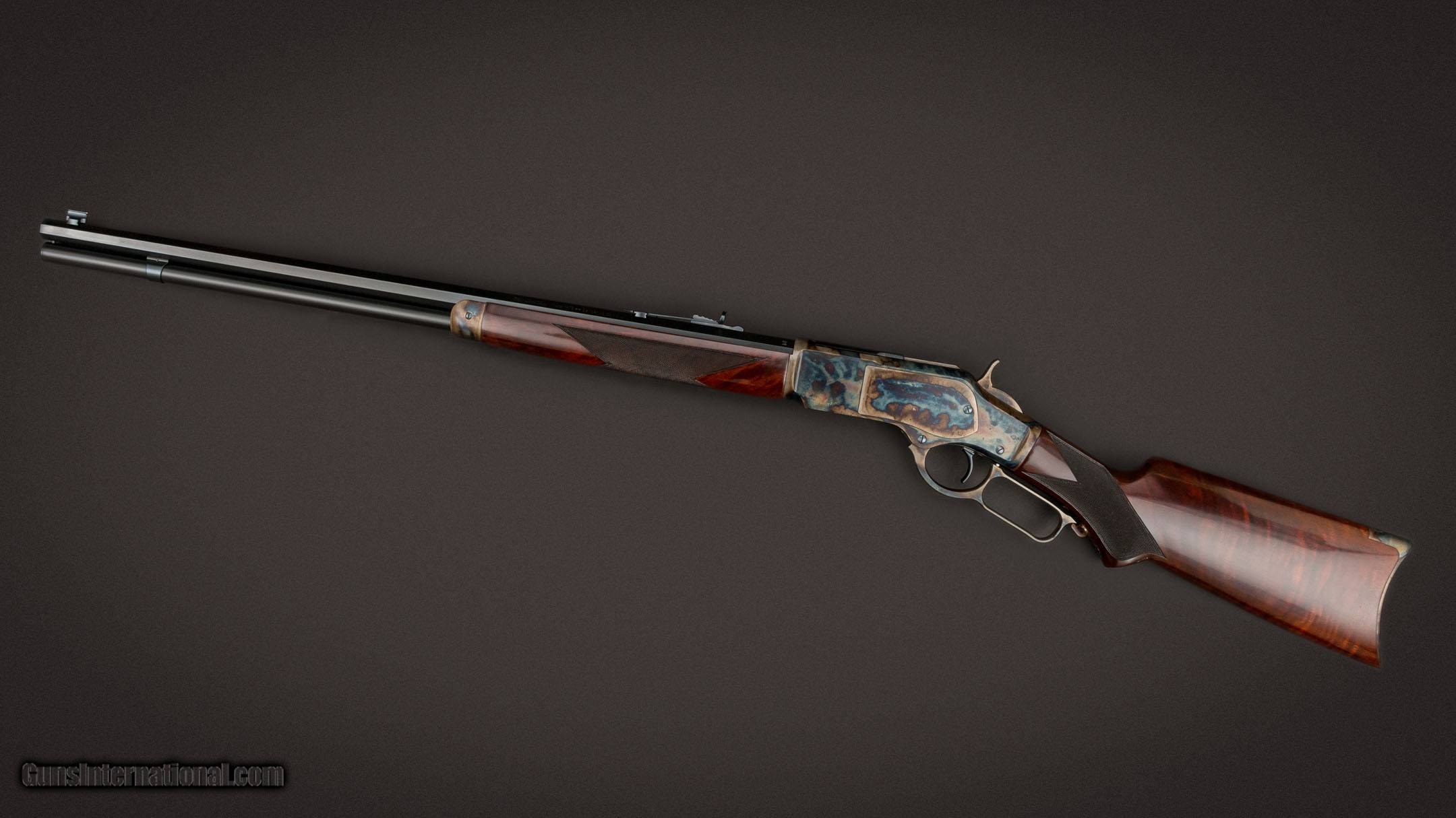 Description: Known around the world as “The Gun that Won the West,” Winchester’s Model 1873 is certainly among the icons. Turnbull Restoration is famous for its dedication to timeless classics, and we’re proud to offer our version of Winchester’s legendary lever action rifle. This special configuration is only available through Turnbull Restoration. Starting with a factory-new Winchester 1873 Sporter Octagon Pistol Grip model, we apply our signature color case hardening process to the receiver, lever, hammer, butt plate and forend cap. The 24″ barrel and magazine tube are rust blued, while small parts are charcoal blued. In addition, we refinish the factory-checkered stocks in a hand-rubbed oil finish to match Winchester’s classic red shading. The receiver top tang is drilled and tapped for an optional tang-mounted rear sight. Our Model 1873 is offered in .44-40 Win or .45 Colt. Cowboy Action Shooters love the fact that the rifle fires the same ammunition as their revolvers. In addition, competitors love the ultra-smooth lever action. Contact us for more information and additional photographs. SOLD Rifle Caliber: .45 Colt Manufacturer: Winchester Model: 1873 Serial Number: JP00009YY73P Barrel Length: 24 Condition: New Barrel Type: Full Octagon Action: Lever Stock Dimensions: 3" x 1-3/4" x 13 Butt Pad: Crescent Finish: Restoration-grade metal and wood finishes by Turnbull Weight: 8 lbs 0 oz Sights: Marbles gold bead front, Semi-buckhorn rear Item Location: Upstate New York - Finger Lakes Region |